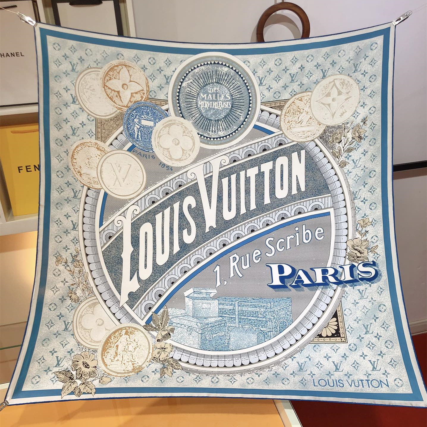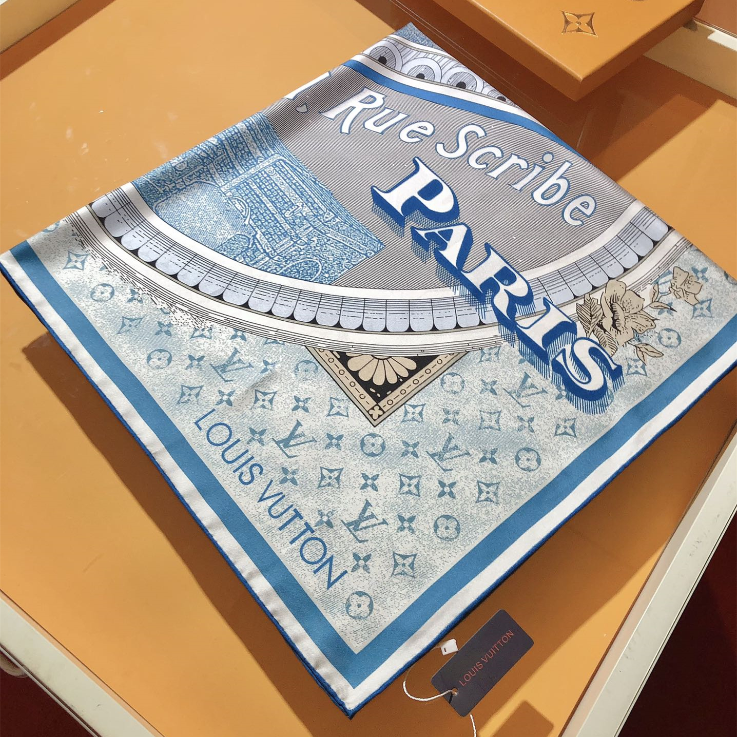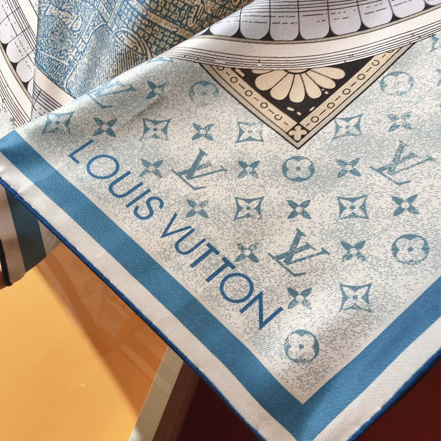 【Elegance and Craftsmanship】 This new LV scarf is a tribute to the brand's history, inspired by late 19th-century advertisement posters. It features a Monogram background with hard-case and travel sticker patterns.