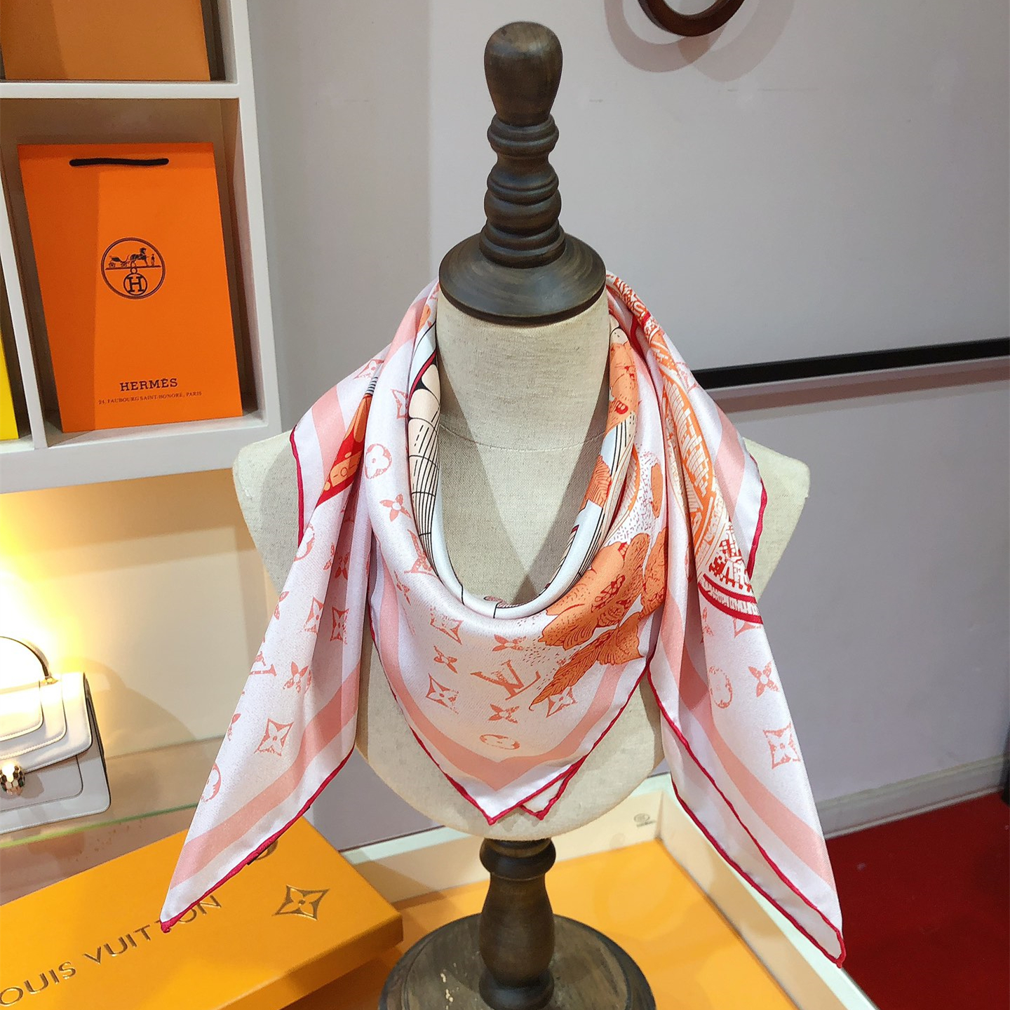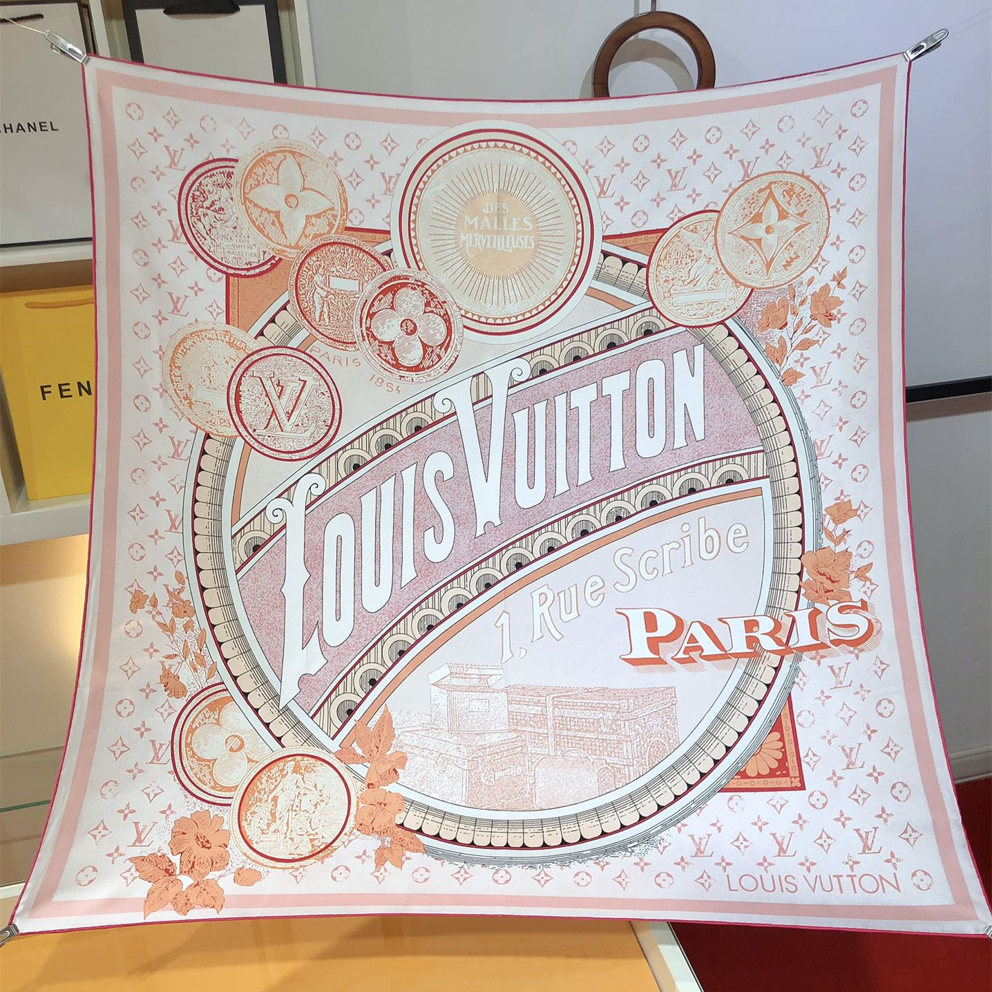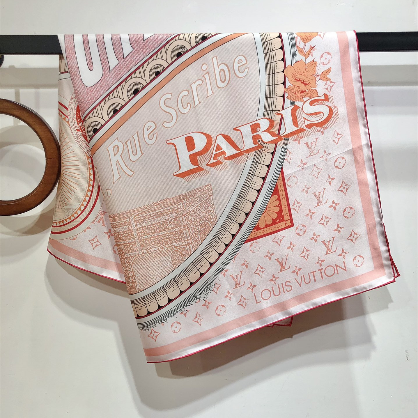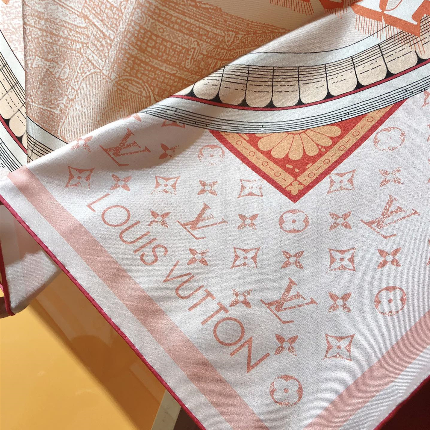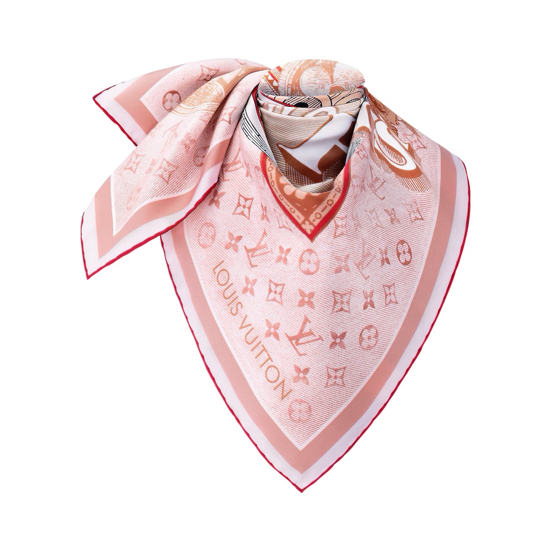【Elegance and Craftsmanship】 This new LV scarf is a tribute to the brand's history, inspired by late 19th-century advertisement posters. It features a Monogram background with hard-case and travel sticker patterns.