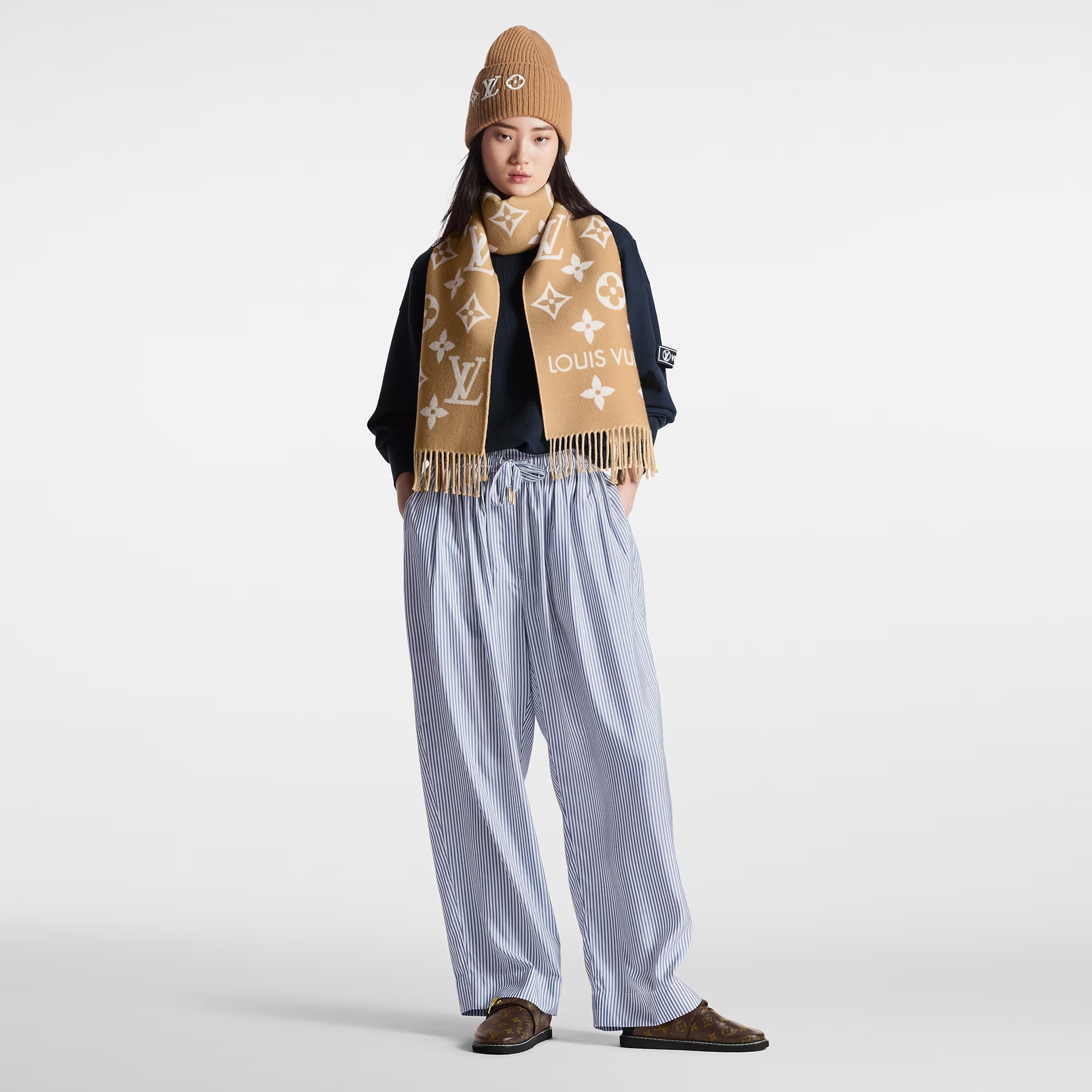 The LV ESSENTIAL scarf lengthens the distance between the elements of the classic Monogram pattern, presenting a refreshing look. The sheep wool brings a soft and warm texture, and the Louis Vuitton logo and fringe trims complete the whole, adding a casual choice to the Reykjavik scarf and Logomania scarf.