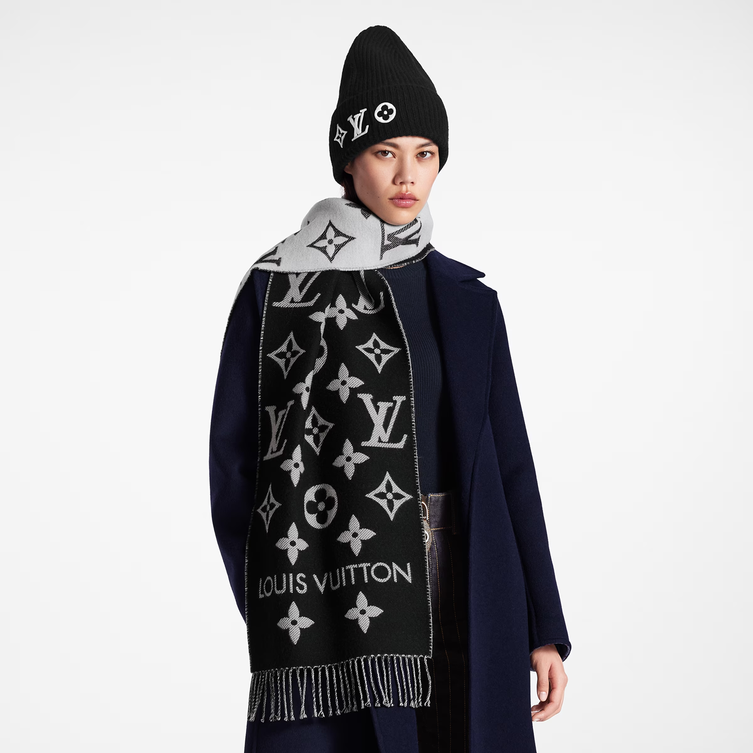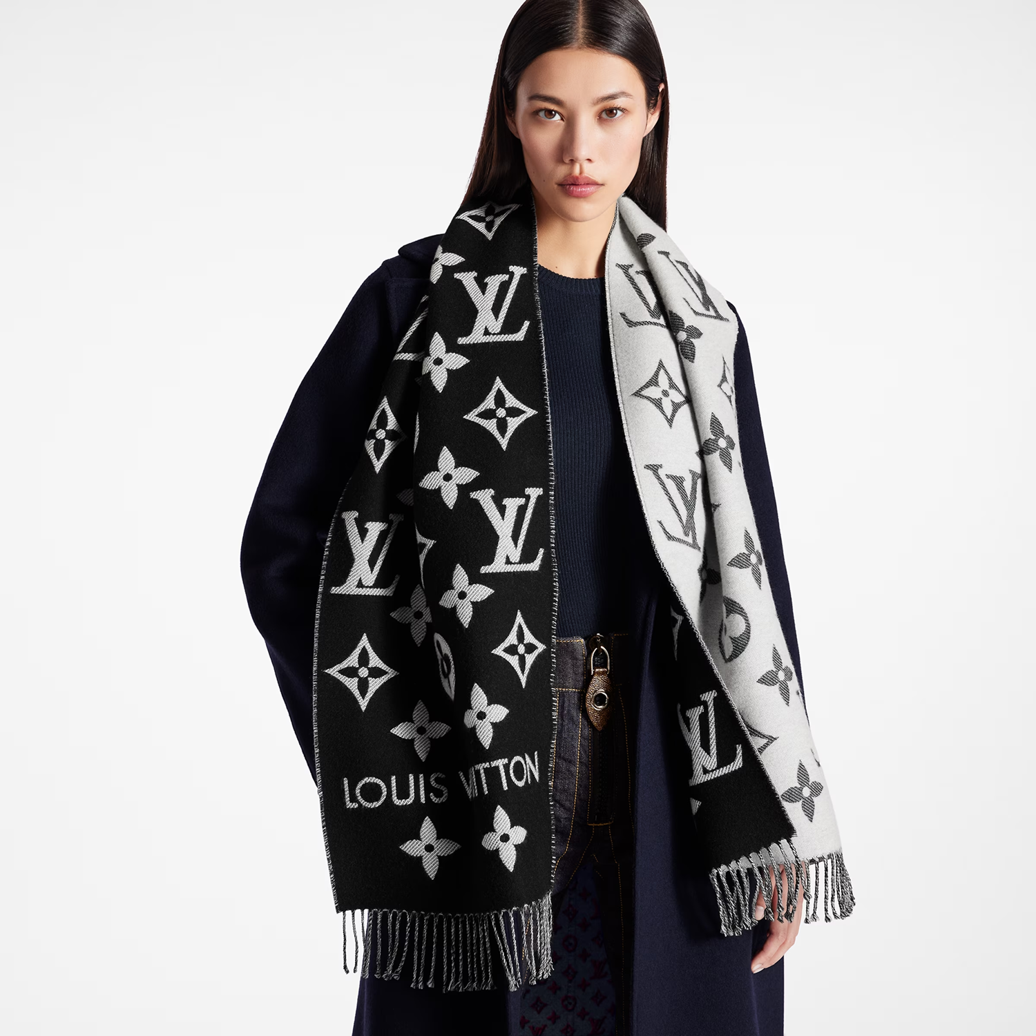 The LV ESSENTIAL scarf lengthens the distance between the elements of the classic Monogram pattern, presenting a refreshing look. The sheep wool brings a soft and warm texture, and the Louis Vuitton logo and fringe trims complete the whole, adding a casual choice to the Reykjavik scarf and Logomania scarf.
