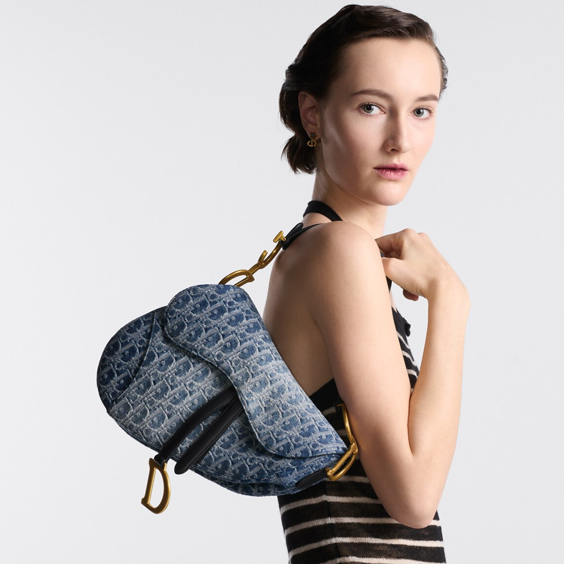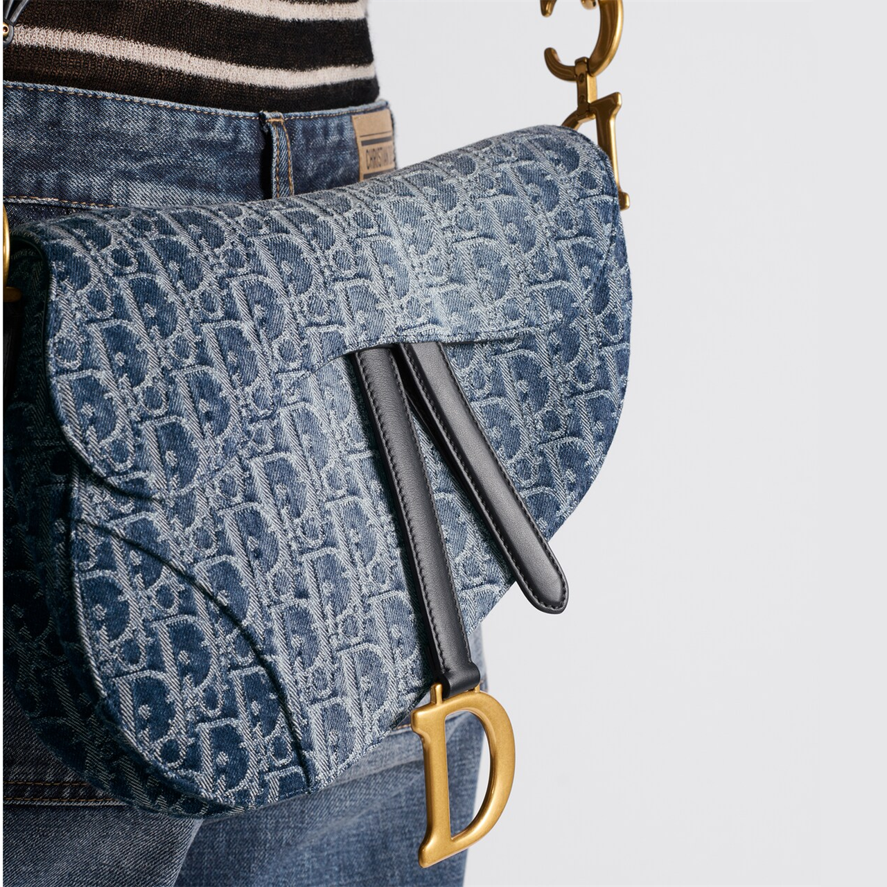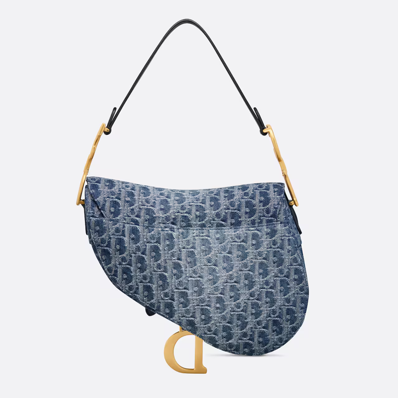 This Saddle Bag highlights Maria Grazia Chiuri's cleverly updated design. Crafted in blue Denim Dior Oblique jacquard fabric, the classic Dior pattern is reinterpreted with an irregular stonewash effect, showing modern charm. The saddle flap is paired with a strap embellished with a stirrup D-shaped charm and a magnetic drawstring, highlighting the classic design, and the metal CD logo with antique gold finish is embellished on both sides of the handle. With an adjustable and removable spaghetti strap, it can be carried by hand, on the shoulder or crossbody.
