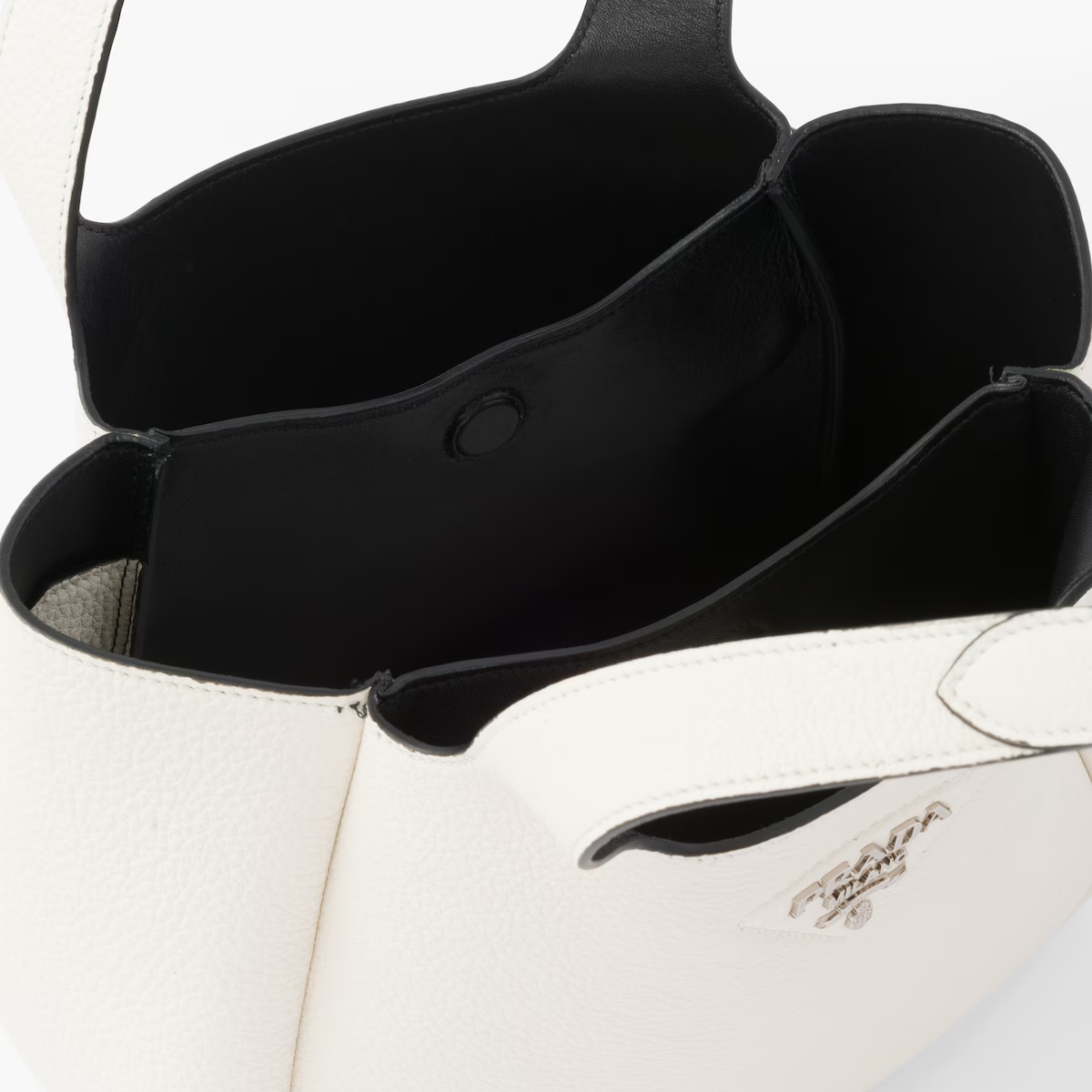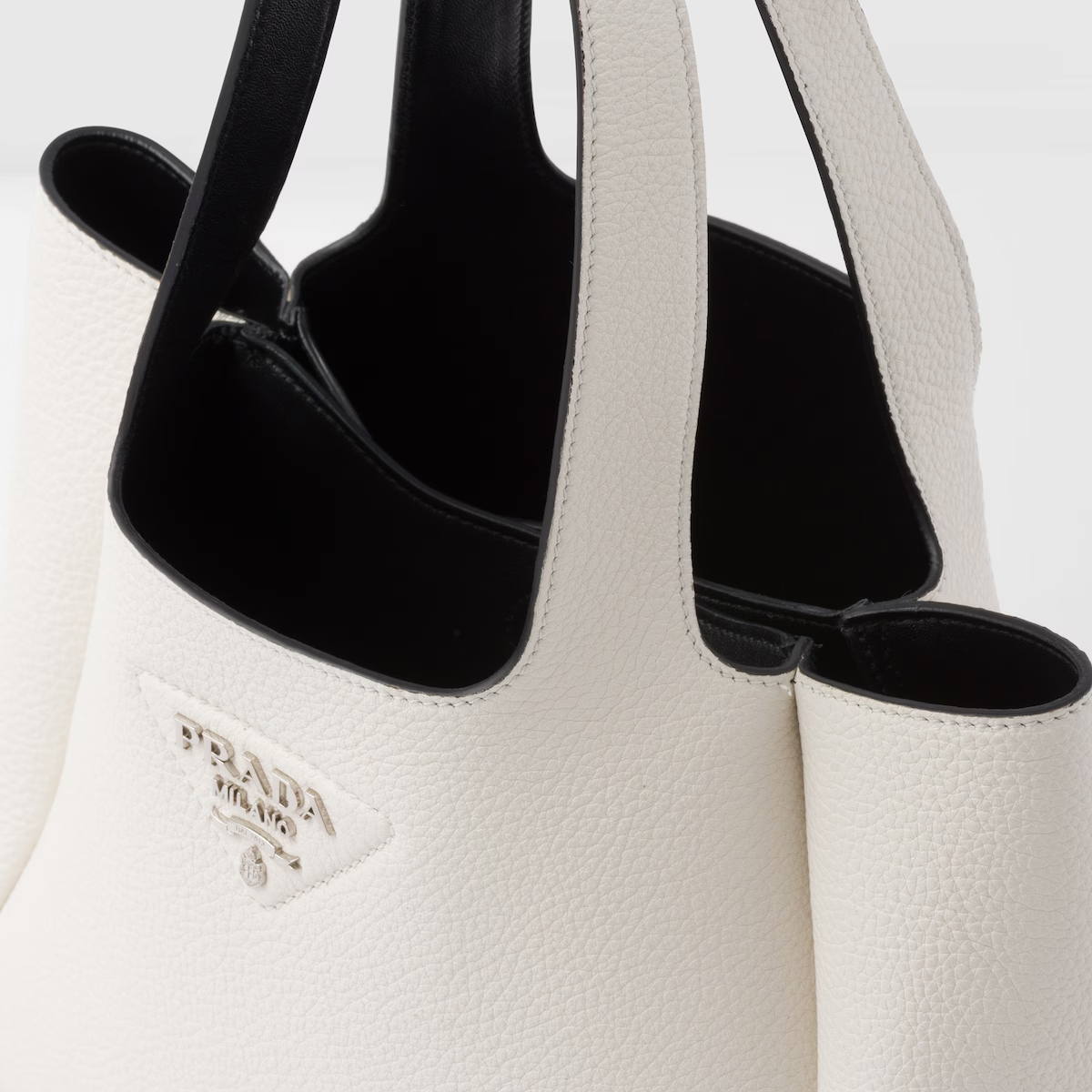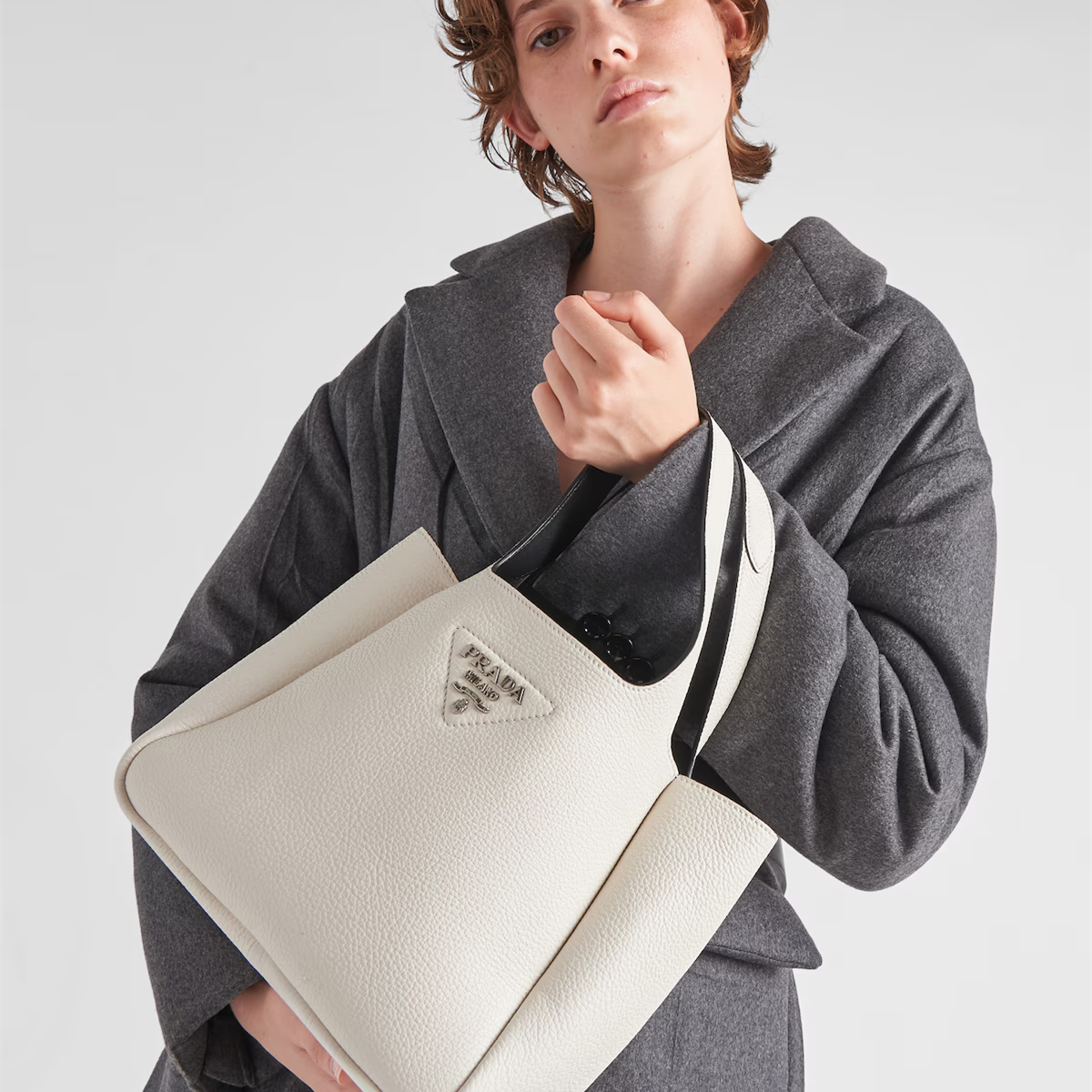 This soft leather tote from the Fall/Winter 2020 collection reinterprets the triangular logo, placing the metal Prada lettering logo in the center and outlining it with topstitching, exuding a unique brand style. The bag is equipped with double leather handles and a magnetic clasp, and the reverse topstitching highlights the soft rounded silhouette. The soft leather lining has three compartments, which shows the functionality at a glance.