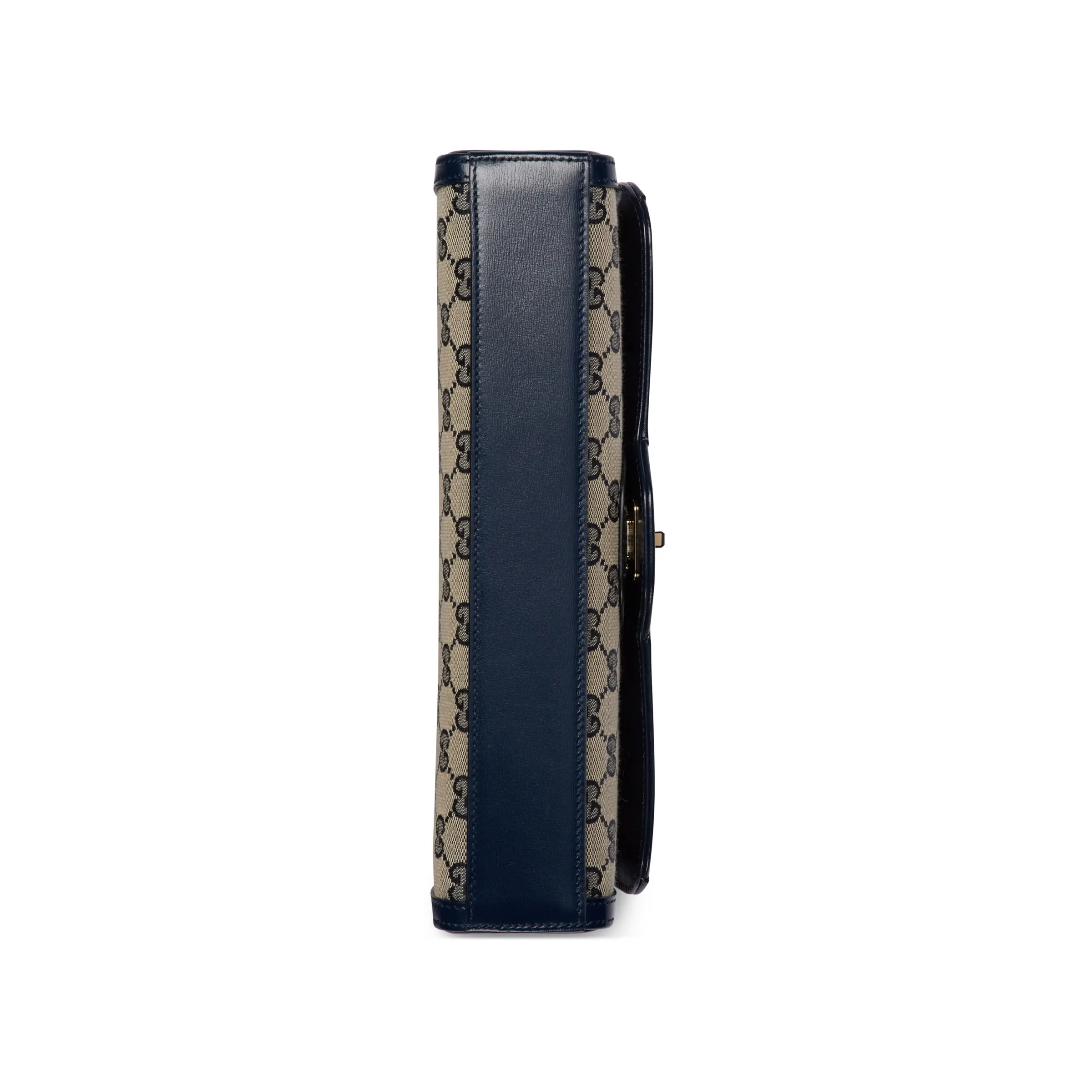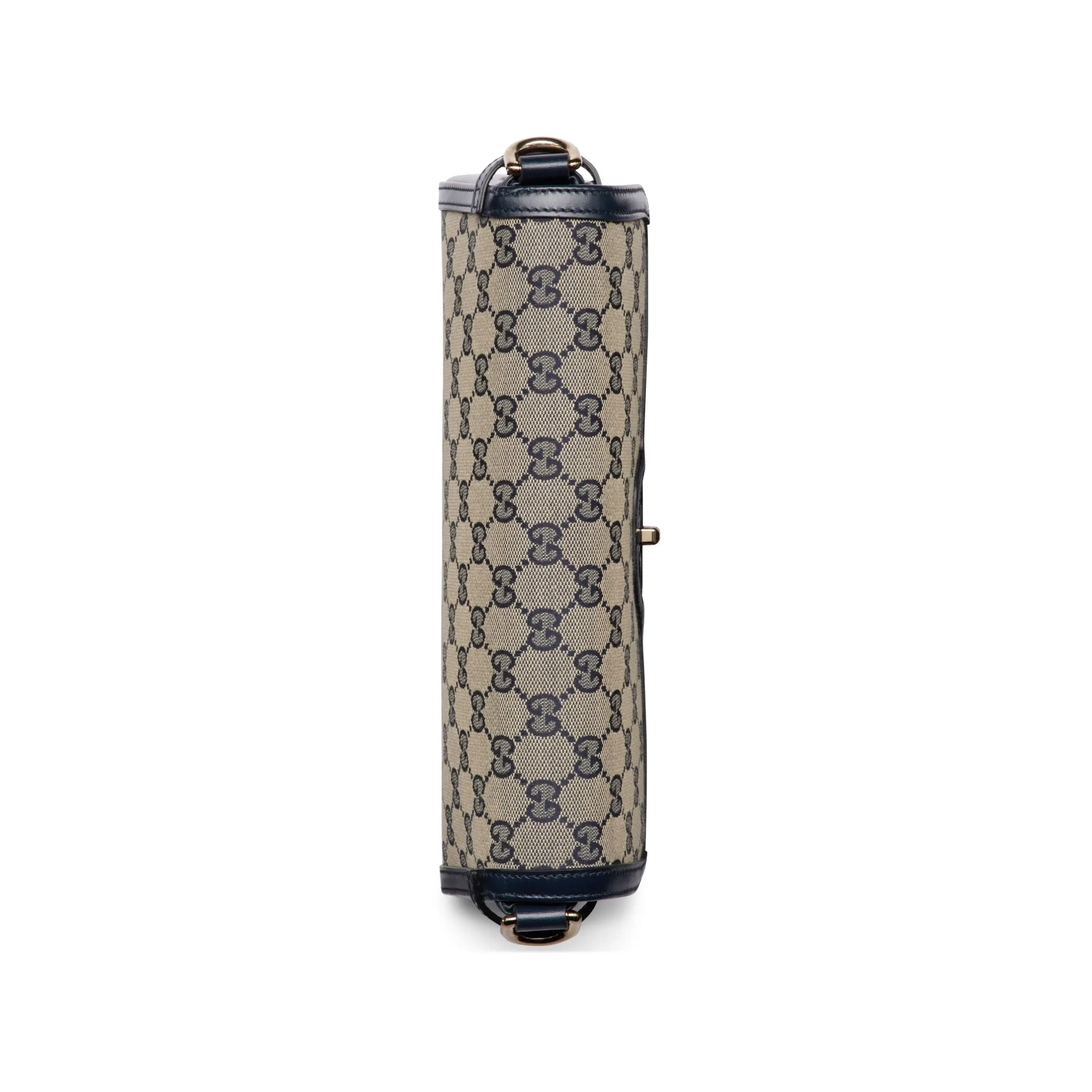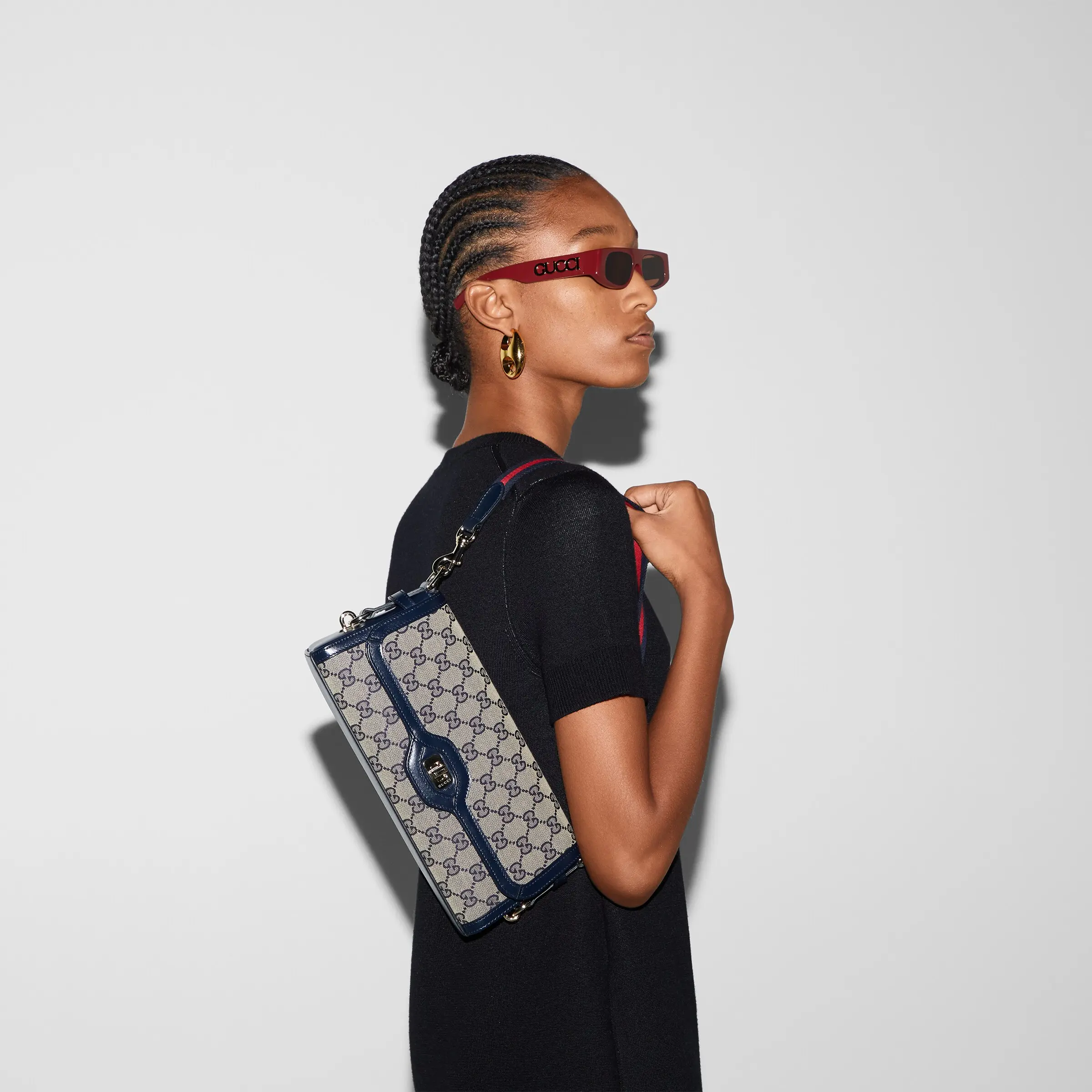 Gucci Luce bags exude a sense of playfulness and fun, "Luce" means "light" in Italian. Classic GG canvas charms a small shoulder bag. Dark blue leather piping and light gold-tone hardware enhance the charm of the beige and dark blue pattern. The removable red and blue striped web passes through the leather loops on both sides and is tied to the accessory loop, giving this bag more functionality and structure.