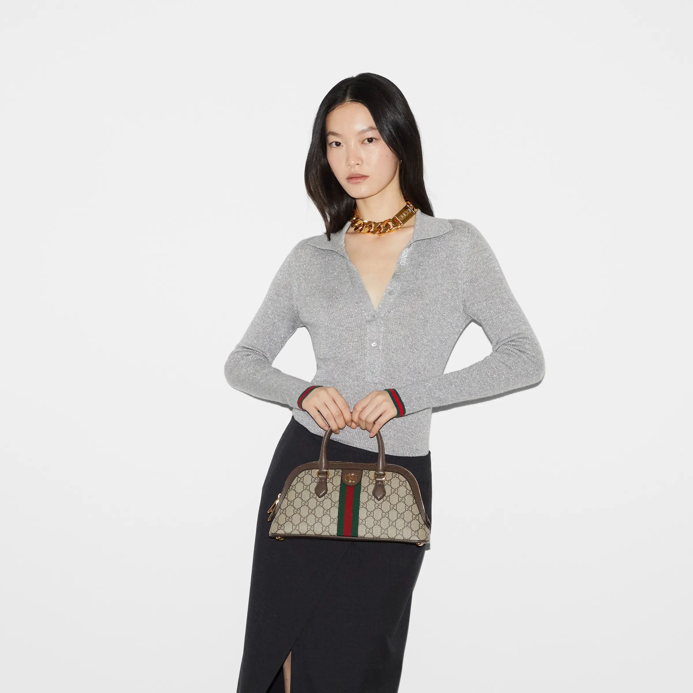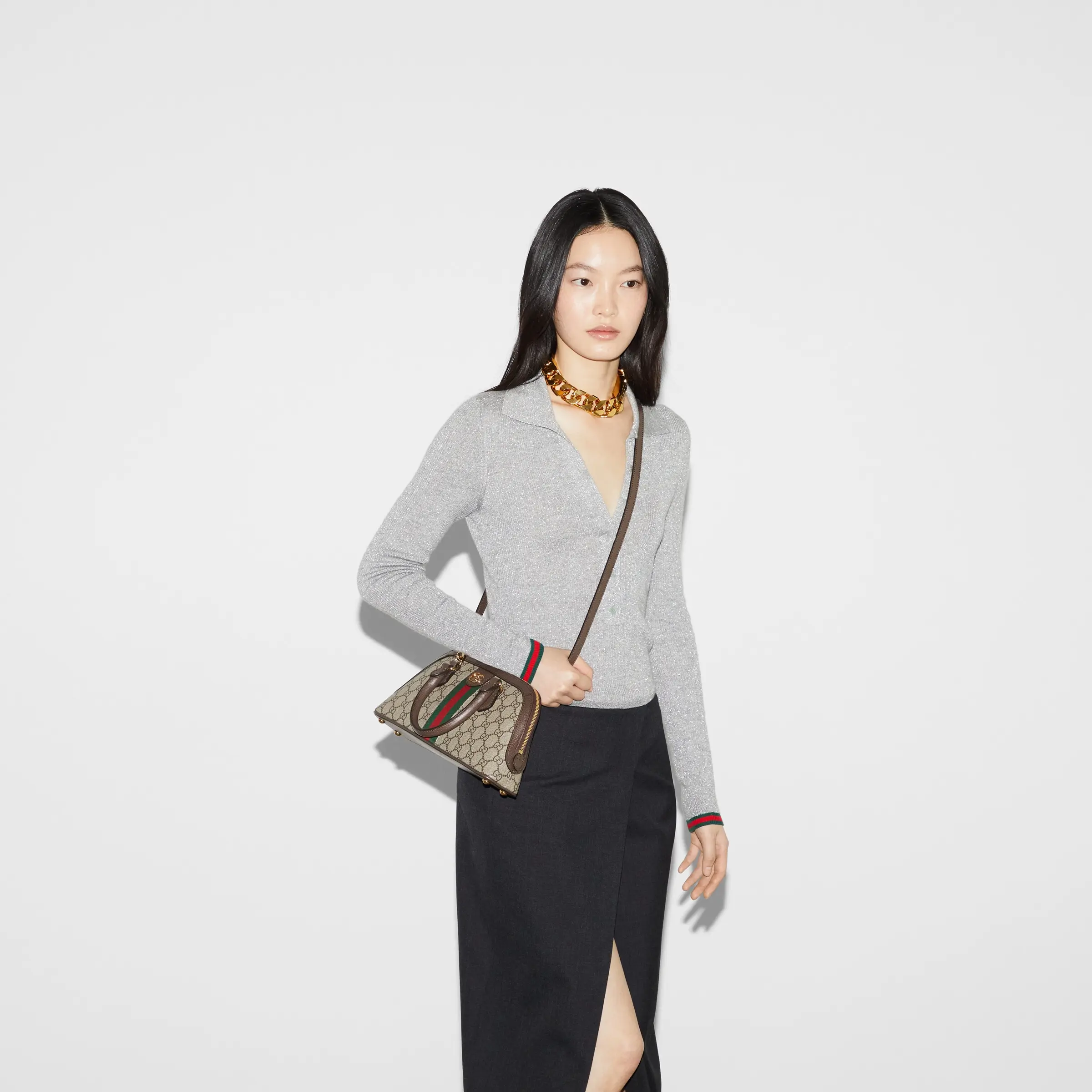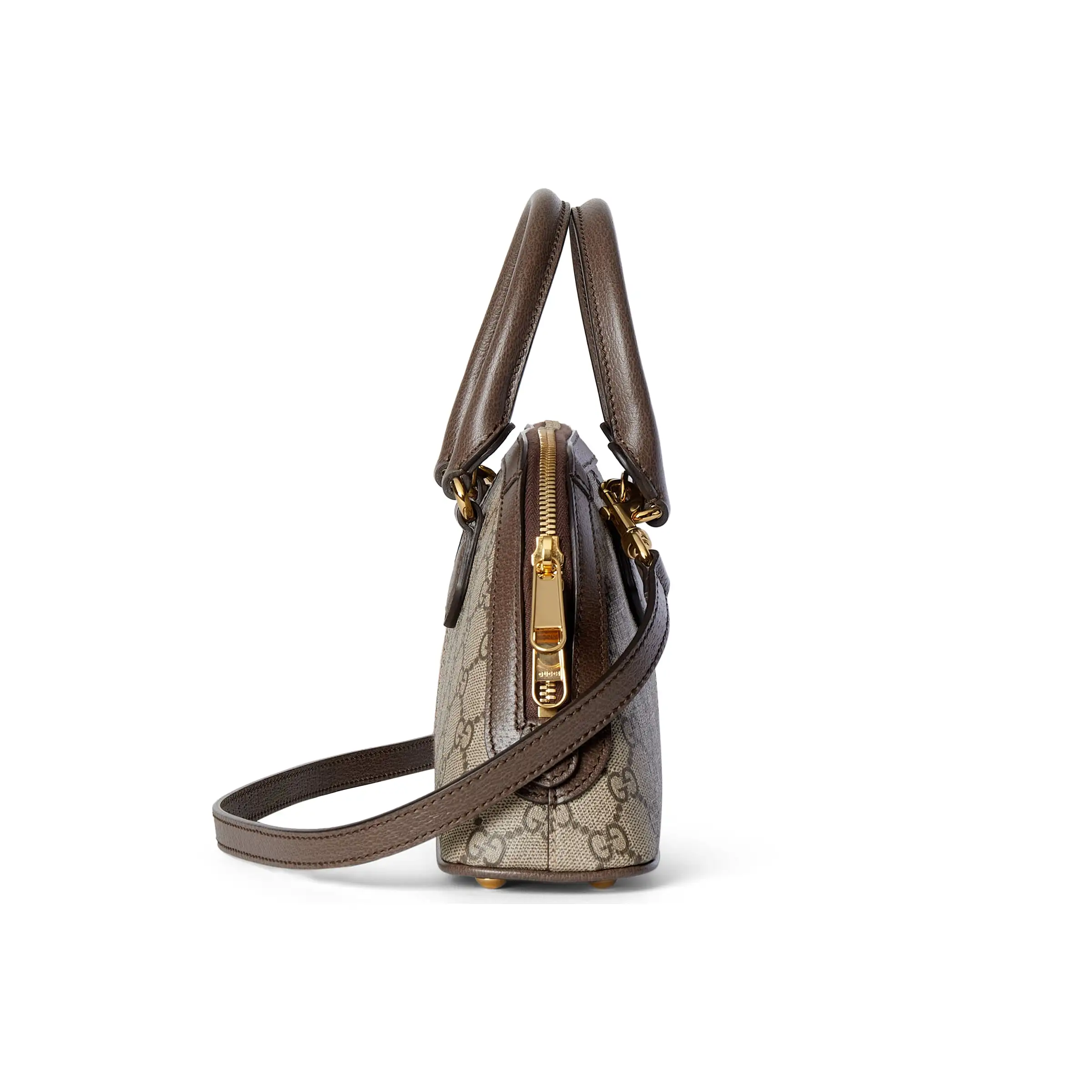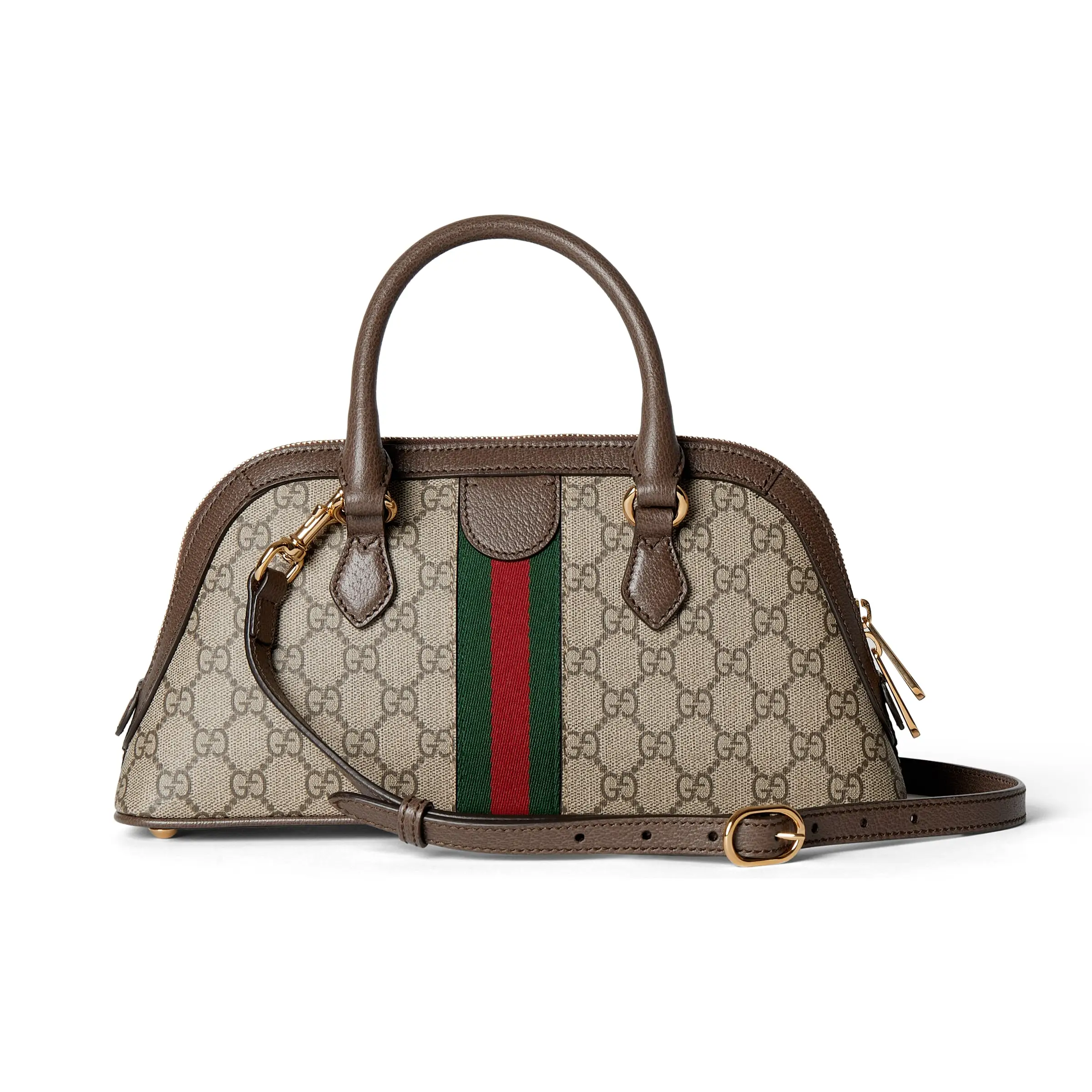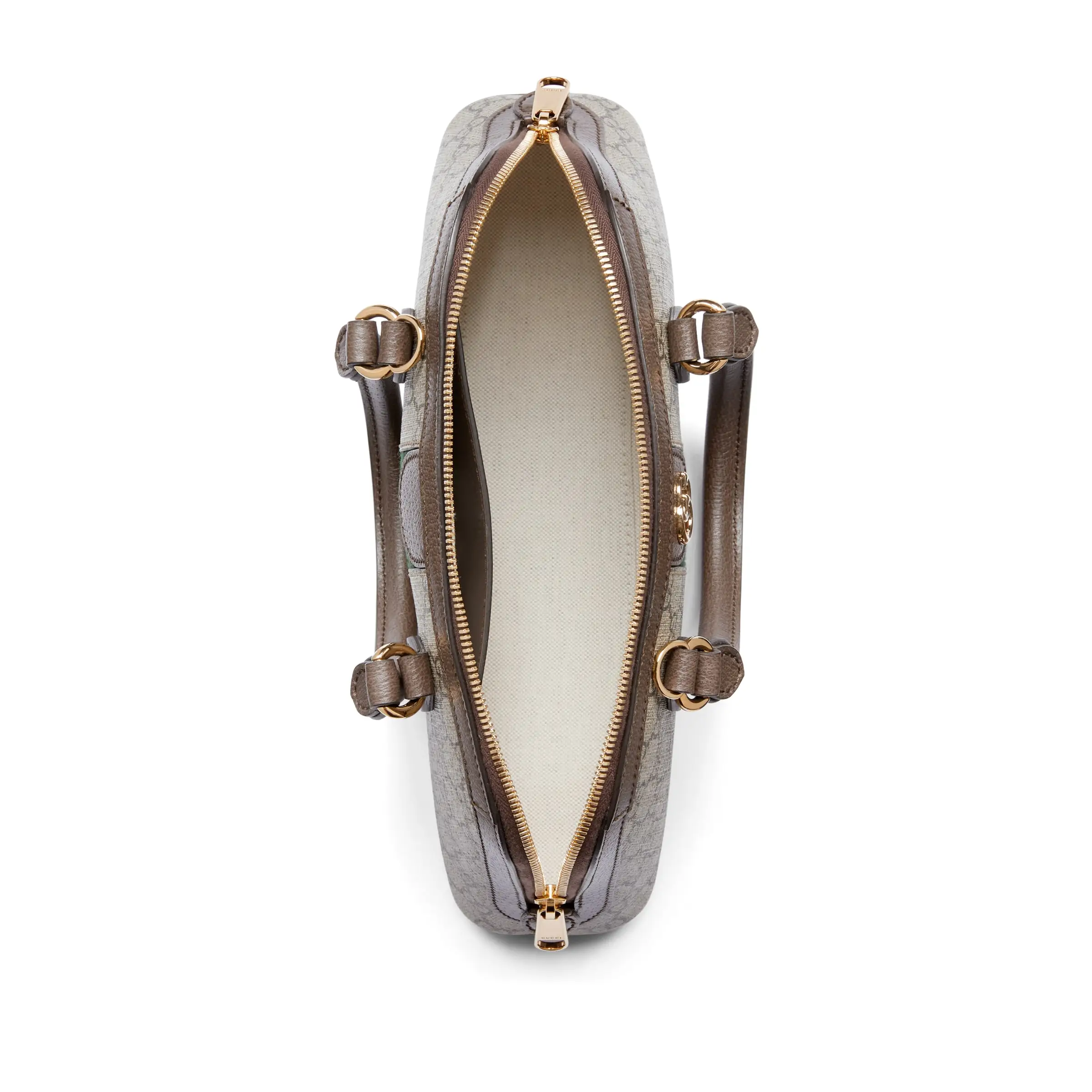 The Ophidia collection celebrates the Pre-Fall collection with a new style. This handbag is made of beige and ebony GG Supreme canvas with a removable and adjustable shoulder strap. The brand's striped web elements and Double G shaped hardware add a touch of color to this piece.