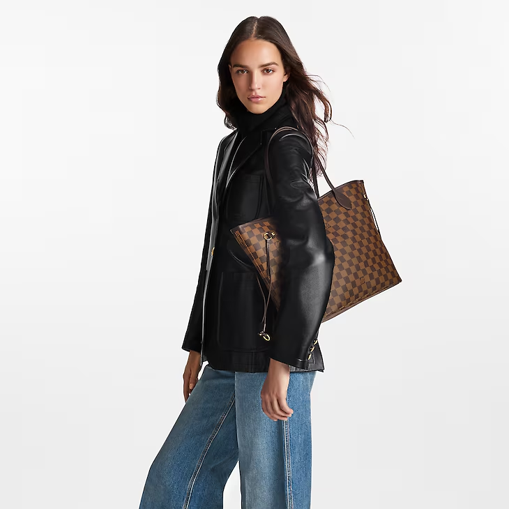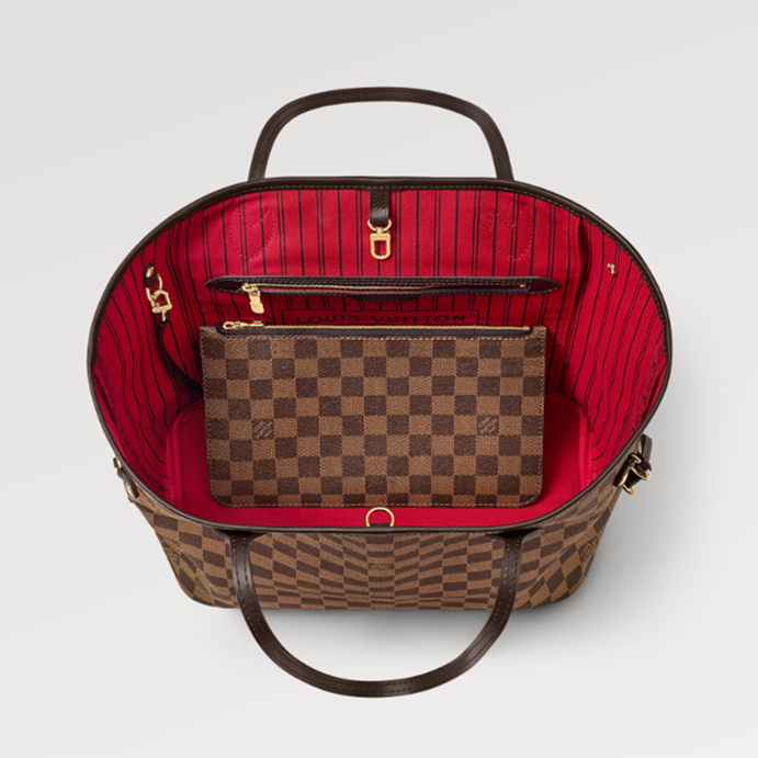 The Neverfull MM tote unites timeless design with heritage details. Elegant in Damier Ebene canvas, it is roomy but not bulky, with side laces that cinch for a sleek allure or loosen for a casual look. Slim, comfortable handles slip easily over the shoulder or arm. Lined in colorful textile, it features a removable pouch which can be used as a clutch or an extra pocket.