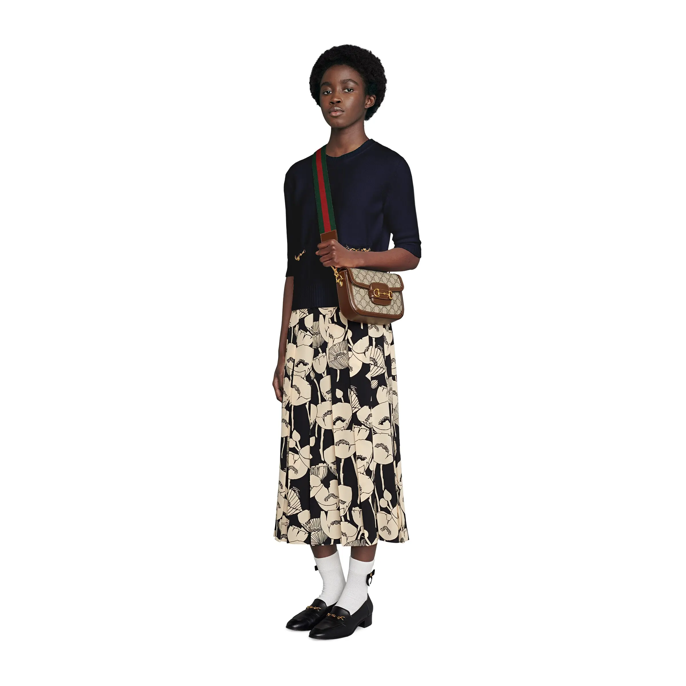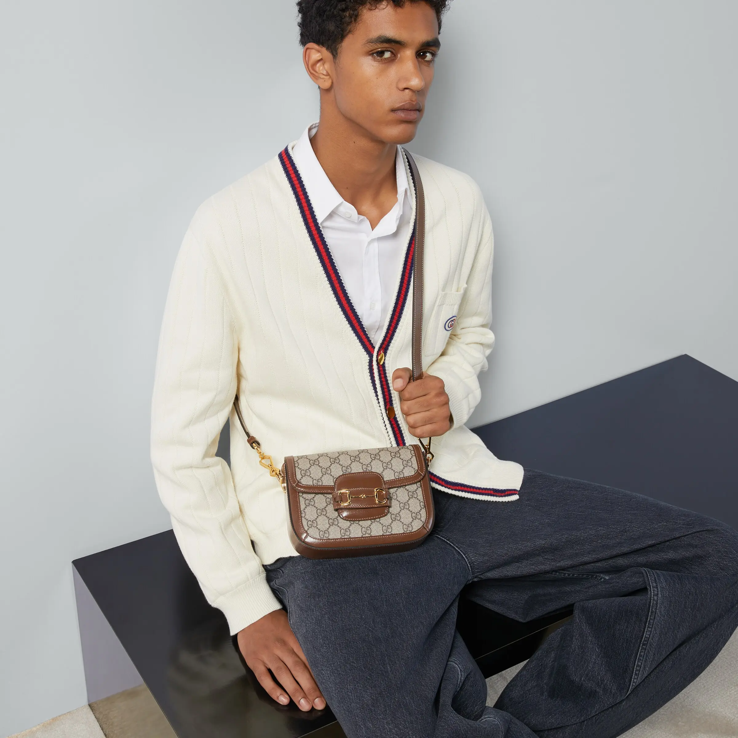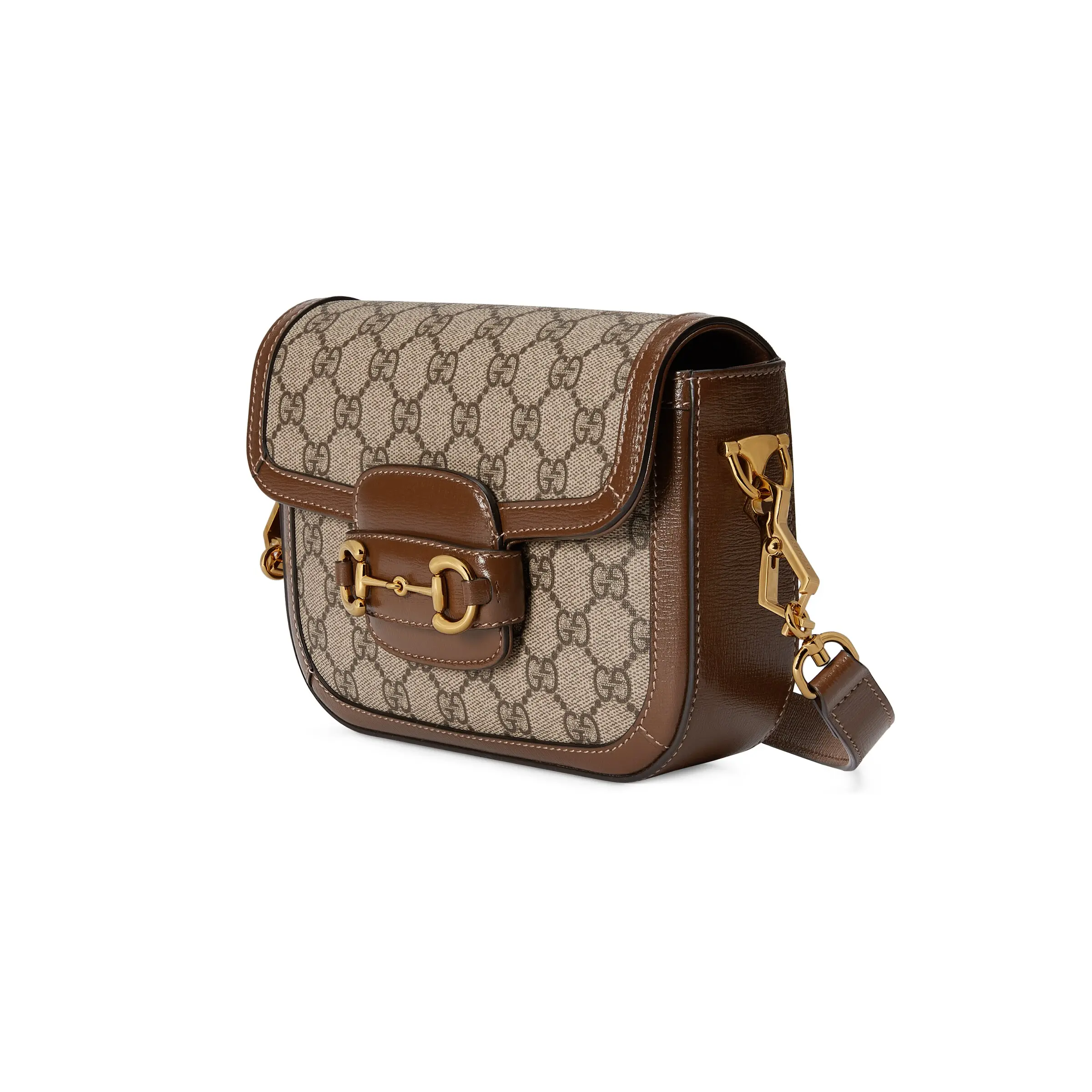 The Gucci Horsebit 1955 Mini Bag adds a mix-and-match touch to this vintage-inspired collection. This mini bag comes with two different shoulder straps, either a tonal leather strap for understated elegance or a red and green web strap for a strong brand identity. The bag is made of canvas with a double G interwoven pattern and trimmed with brown leather.