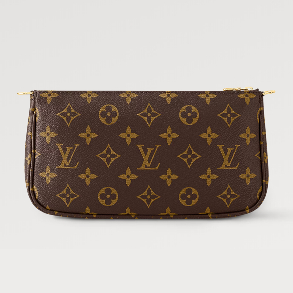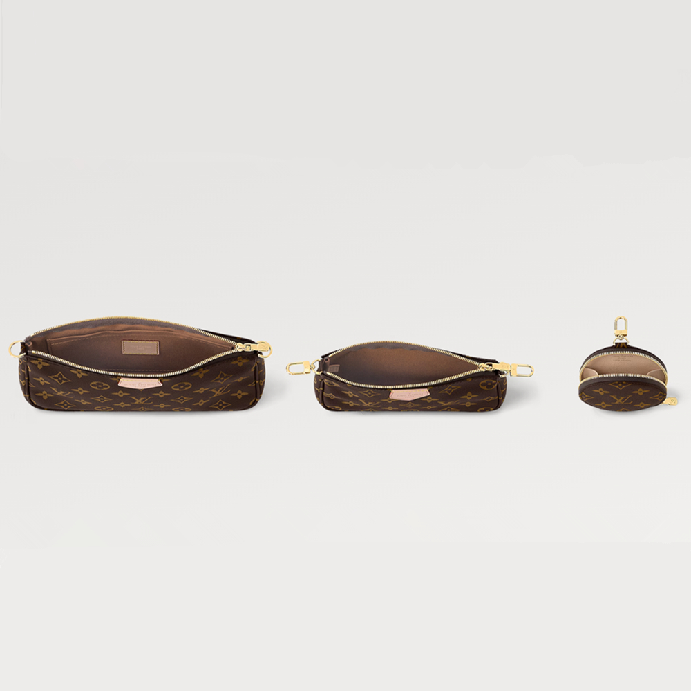 This Multi Pochette Accessoires handbag combines Pochette Accessoires, Mini Pochette Accessoires and round coin purse in one. It uses Monogram canvas to shape the clever design of multiple pockets and compartments, and then embellishes the sides with mini Monogram patterns. Removable chain and adjustable Louis Vuitton jacquard shoulder strap to achieve a variety of carrying methods.