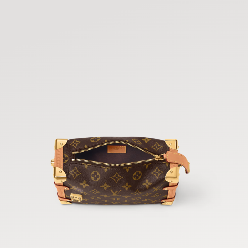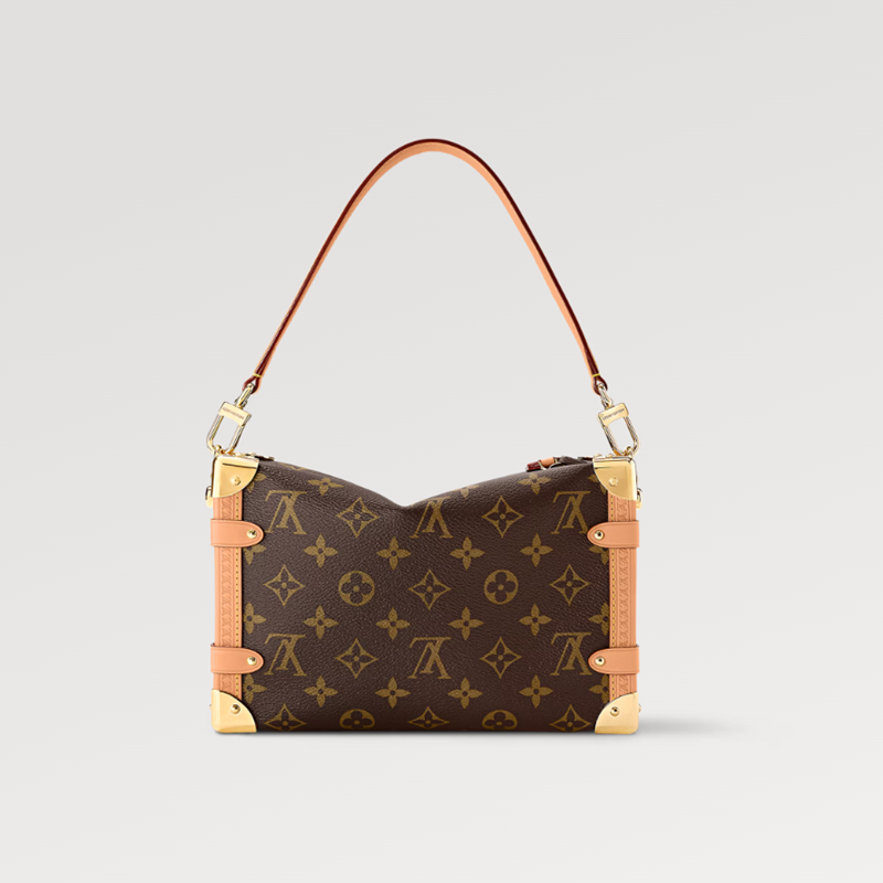 Returning to the House’s trunkmaking beginnings, Nicolas Ghesquière creates the Side Trunk MM handbag in Monogram canvas with leather trim. What strikes the eye is the singularity of the leather zip tab fitted with the iconic S-lock and the reinforced metallic corners. The wide top handle is removable as is the thin leather shoulder strap.
