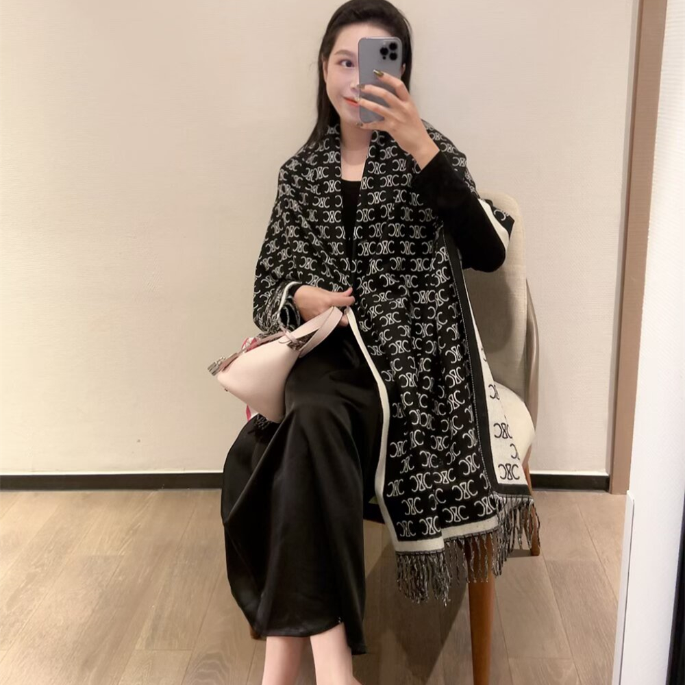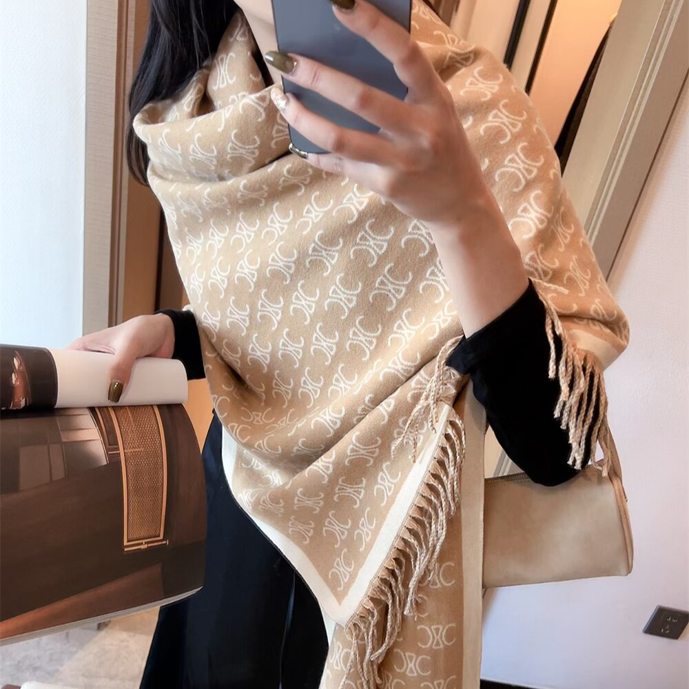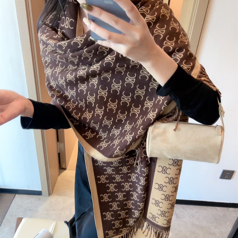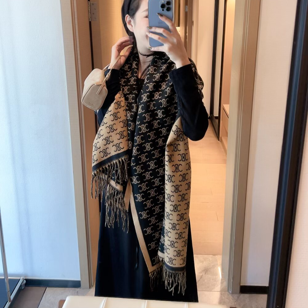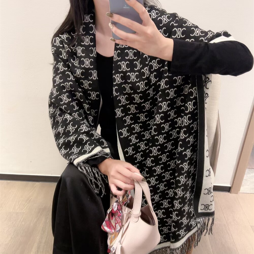 【Design & Style】This Celine reversible scarf features the iconic Arc de Triomphe motif paired with classic CELINE lettering. The elegant double-sided jacquard design offers versatile styling while the contrasting tones—especially the chic black-and-white combination—bring timeless sophistication. Made with imported wool and cashmere yarns, it provides a soft, fluffy texture that feels lightweight yet warm.【Occasion & Matching】Perfect for winter styling, this oversized scarf can be wrapped multiple times or draped as a statement accessory. Its minimalist luxury design makes it easy to pair with coats, knitwear, and dresses. Available in 5 elegant colors, it’s an essential winter piece that enhances both casual and formal looks with effortless Parisian chic.