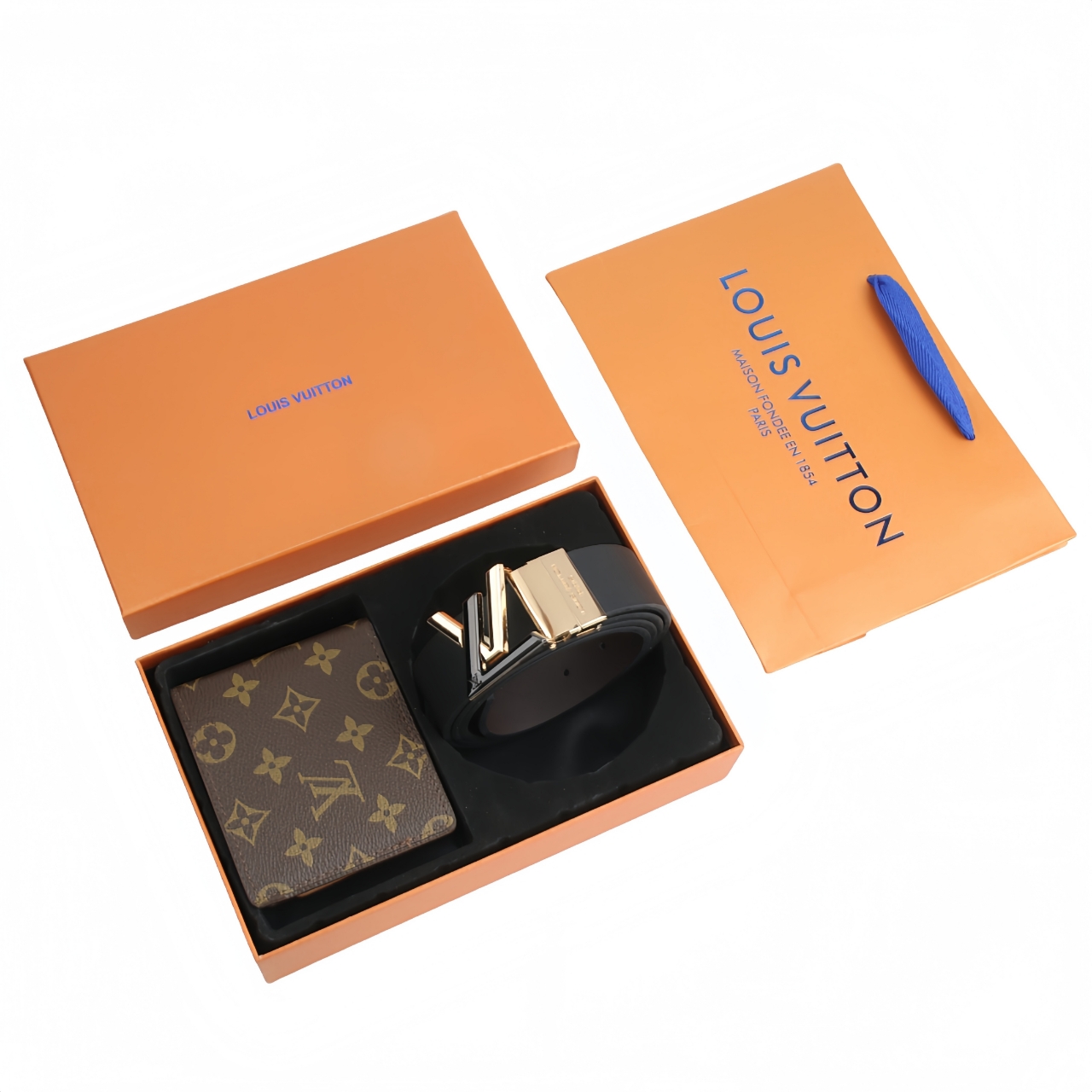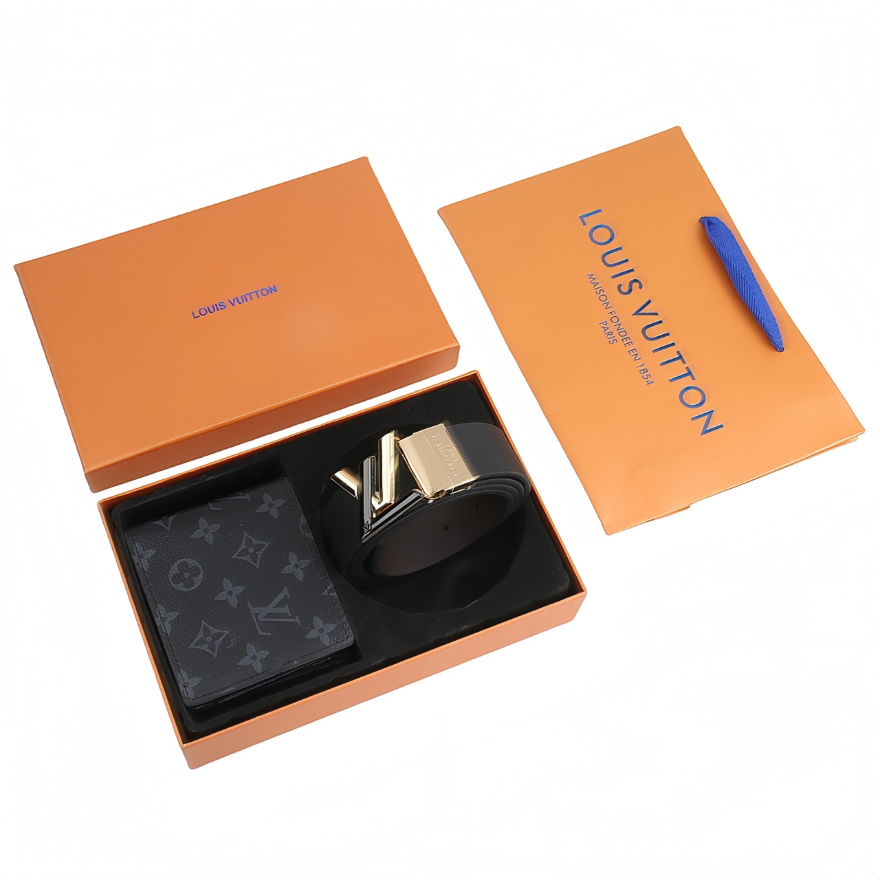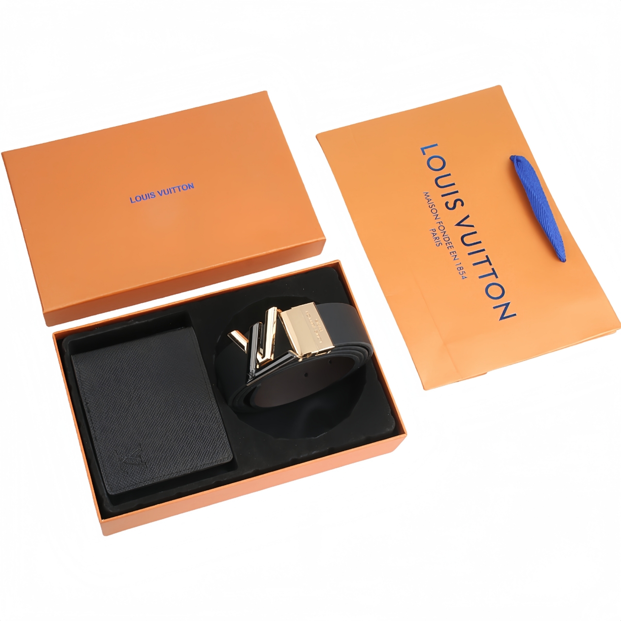 【Elegant Gift Set】This LV gift box includes a reversible smooth leather belt and matching wallet, paired with a premium black & gold rotating buckle for added elegance.