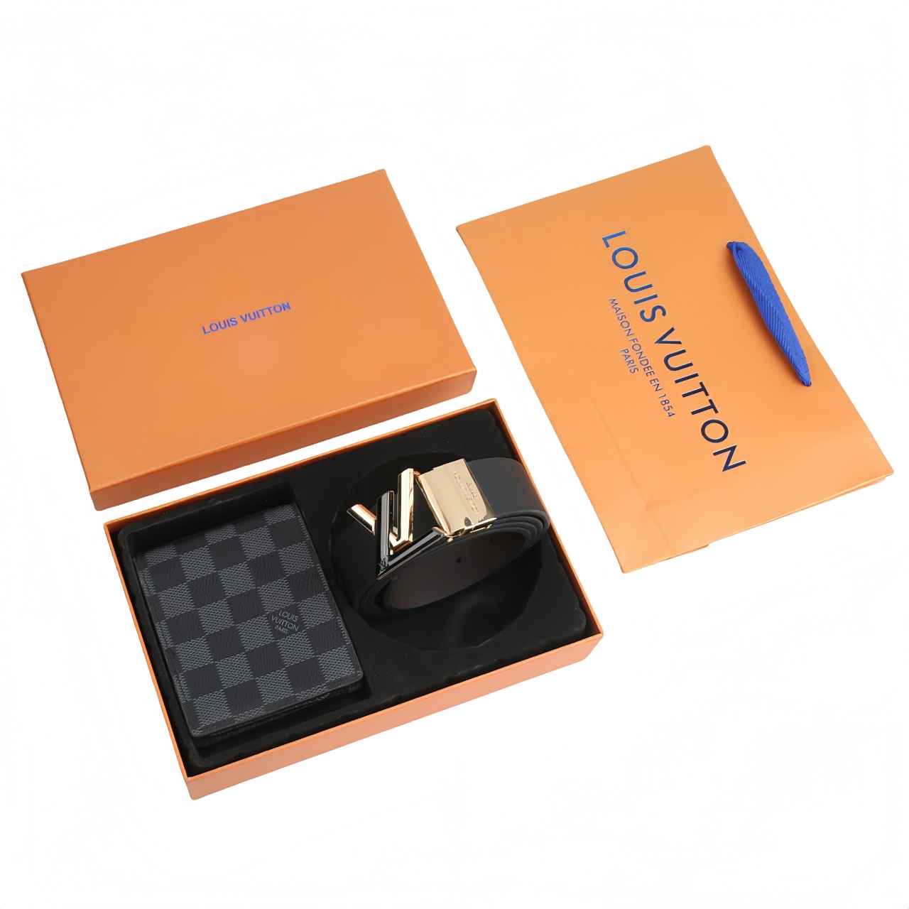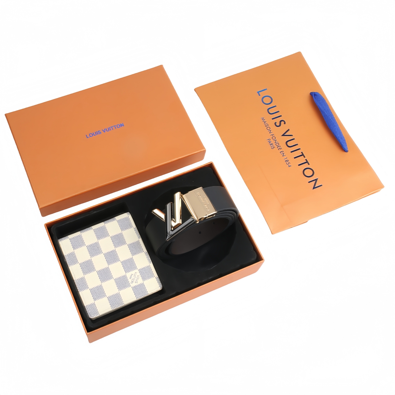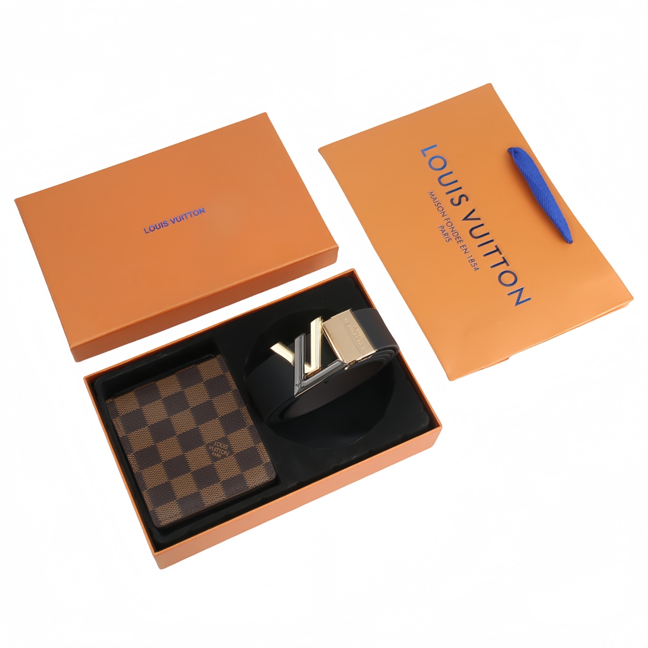 【Elegant Gift Set】This LV gift box includes a reversible smooth leather belt and matching wallet, paired with a premium black & gold rotating buckle for added elegance.