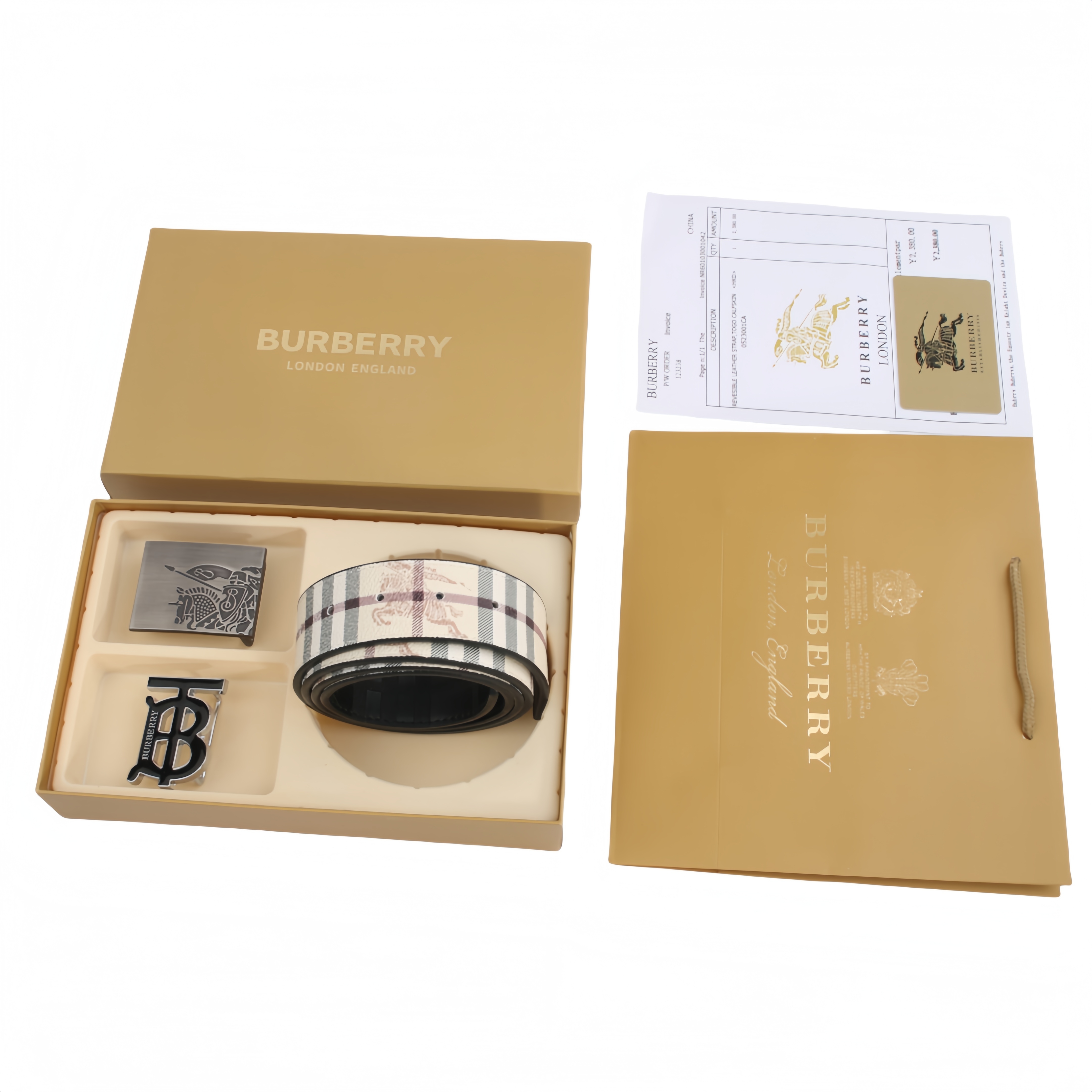 【New】Burberry Mixed Dual Buckle Classic Stripe Leather Belt