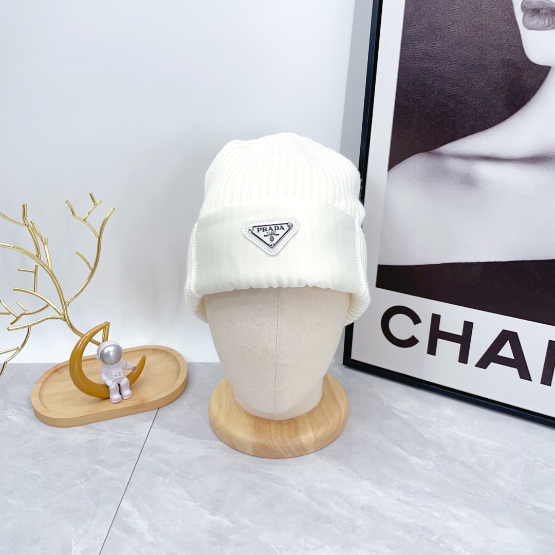 【New】Prada Knitted Winter Earflap Beanie Beige