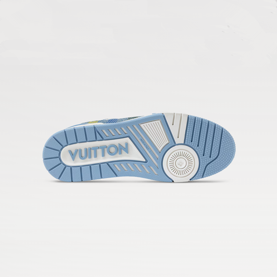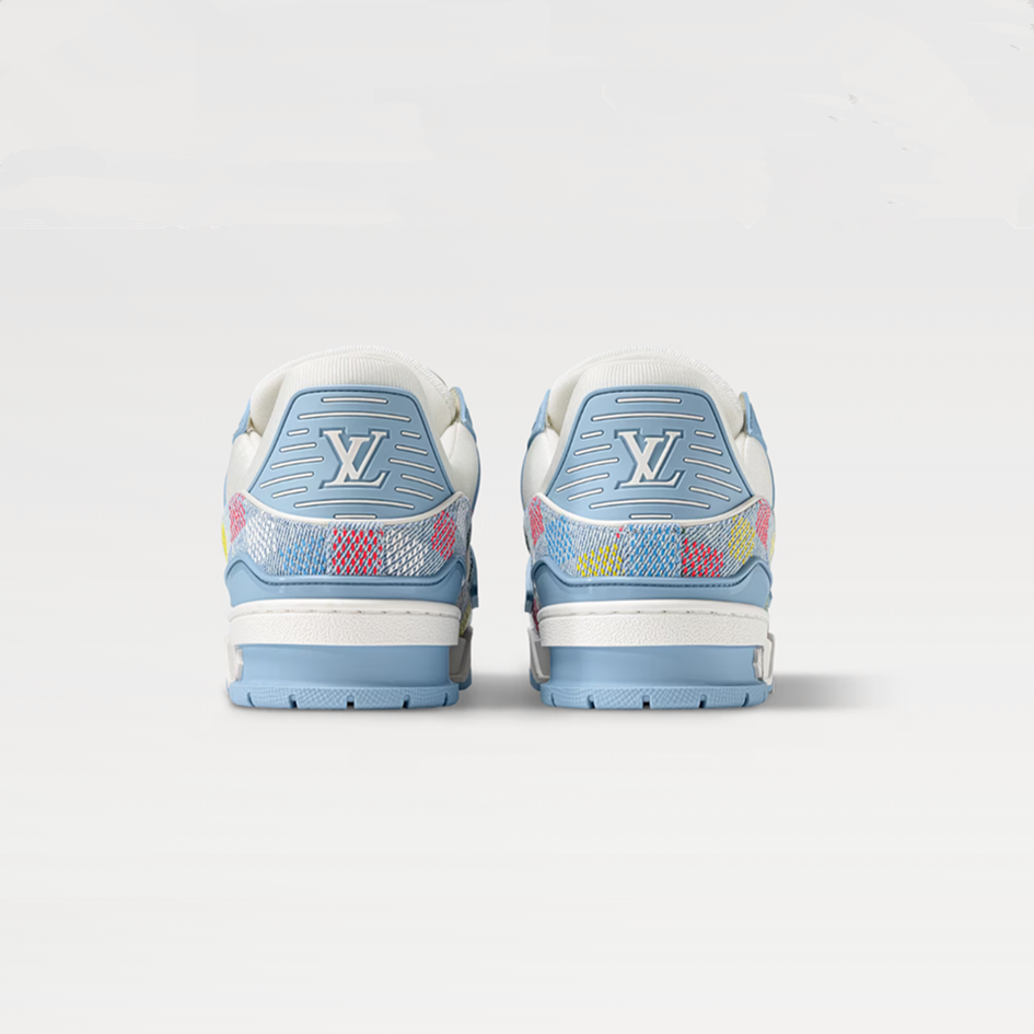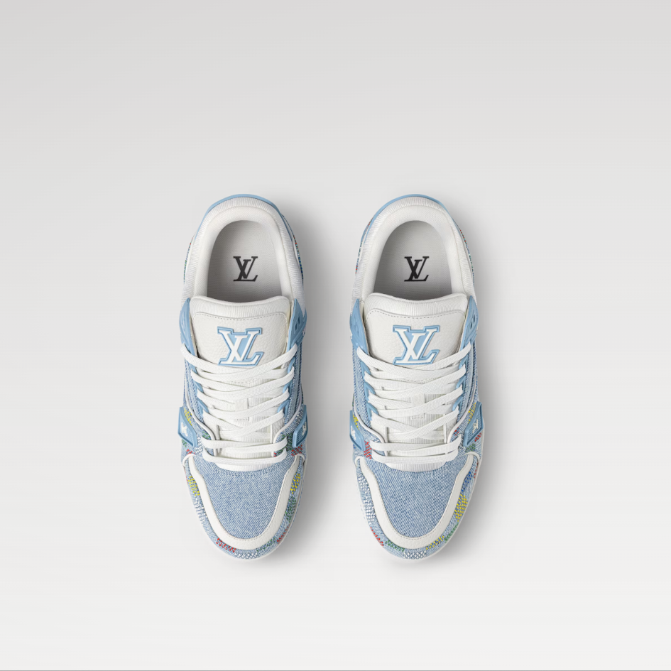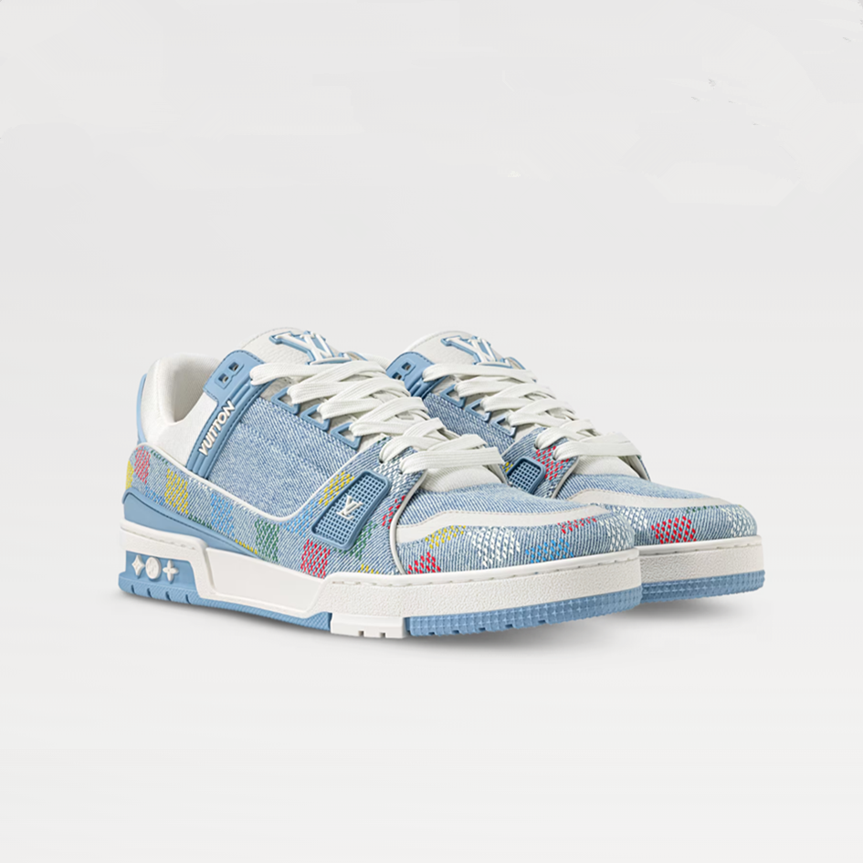 【Signature Design by Pharrell Williams】 The LV Trainer Sneakers showcase the LVers Damier pattern, designed by Men’s Artistic Director Pharrell Williams. The premium denim upper features rubberized Vuitton branding and LV initials, while Monogram flowers subtly embellish the outsole.