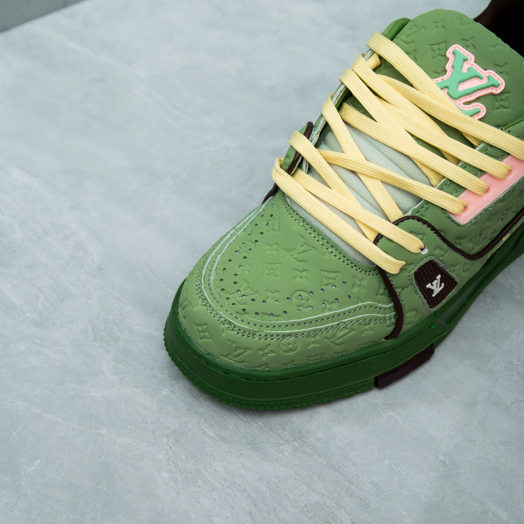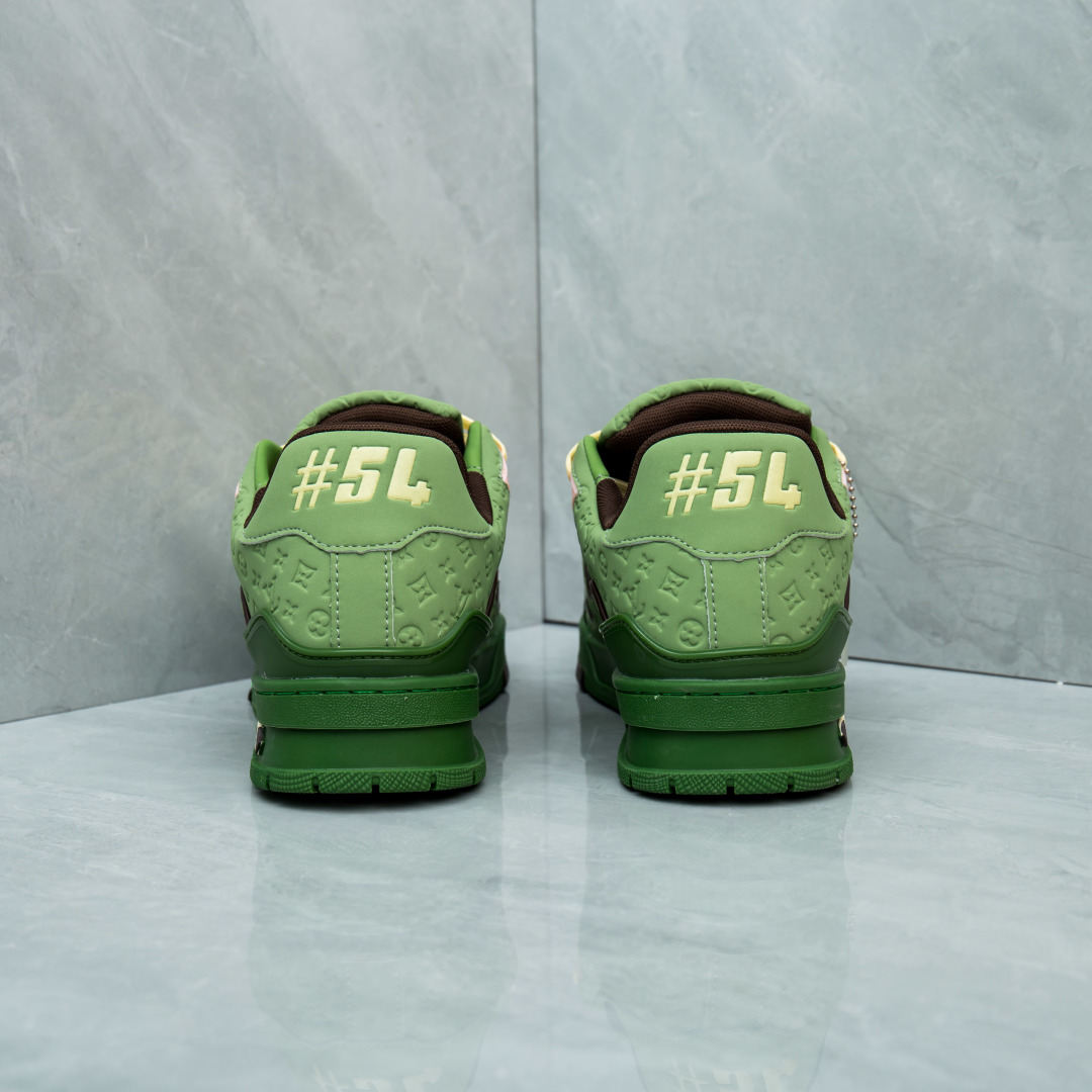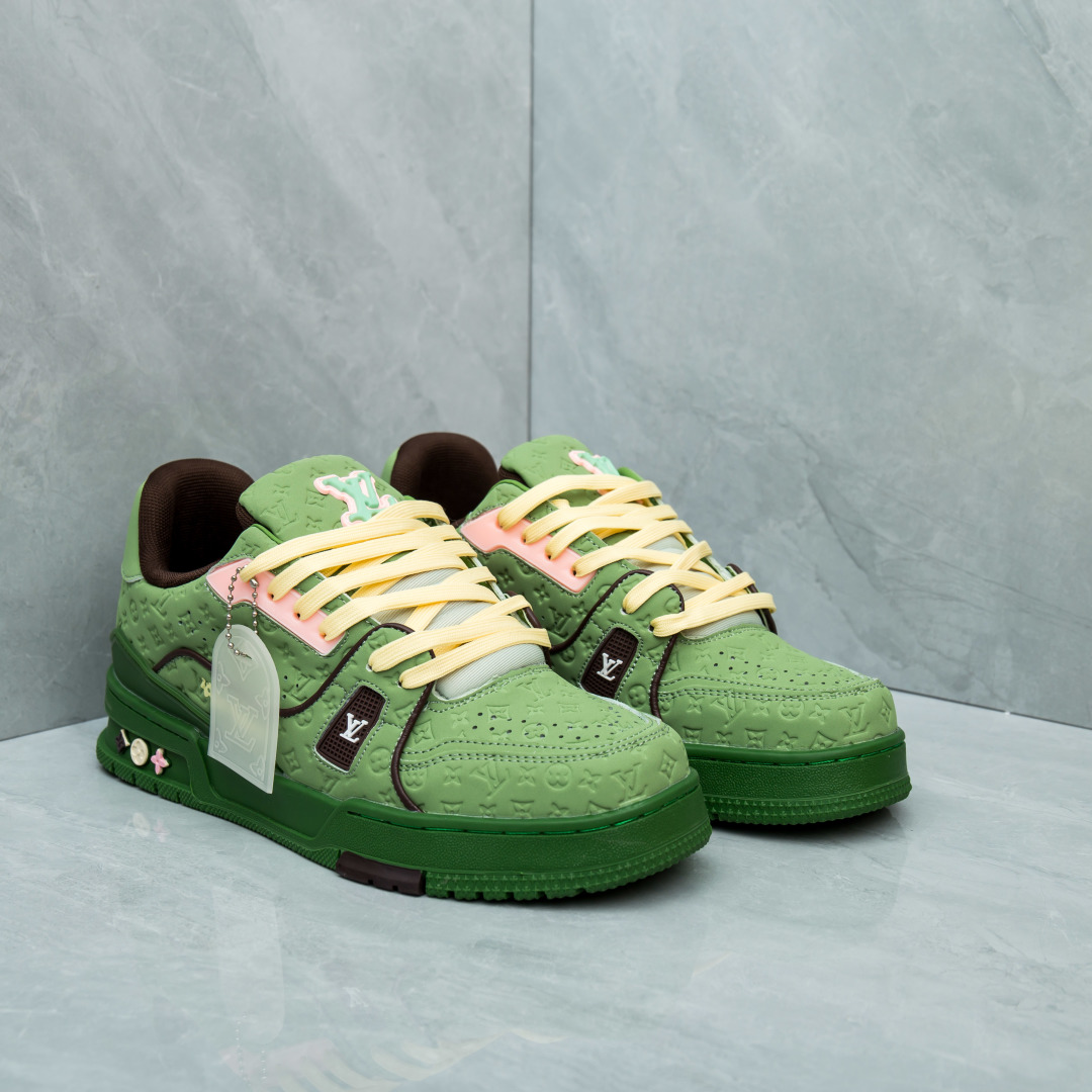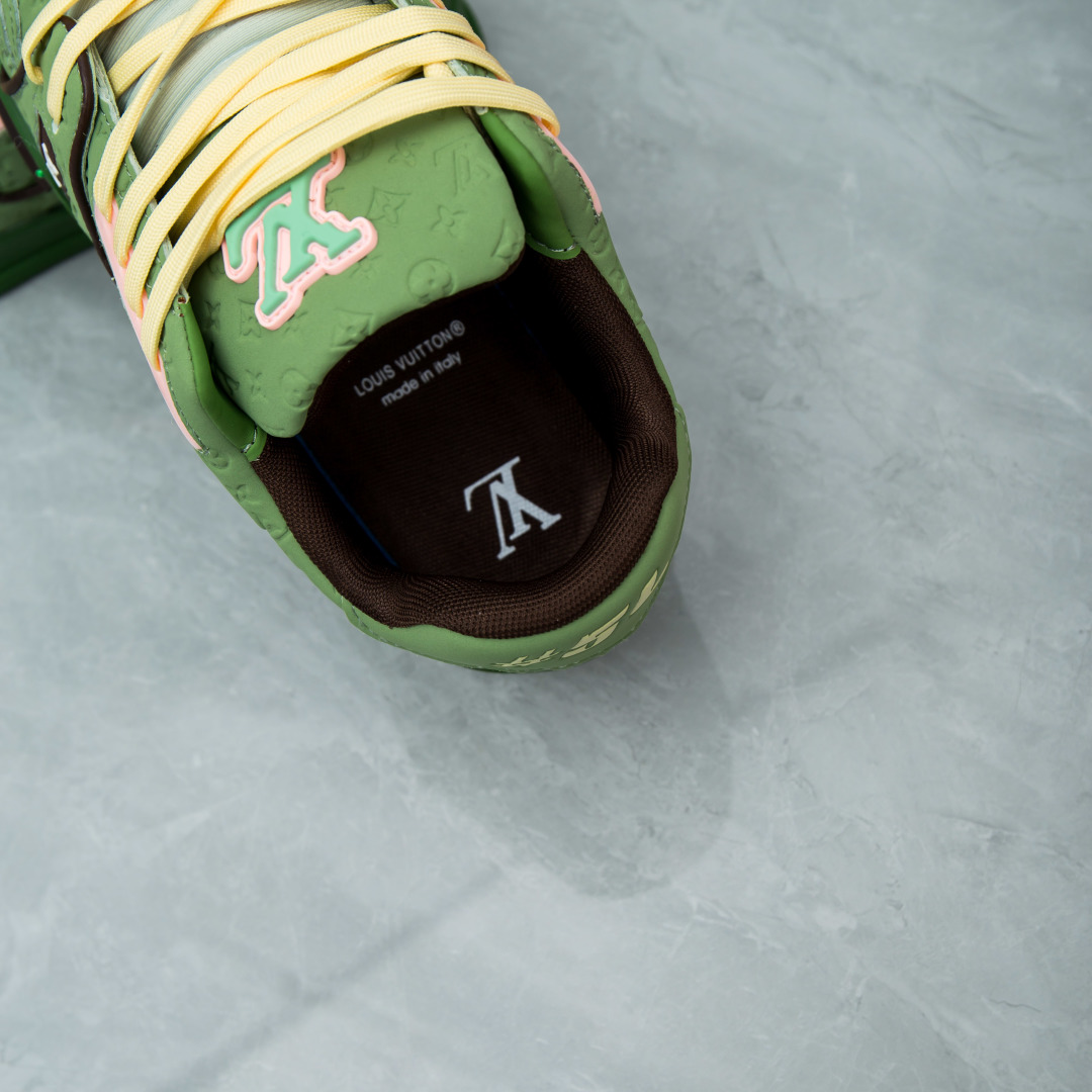 【Exclusive Tyler x LV Collaboration】 The Tyler x Louis Vuitton Trainer Sneaker arrives in a fresh Avocado Green, blending luxury craftsmanship with streetwear culture. Featuring imported full-grain calf leather, a TPR-gloss outsole, and an ultra-soft cushioned insole, this sneaker offers a premium feel with 2024 runway-inspired design.