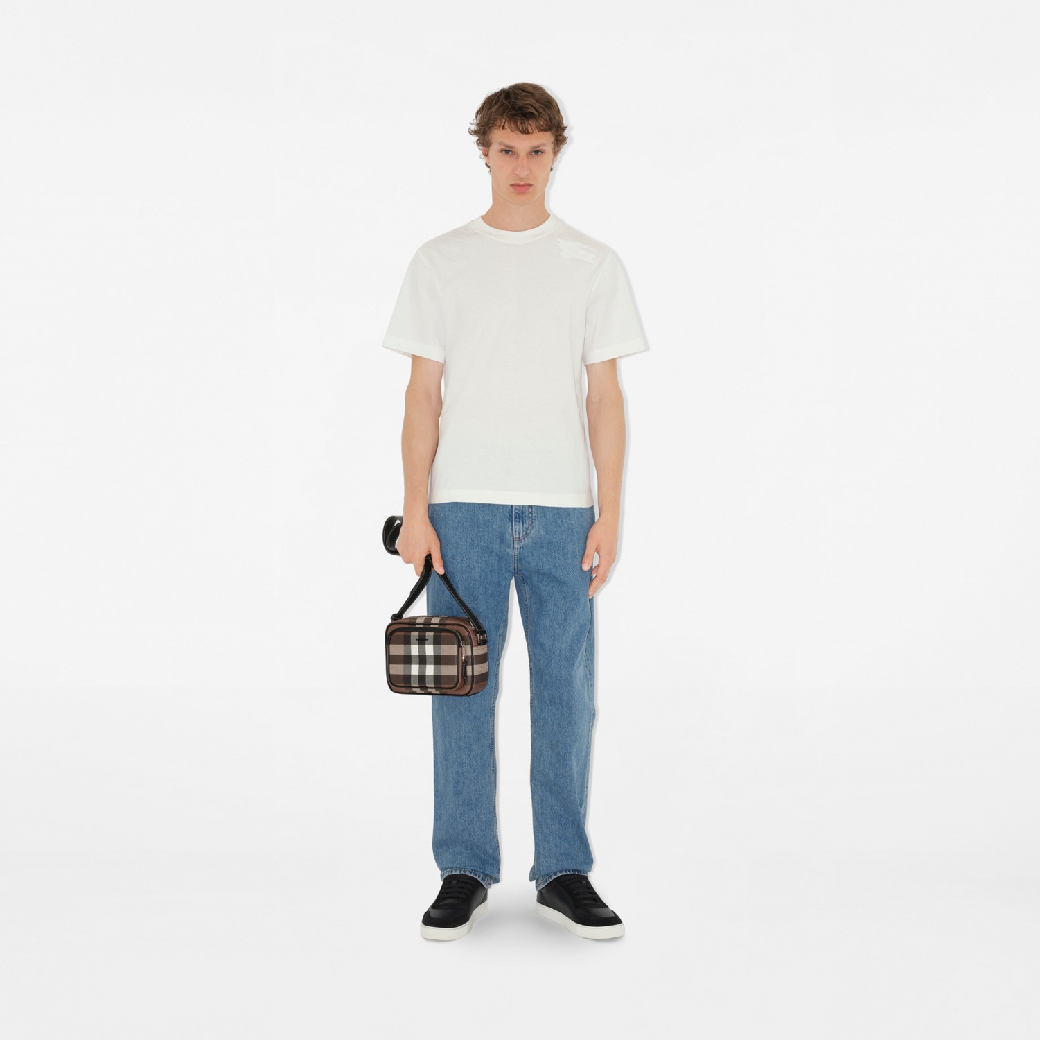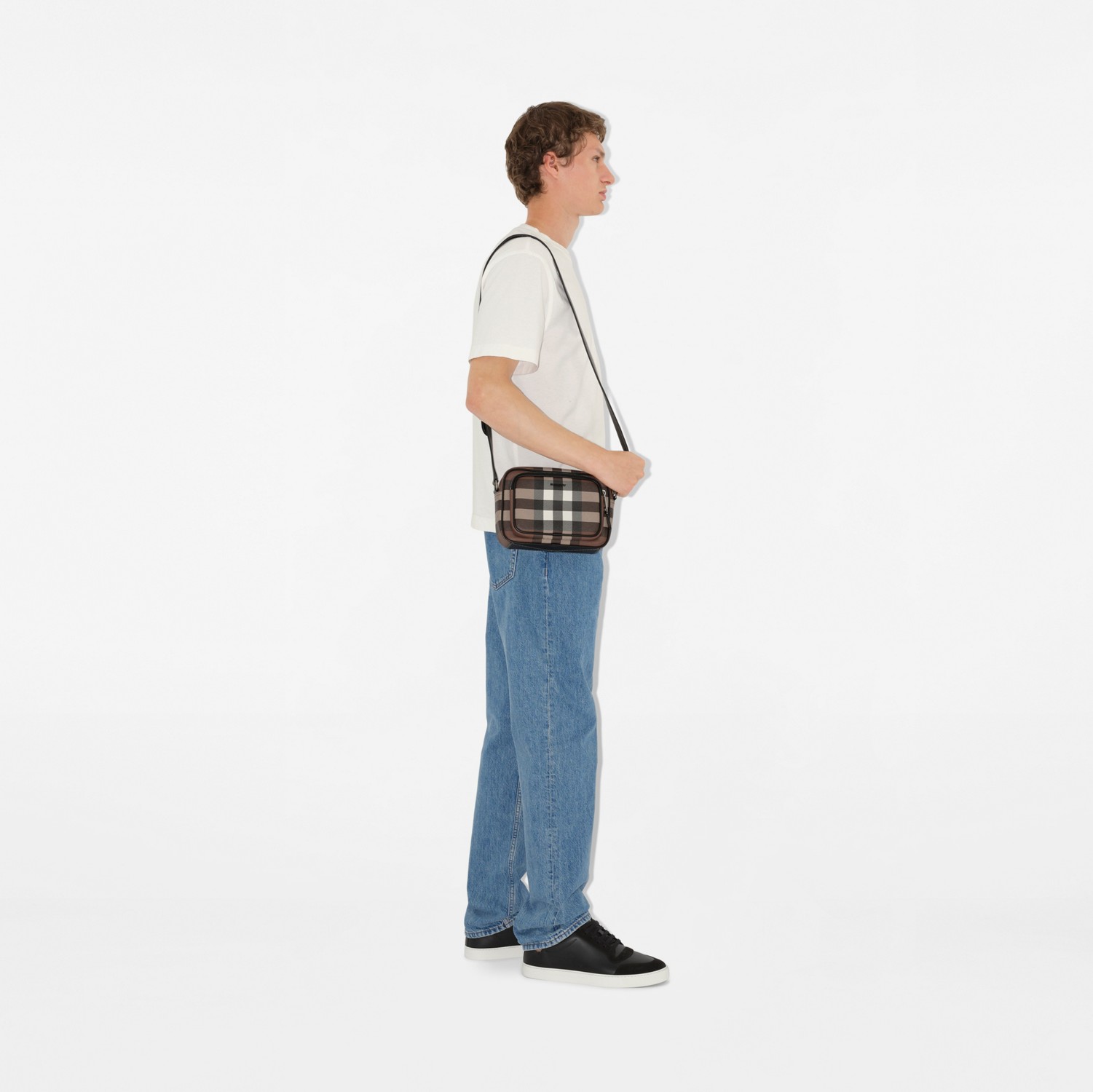 Crossbody bag with Burberry check and solid lining. A compact design with topstitched calfskin trim and adjustable leather shoulder strap.