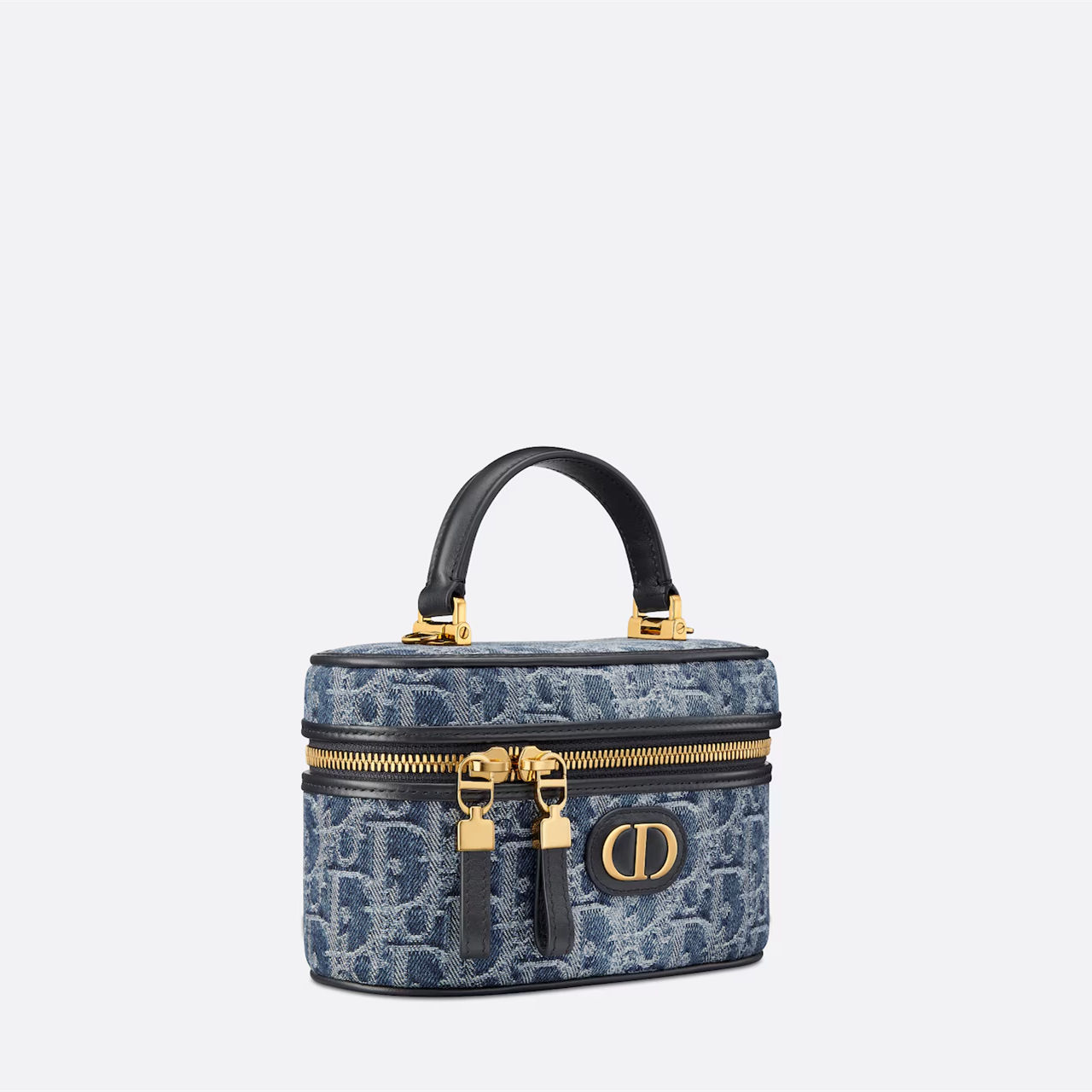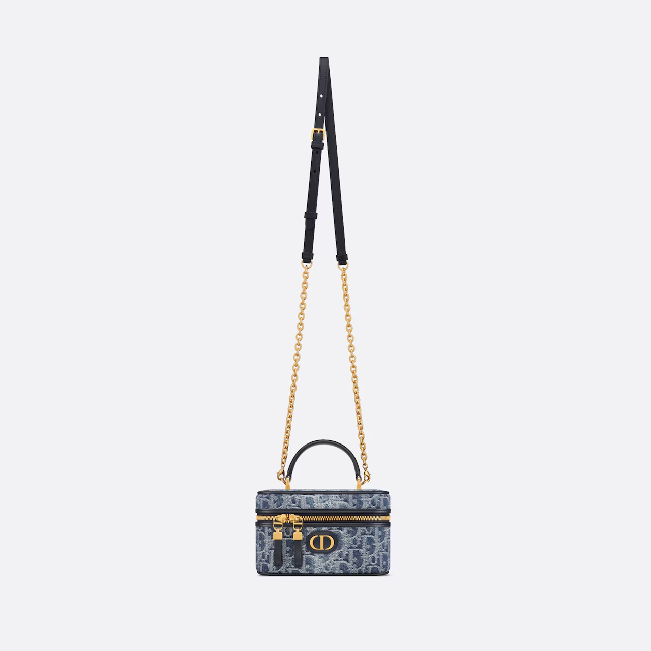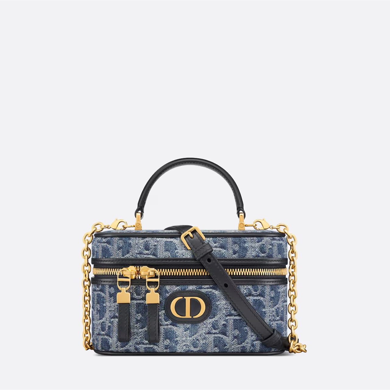 The 30 Montaigne Mini Vanity Bag is a sophisticated design that combines practicality and elegance, elevating the collection. Crafted in blue Denim Dior Oblique jacquard, it updates Dior's classic pattern with an irregular stonewash effect, exuding a trendy appeal, and is decorated with the CD logo on the front. It can store all kinds of daily necessities, with 1 pocket and internal mirror for added refinement. It can be carried by the top handle, and the adjustable shoulder strap is made of gold-finished metal and blue enamel links, and decorated with a leather strap, which makes it more comfortable to carry on the shoulder or crossbody.