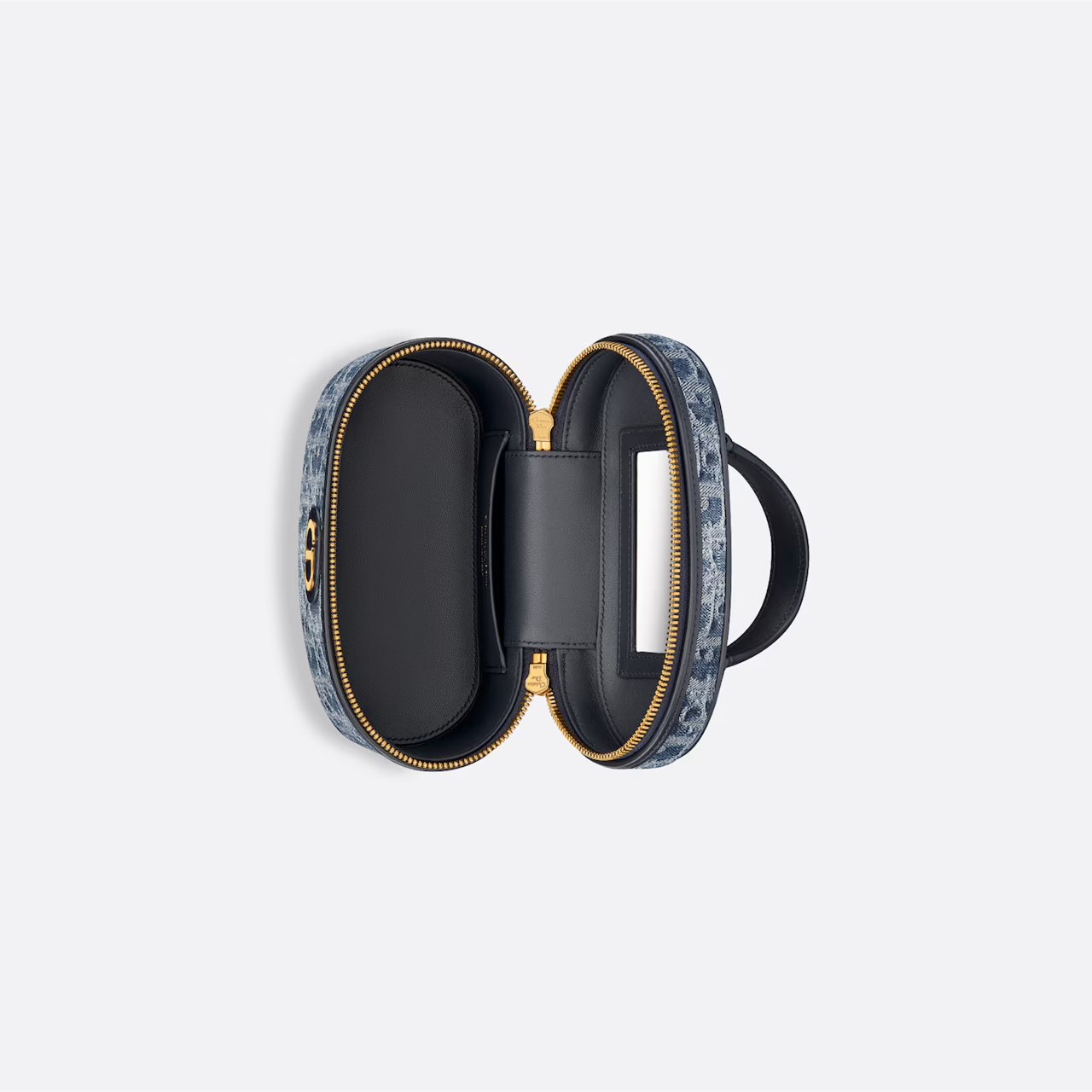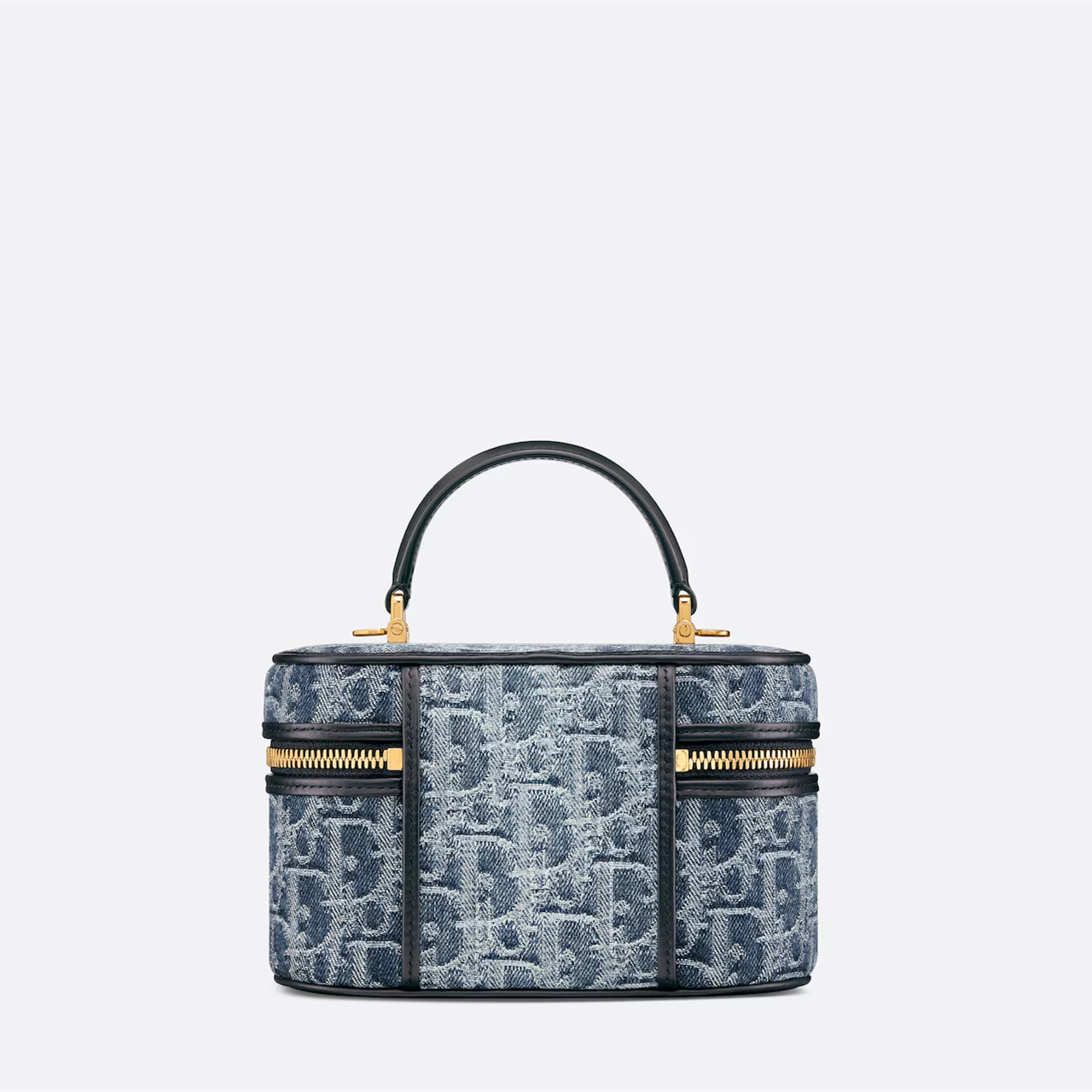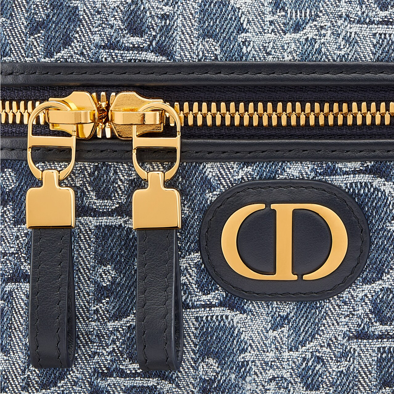 The 30 Montaigne Mini Vanity Bag is a sophisticated design that combines practicality and elegance, elevating the collection. Crafted in blue Denim Dior Oblique jacquard, it updates Dior's classic pattern with an irregular stonewash effect, exuding a trendy appeal, and is decorated with the CD logo on the front. It can store all kinds of daily necessities, with 1 pocket and internal mirror for added refinement. It can be carried by the top handle, and the adjustable shoulder strap is made of gold-finished metal and blue enamel links, and decorated with a leather strap, which makes it more comfortable to carry on the shoulder or crossbody.