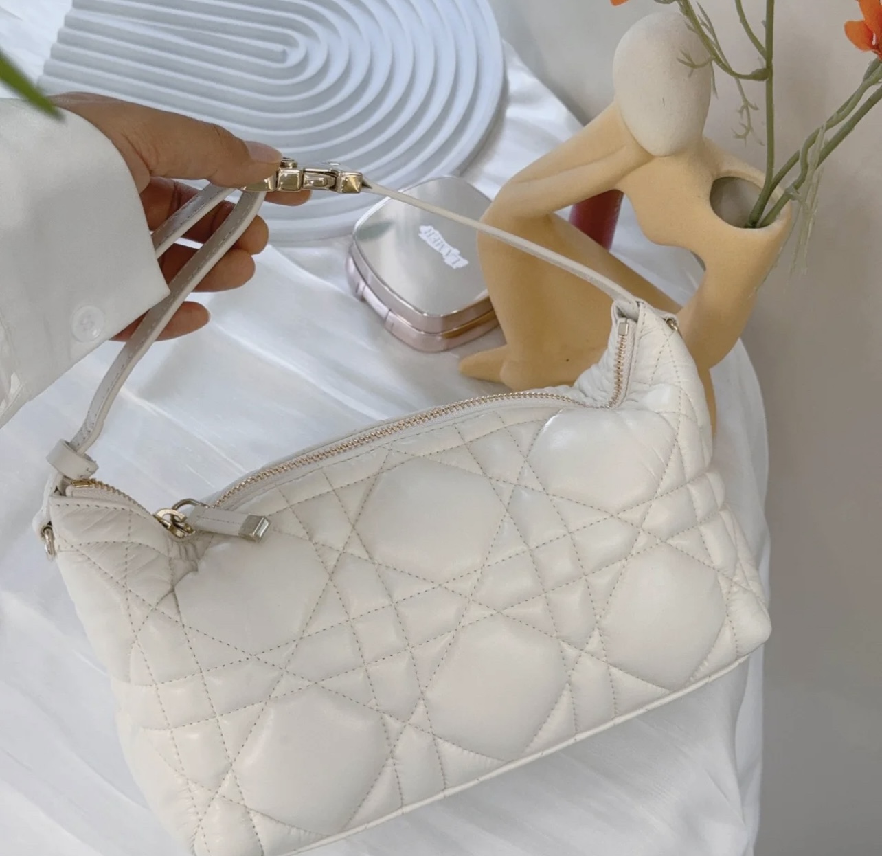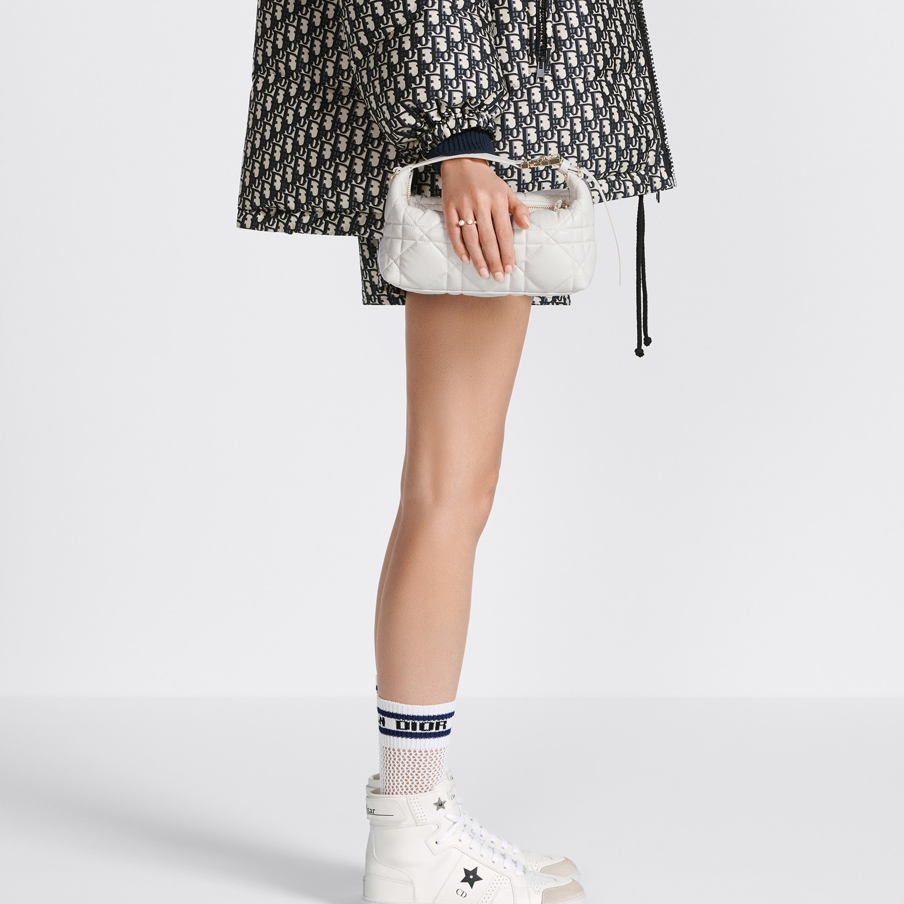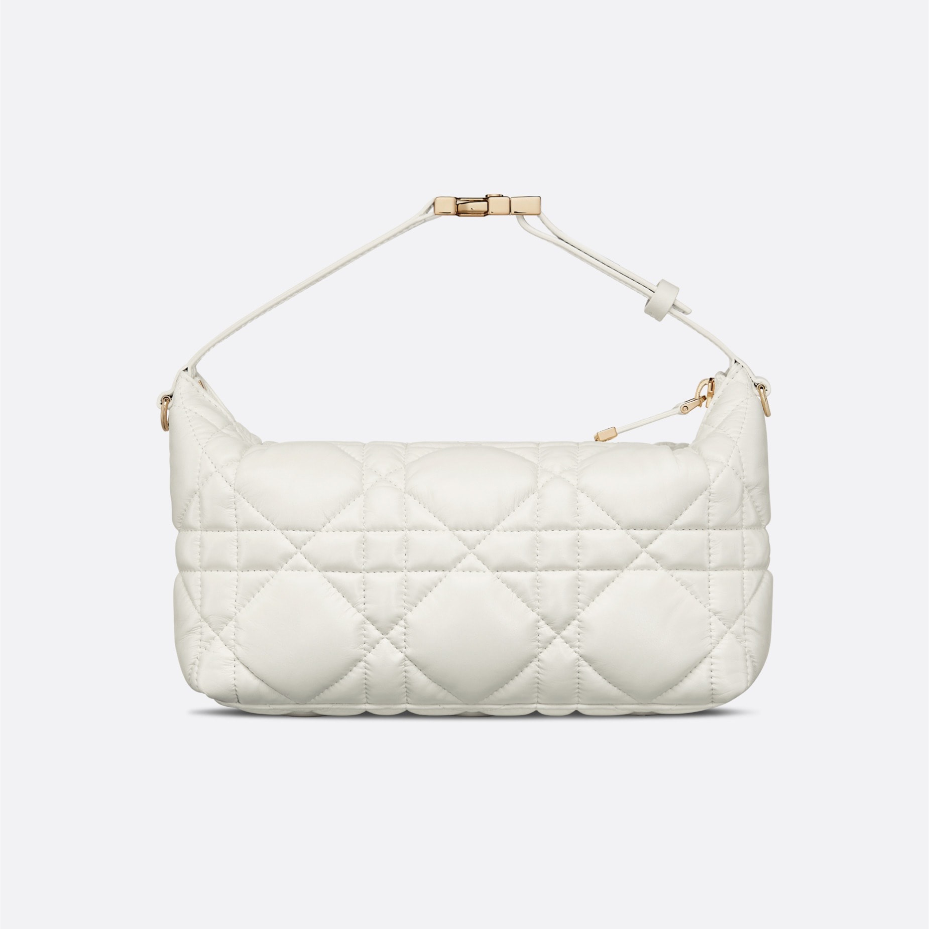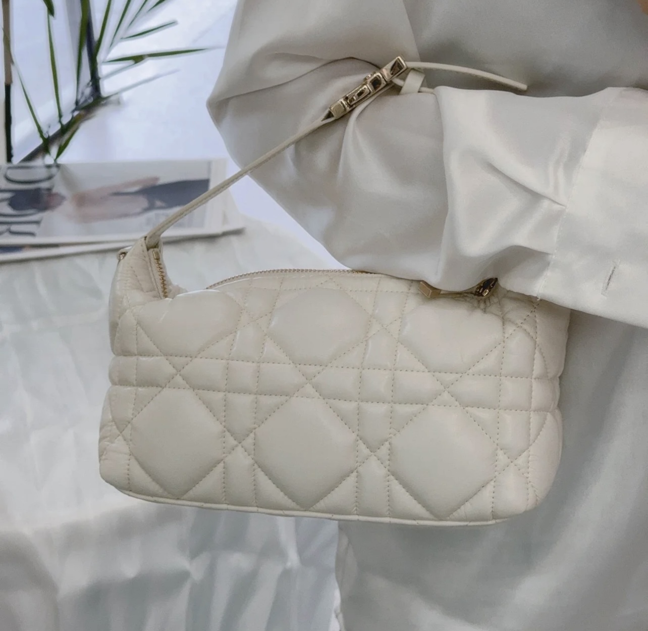 Designed by Maria Grazia Chiuri, the DiorTravel Nomad Clutch is a chic statement piece that combines many elements. Crafted in creamy calfskin leather, it features an oversized cannage pattern with a distinctive quilted effect. It has ample space and a flexible shape to hold all your daily essentials. The medium size features a top handle with a military-style light gold finish metal CD buckle for easy hand or shoulder carry. Metal loops on both sides for the Dior embroidered shoulder strap.