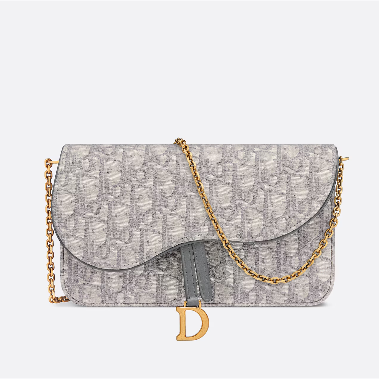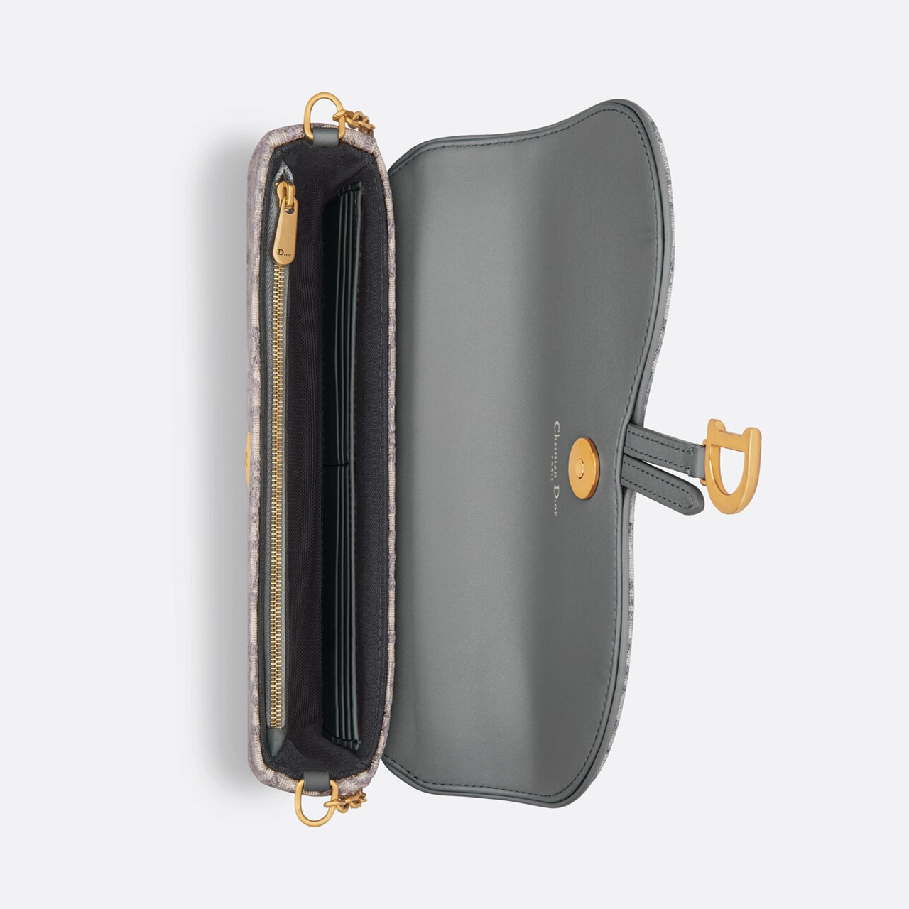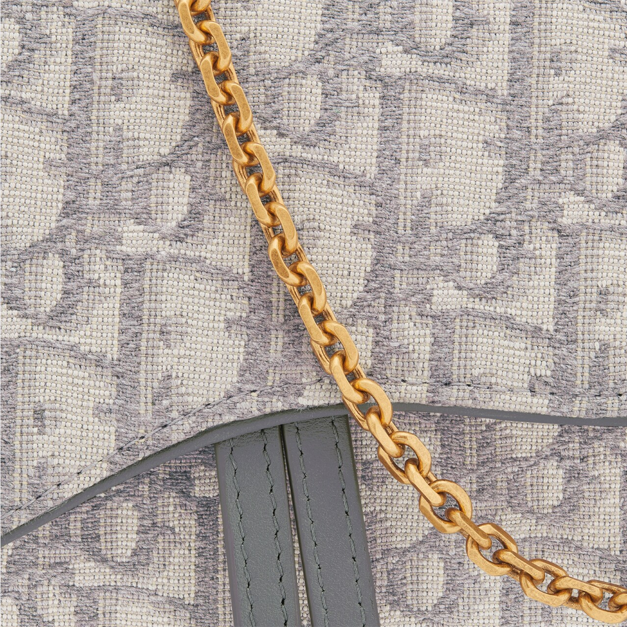 The sleek lines of this Saddle Chain Clutch make it a stylish and practical piece. Crafted in grey Oblique print fabric, it features an asymmetric flap and a metal stirrup D-shaped charm with antique gold finish. The spacious interior compartments can store all your daily necessities, and the chain makes it easy to carry on the shoulder or crossbody. Pair with other Saddle pieces to create a dazzling look.