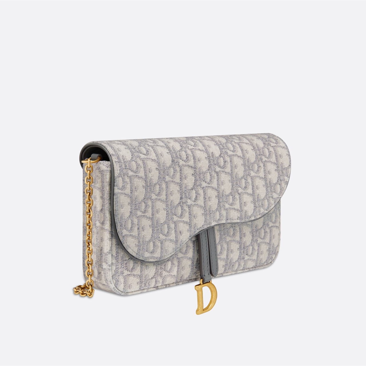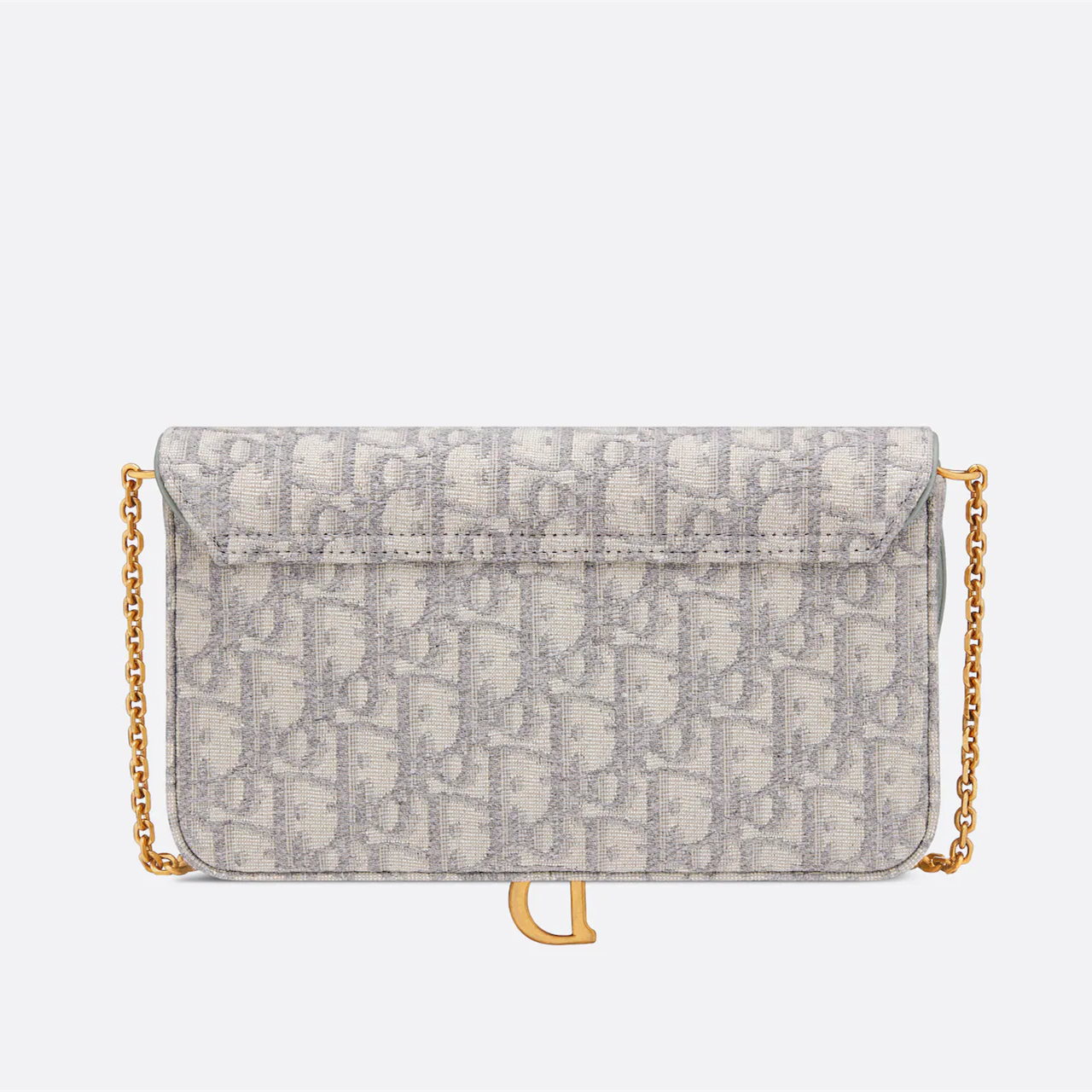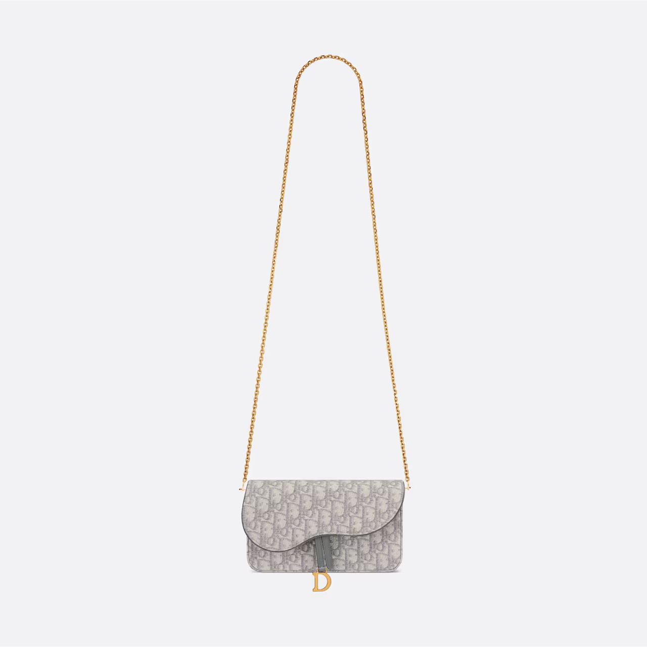 The sleek lines of this Saddle Chain Clutch make it a stylish and practical piece. Crafted in grey Oblique print fabric, it features an asymmetric flap and a metal stirrup D-shaped charm with antique gold finish. The spacious interior compartments can store all your daily necessities, and the chain makes it easy to carry on the shoulder or crossbody. Pair with other Saddle pieces to create a dazzling look.