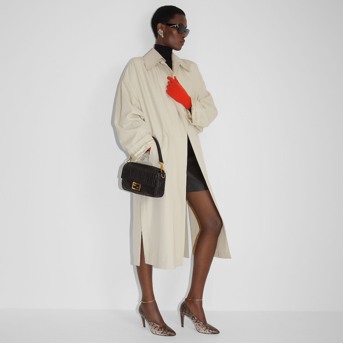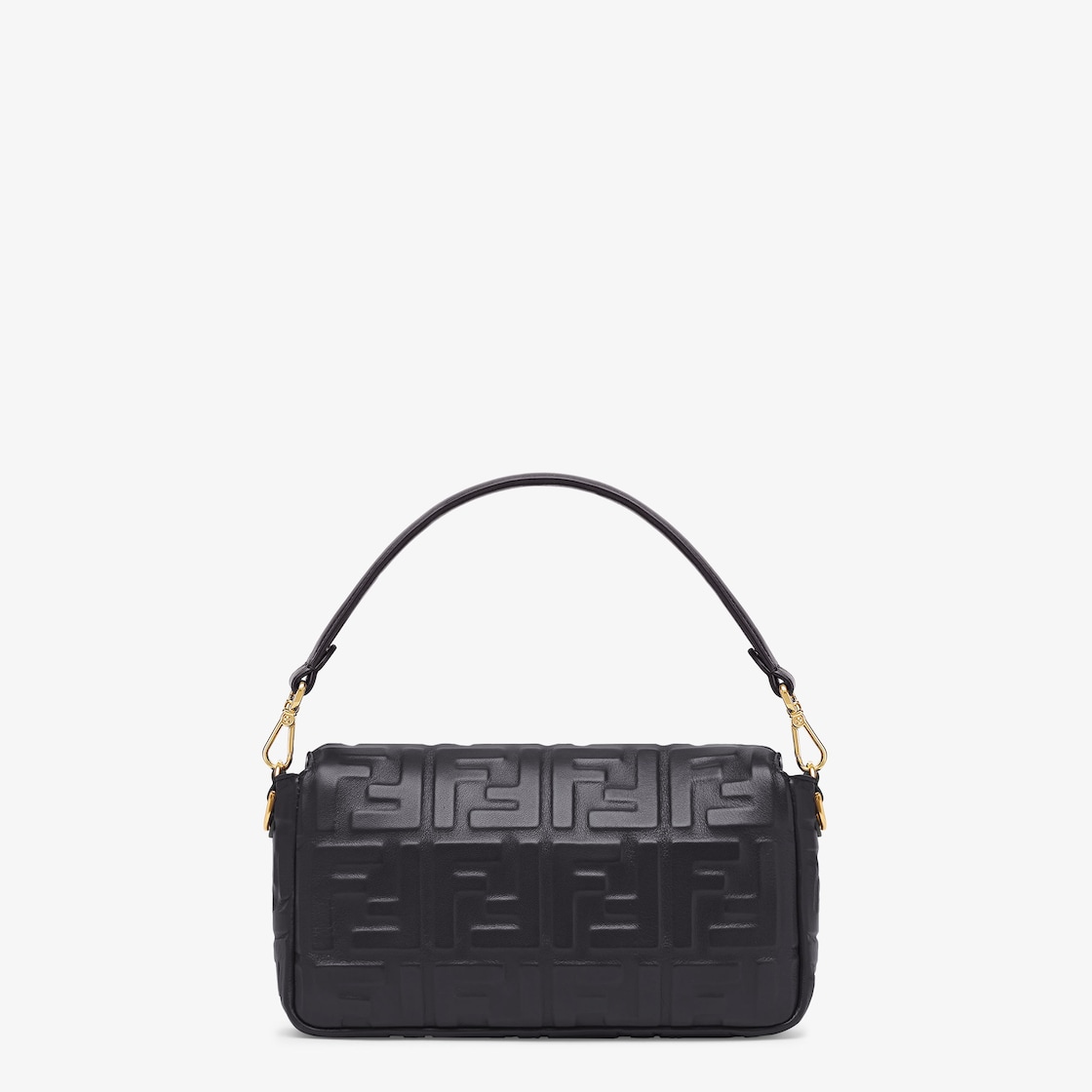 The iconic Baguette Medium Handbag, launched in 1997 and becoming a classic handbag of the brand. Inspired by the French Baguette bread and named after it, this handbag features the iconic "underarm" design, which is fashionable and versatile, showing classic charm. Made of soft black nappa leather, it is decorated with the iconic three-dimensional FF embossed pattern and embellished with FF buckle. It has a front flap, magnetic closure, a fabric-lined interior compartment with a zip pocket and gold-finished hardware. The handbag comes with a detachable handle and shoulder strap, which can be carried by hand, on the shoulder or crossbody.