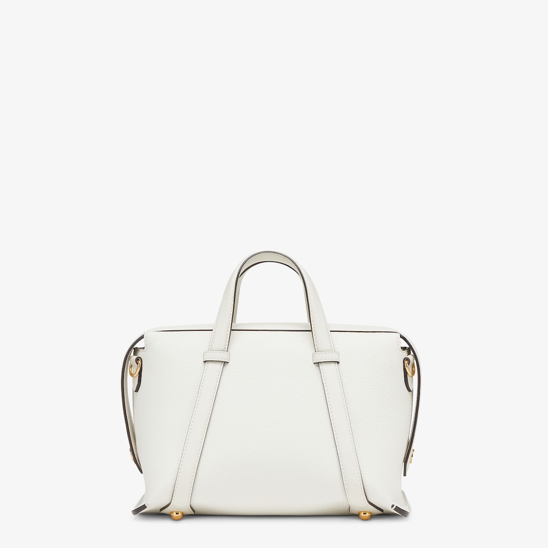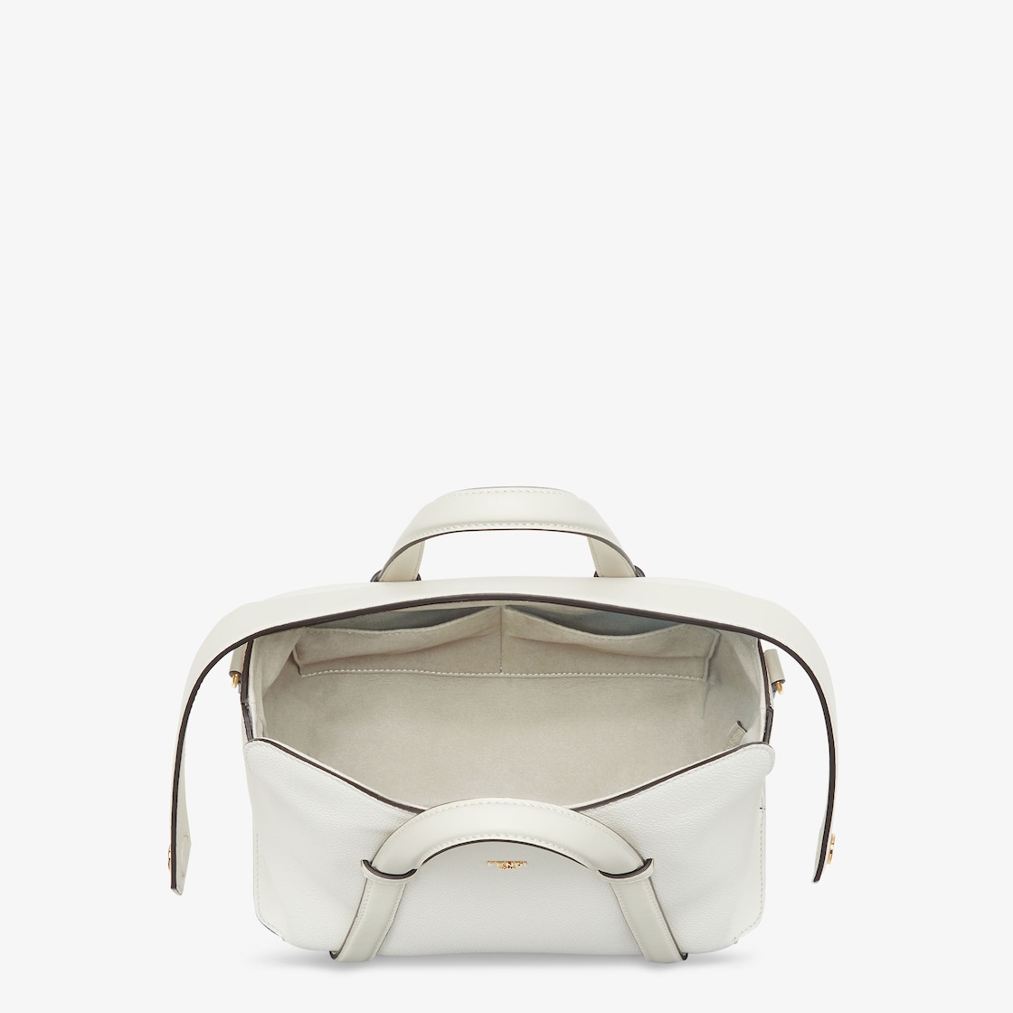 Medium Boston bag from the Stefano Pilati collaboration, in icy white full-grain leather with tone-on-tone glossy leather trim. Rectangular magnetic closure with magnetic clasps on the sides. One lined interior compartment, two flat pockets, metal foot and FENDI Roma logo, and gold-tone hardware. Double handles and adjustable, removable shoulder strap for hand or crossbody carry.