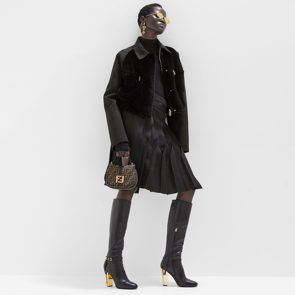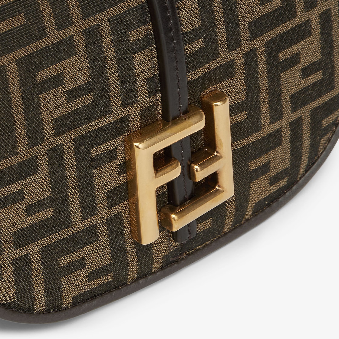 Small shoulder bag in FF jacquard fabric with feminine curved lines. Embossed brown leather details and trims, FF logo on flap. Magnetic closure. Flat pocket on back. Lined interior with flat pockets and antique gold hardware. Comes with an adjustable and removable leather shoulder strap. The shoulder strap hook adds an elegant touch, and the bag opens to reveal studs and FF logo.