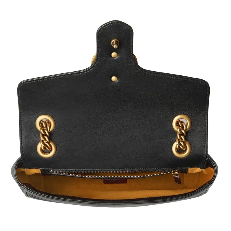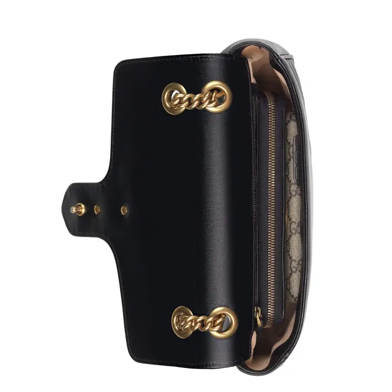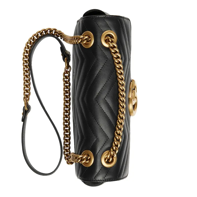 The small GG Marmont chain shoulder bag has a soft, structured shape and an oversized flap closure with Double G hardware. The sliding chain shoulder strap allows for versatile carry, from shoulder to hand. Made in wave-pattern quilted leather with GG logo on the back.