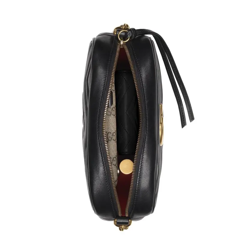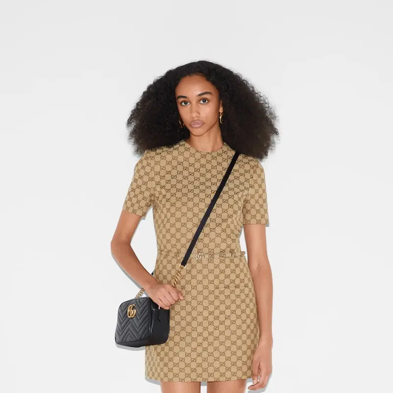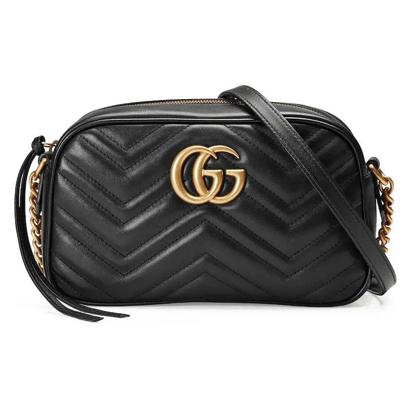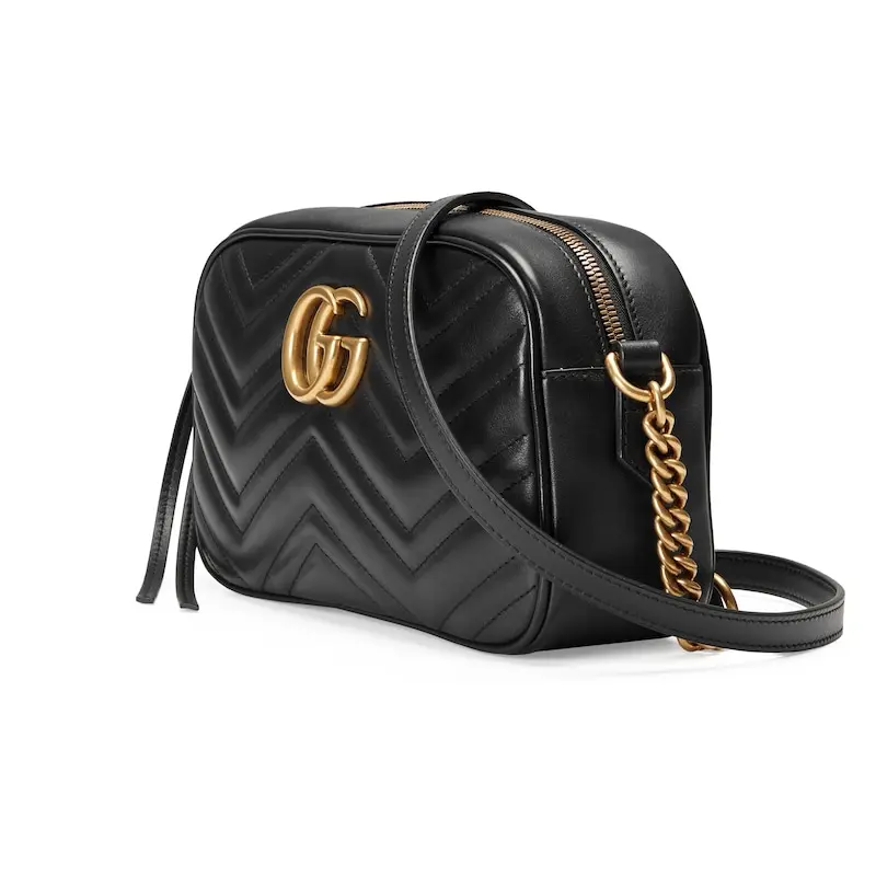 The GG Marmont chain mini shoulder bag has a soft, structured shape and an oversized flap closure with Double G hardware. The sliding chain shoulder strap allows for versatile carry, from shoulder to hand. Made of wavy quilted leather with GG logo on the back.