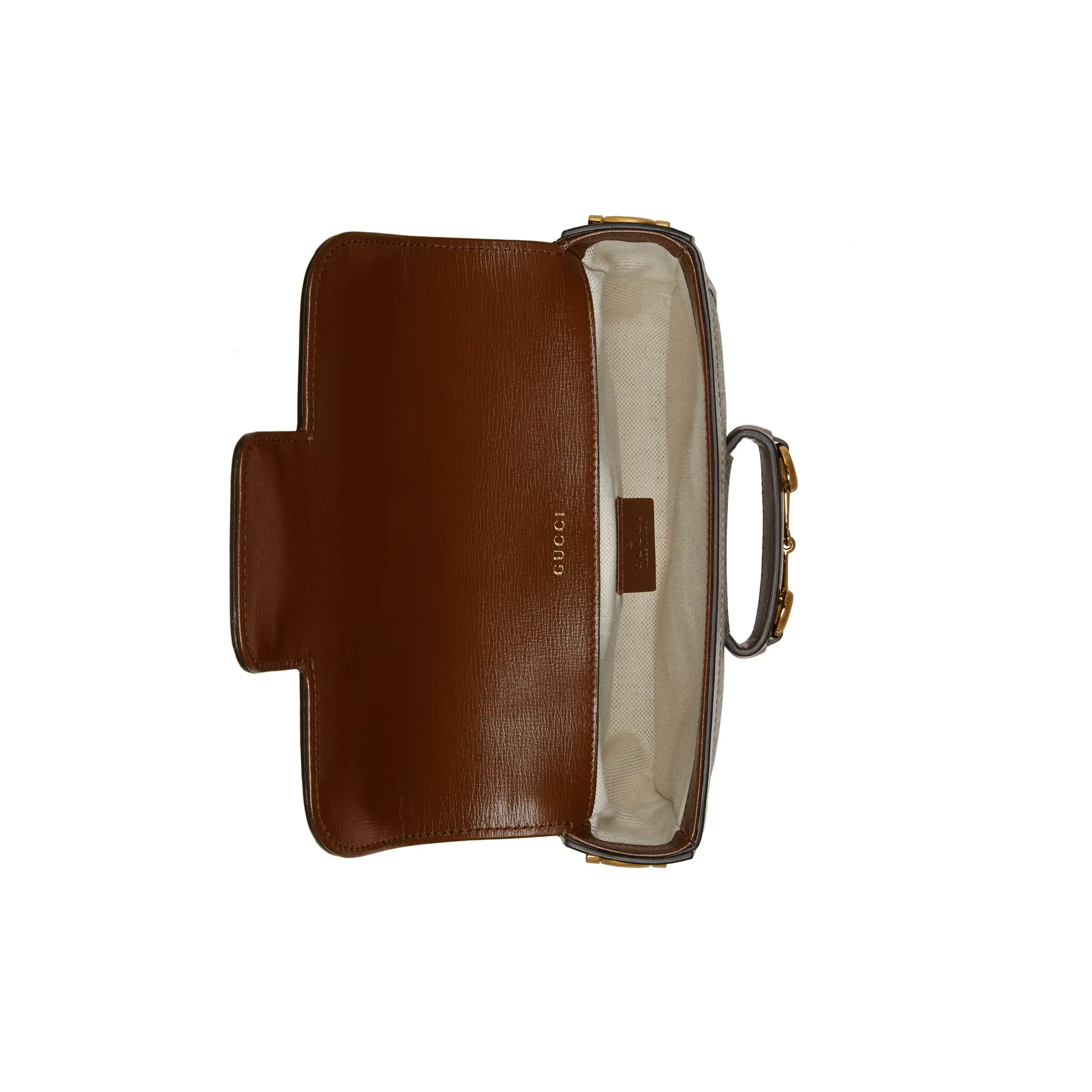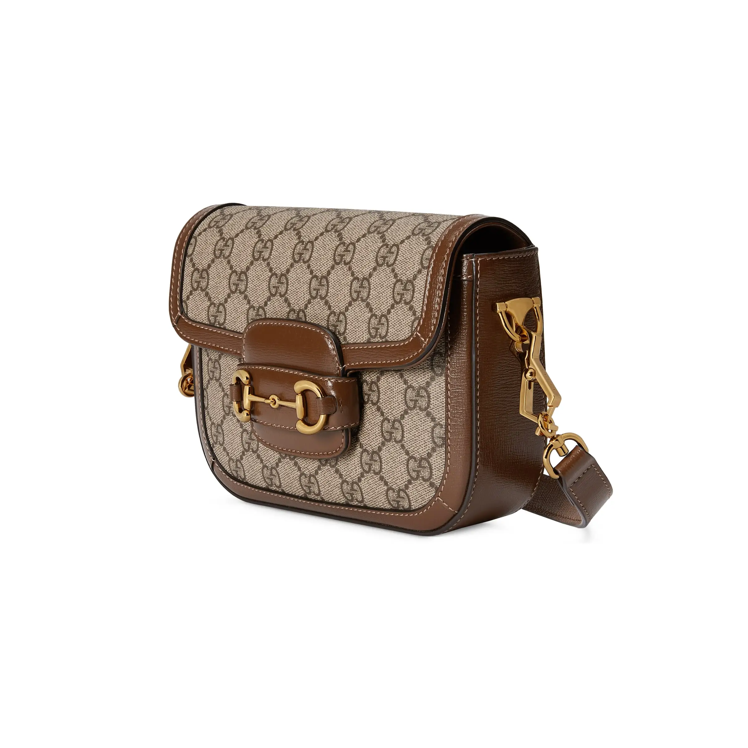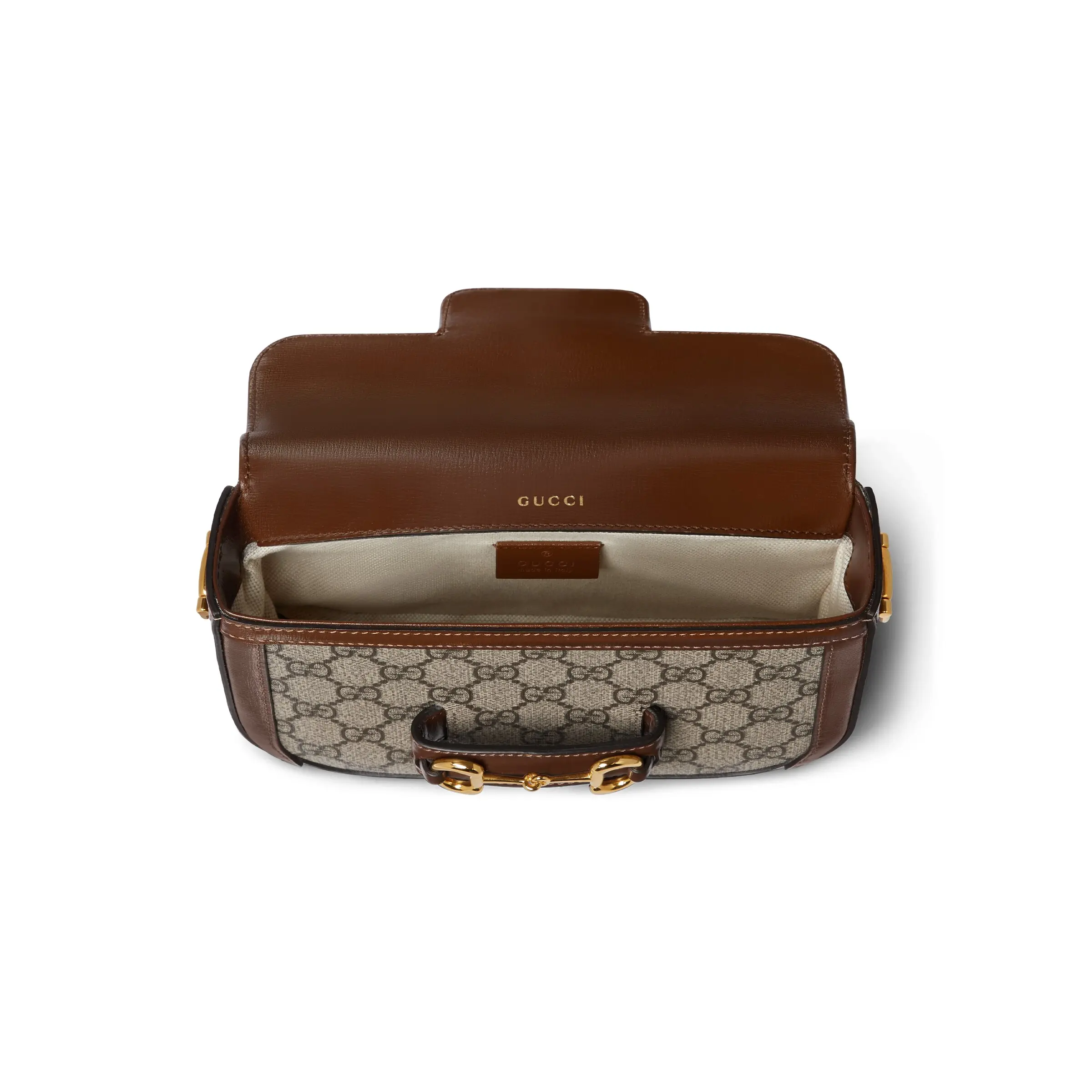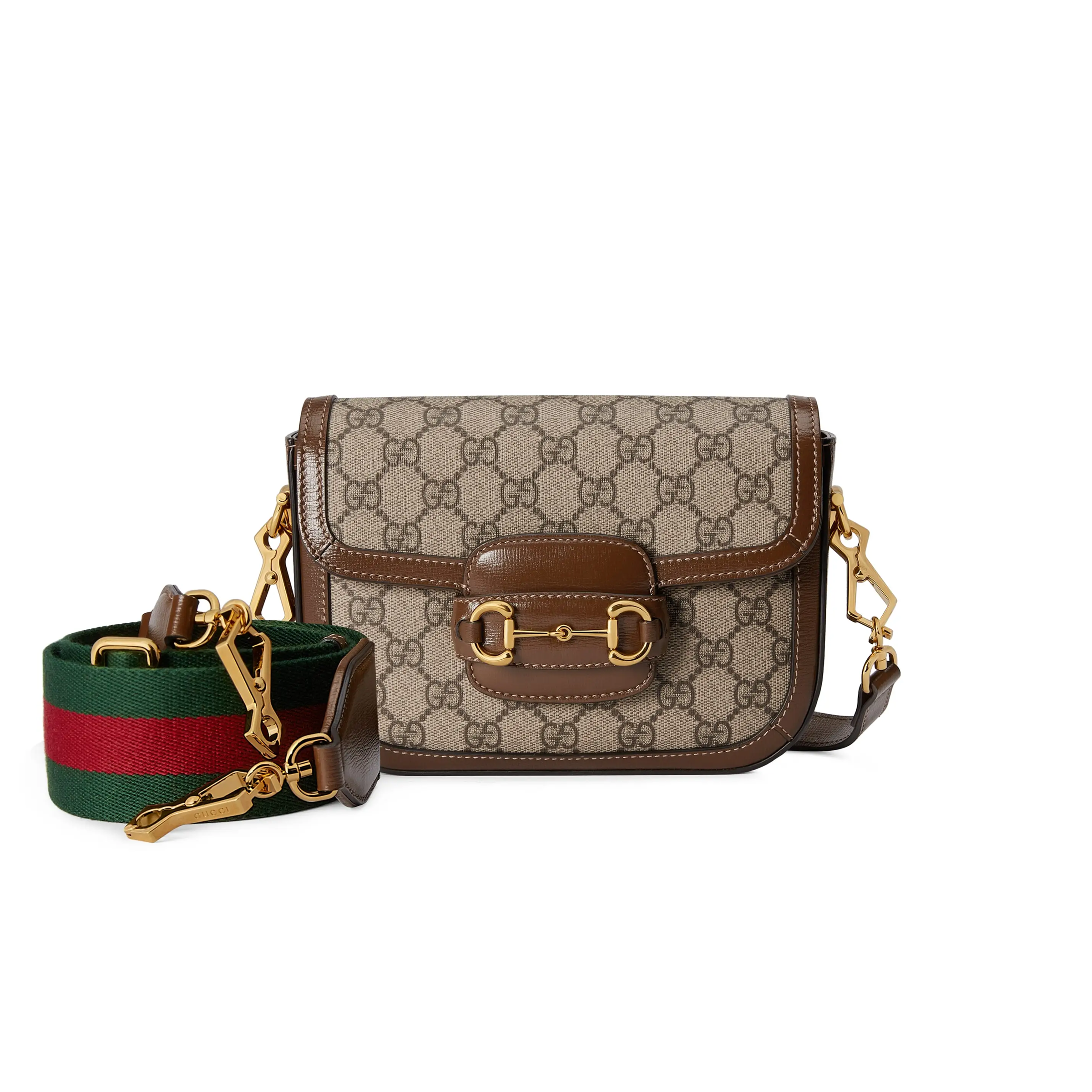 The Gucci Horsebit 1955 mini bag adds a mix-and-match touch to this vintage-inspired collection. This mini bag comes with two different shoulder straps, either a tonal leather strap for understated elegance or a red and green web strap for a strong brand identity. The bag is made of canvas with a double G interwoven pattern and trimmed with brown leather.