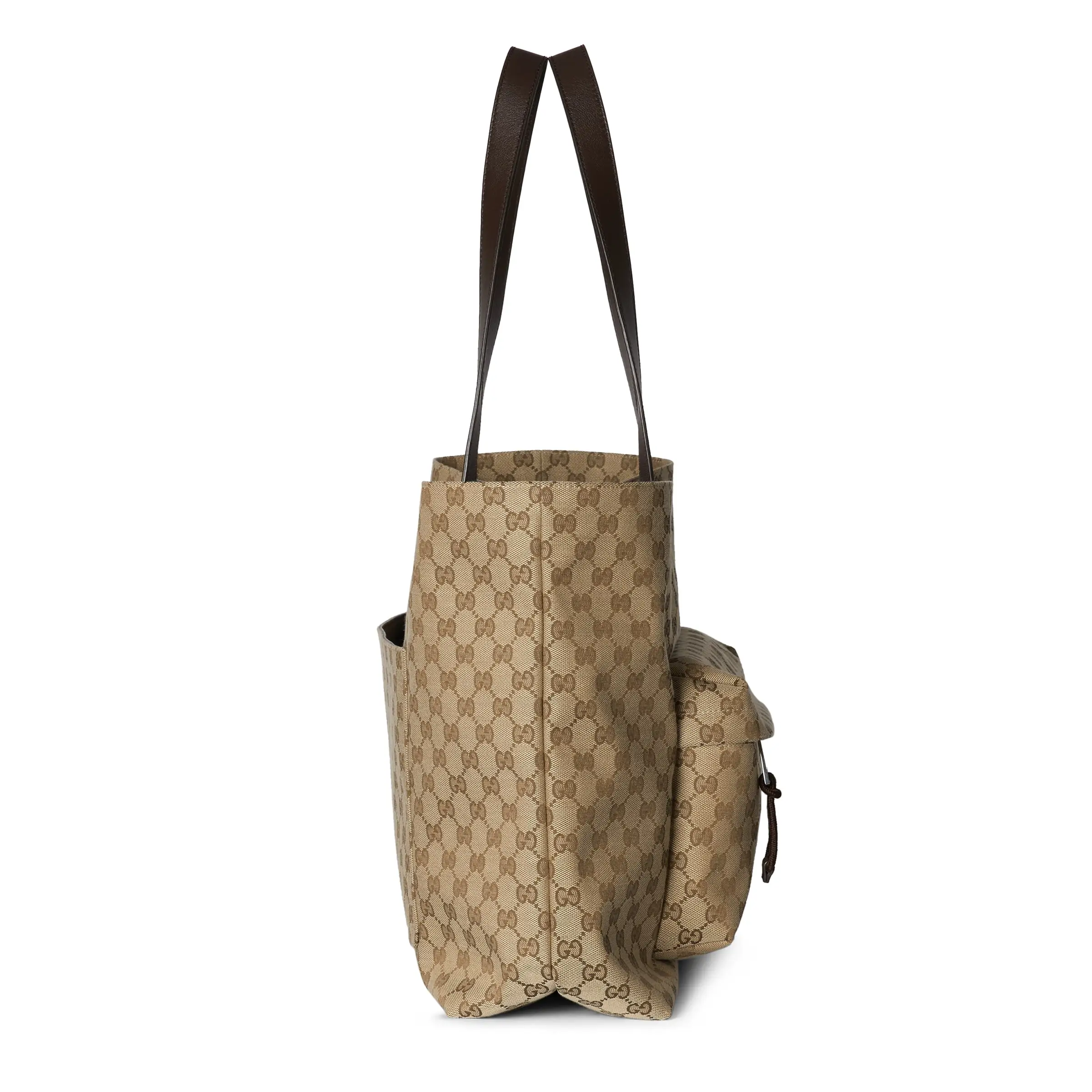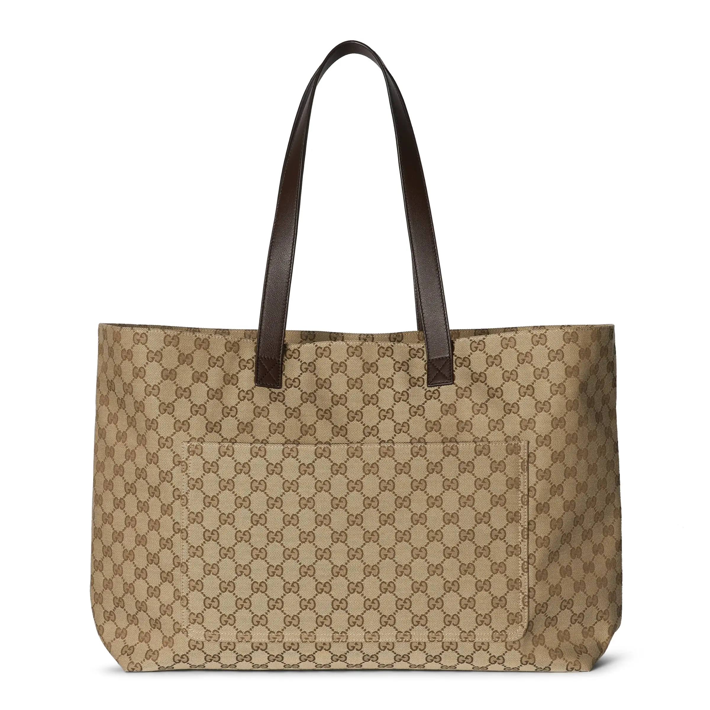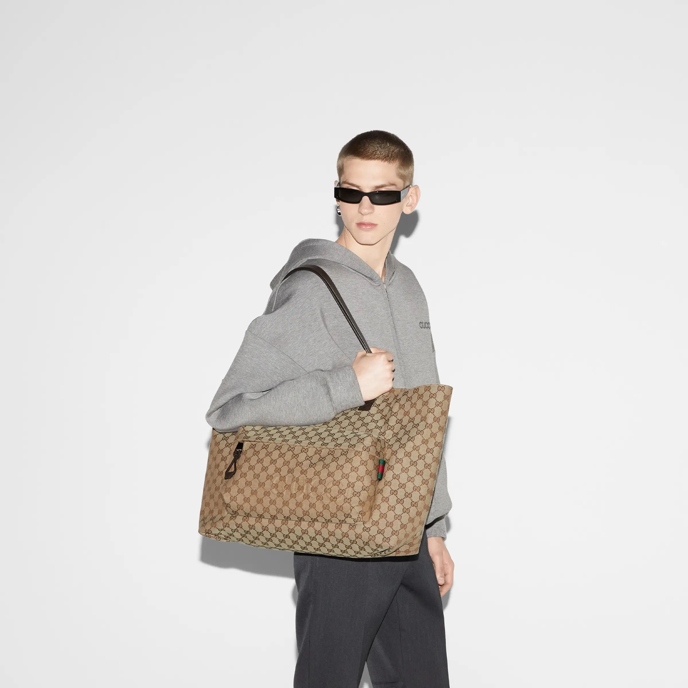 A classic piece from the Fall/Winter men's collection brings a sporty vibe to life. Made from Original GG canvas, the collection features timeless silhouettes in select colors and sophisticated details like the Web and embossed Gucci logo. This large tote is crafted from beige and ebony canvas with pockets and top handles.