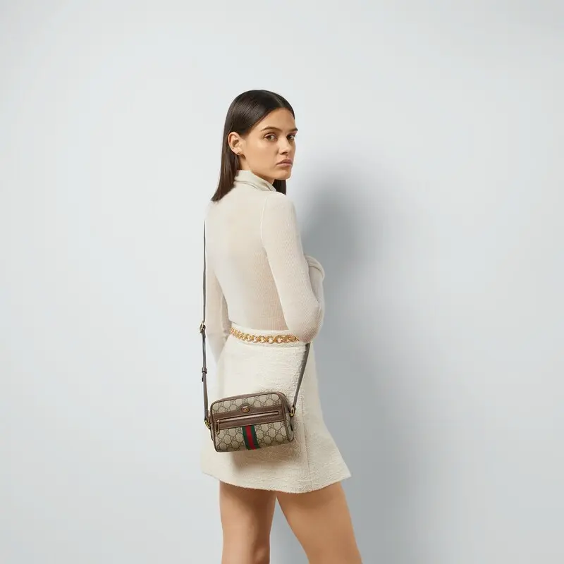 The Ophidia collection welcomes a new member - a mini handbag in GG Supreme canvas with striped web details. The GG logo, which was introduced in the 1970s, evolved from the early Gucci diamond quilting that began in the 1930s.
