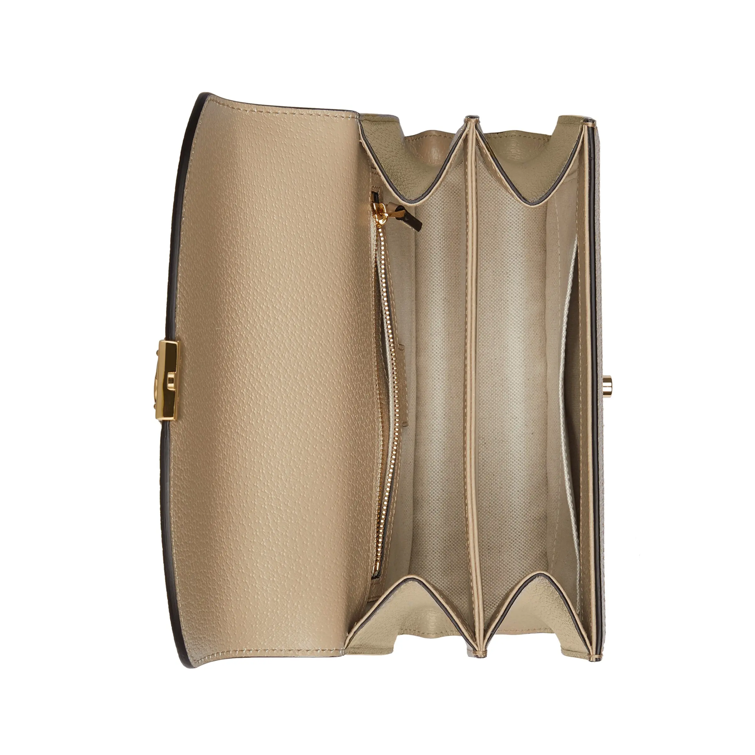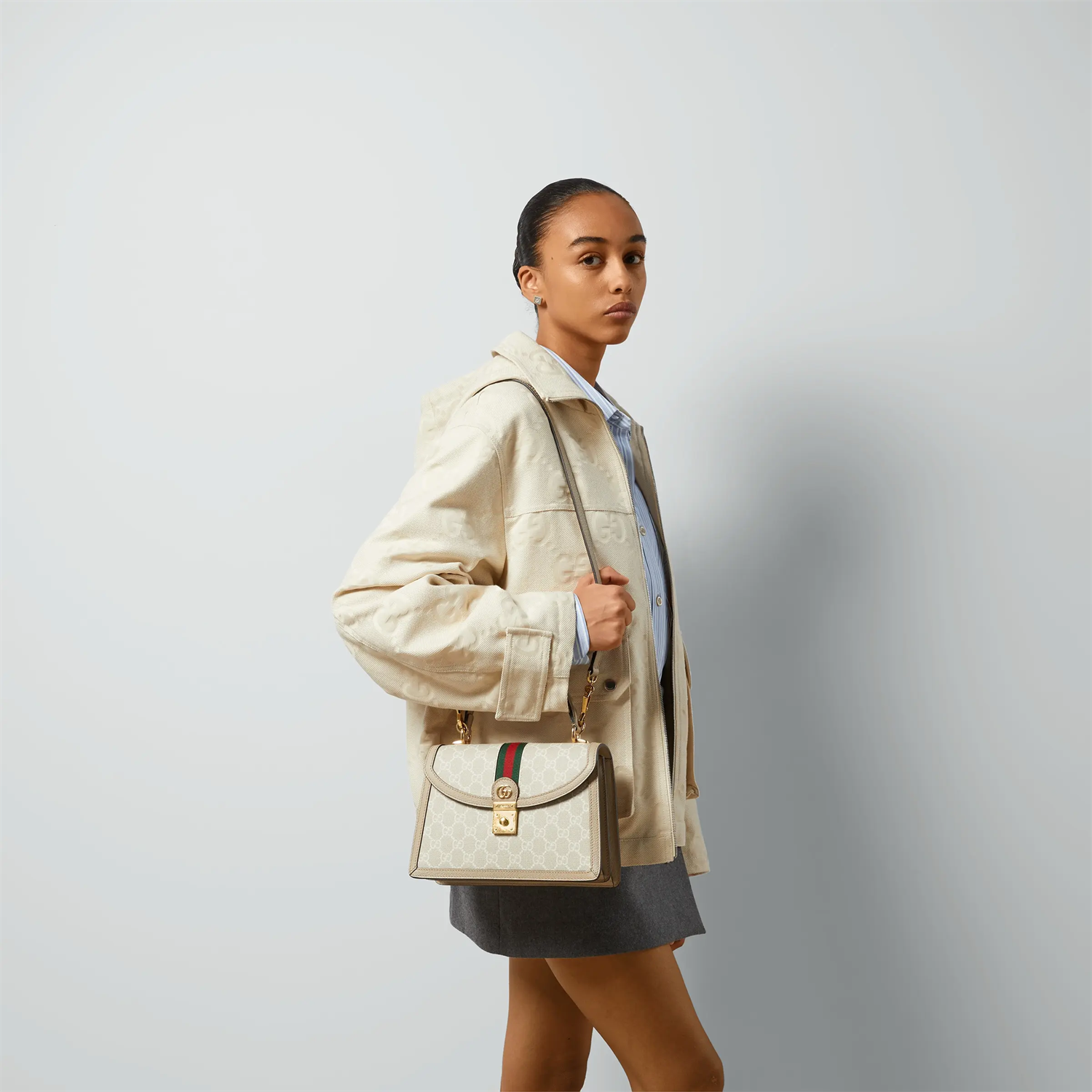 The new fashion collection "Gucci Love March" tells a moving story with color. GG Supreme canvas is a representative fabric of the brand, which is inspired by the archival design of the 1930s. The classic beige and ebony design has been reinterpreted as a fresh combination of beige and white, conveying the brand's timeless design essence. This pattern also becomes a signature highlight on this Ophidia series small handbag.