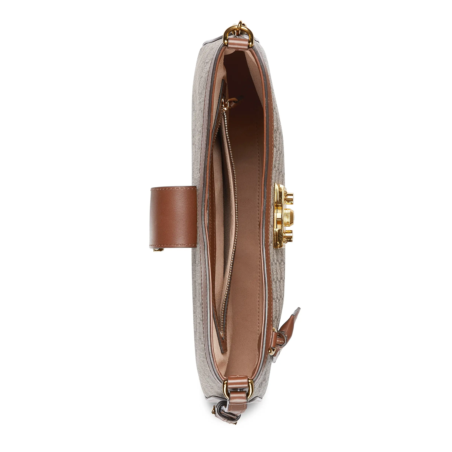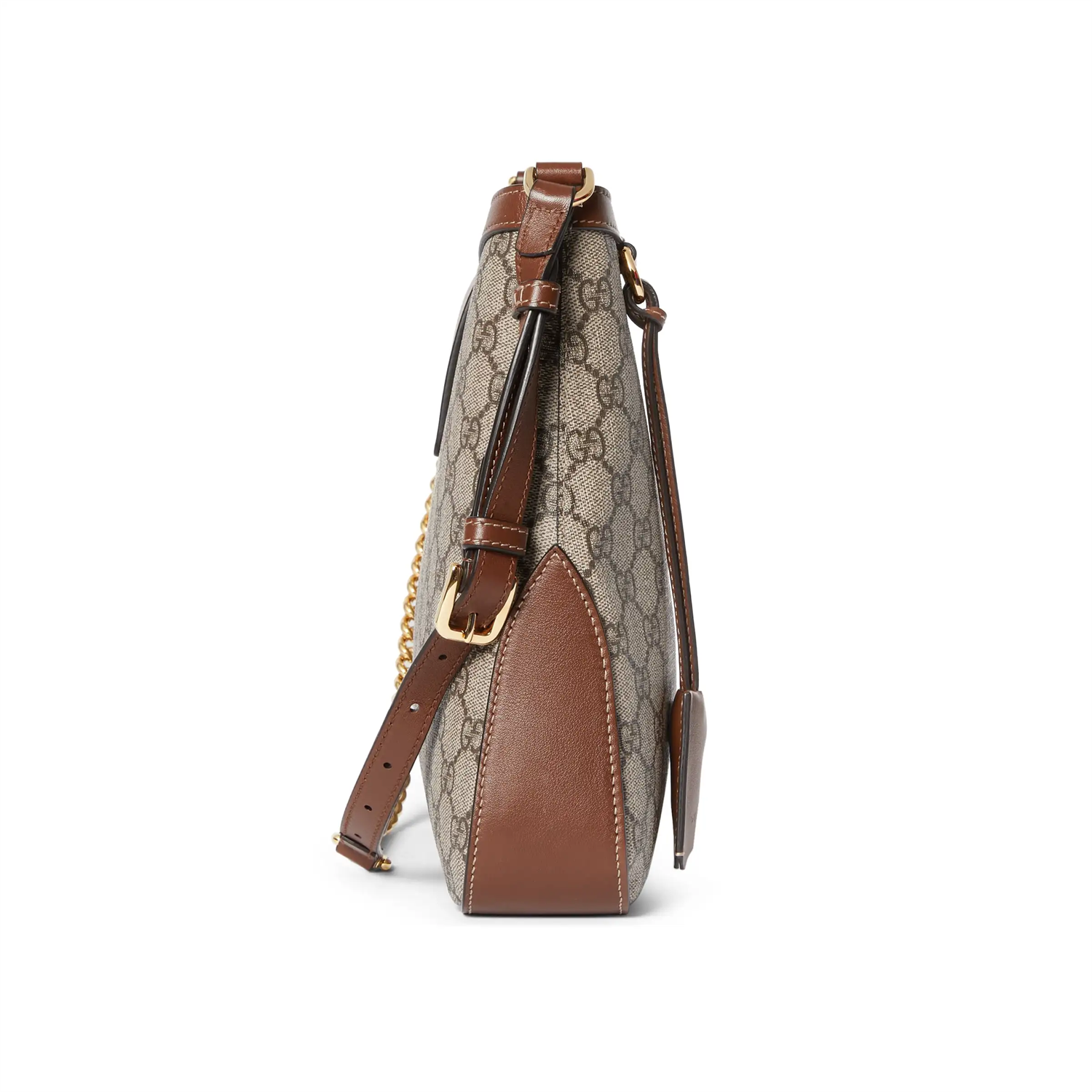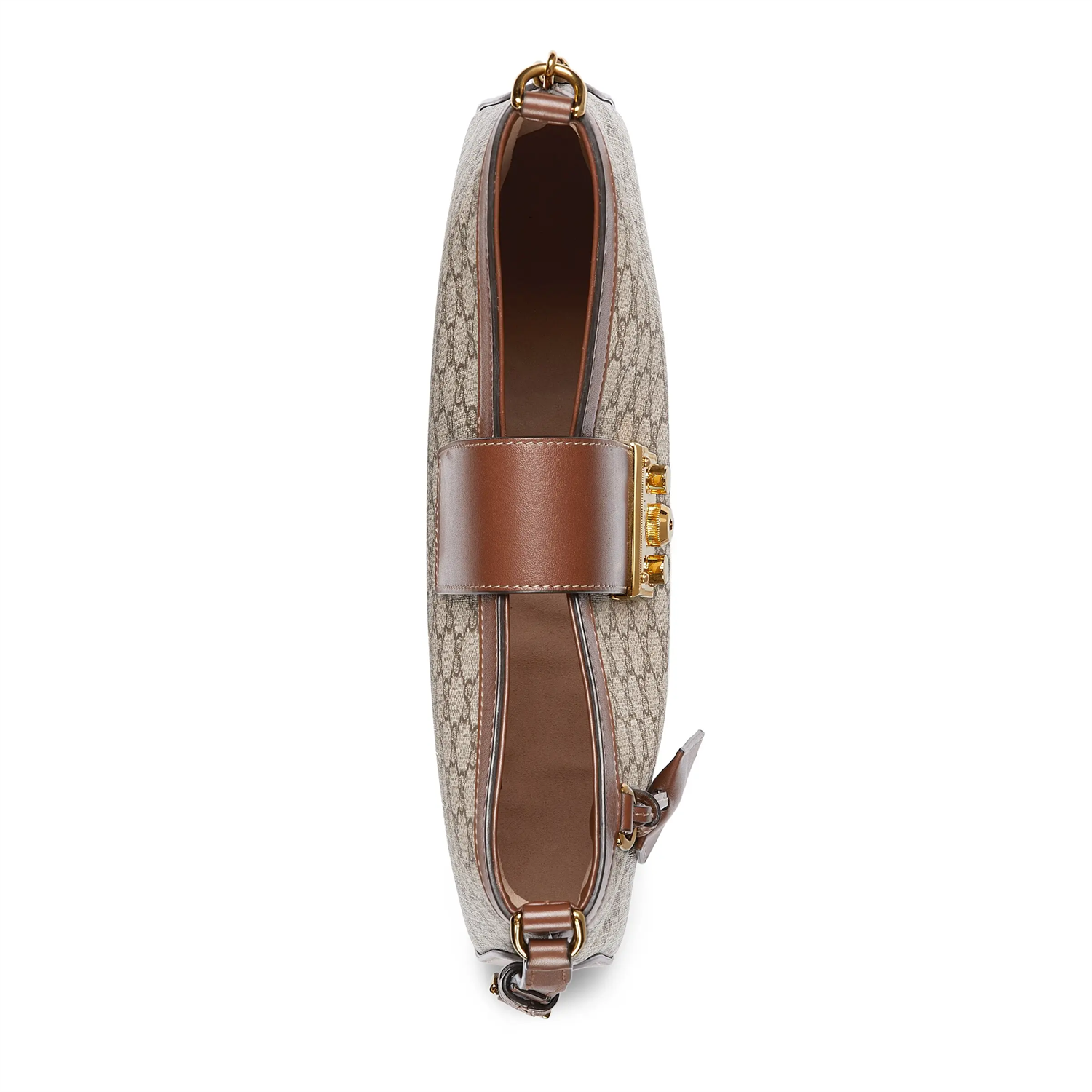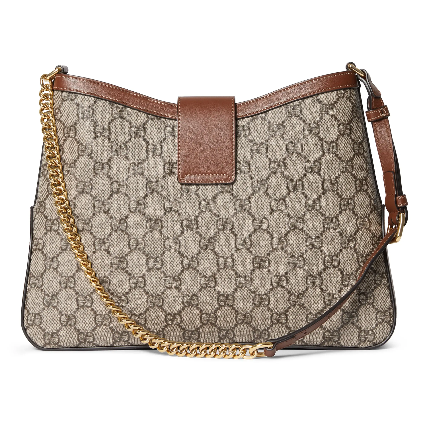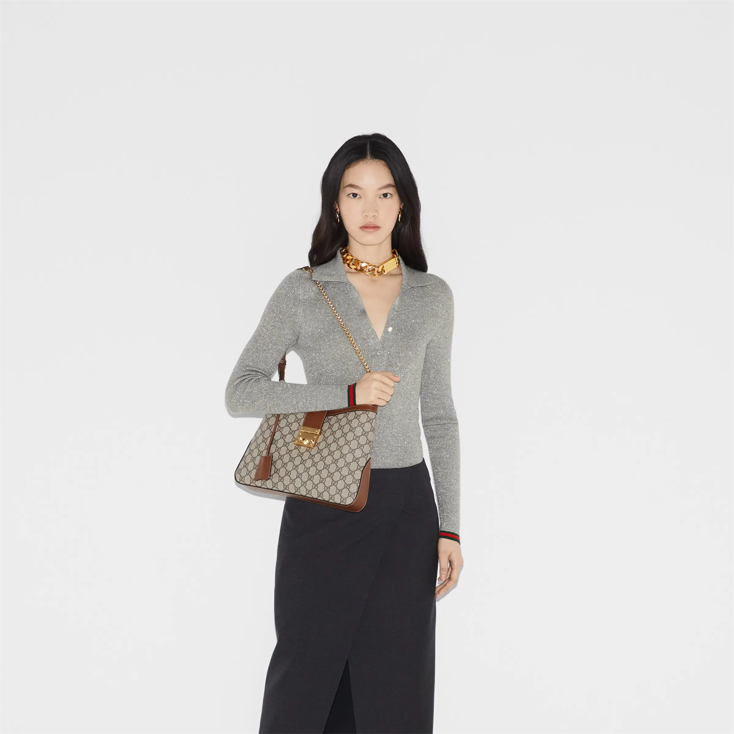 This shoulder bag in GG Supreme canvas is embellished with a padlock closure, a nod to the brand's heritage as a luggage atelier. Gold-tone hardware and brown shiny leather piping complement the chain and leather shoulder strap.