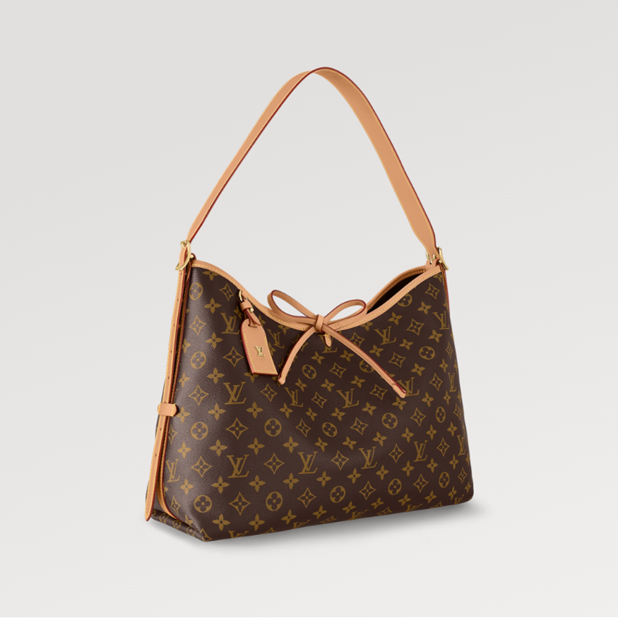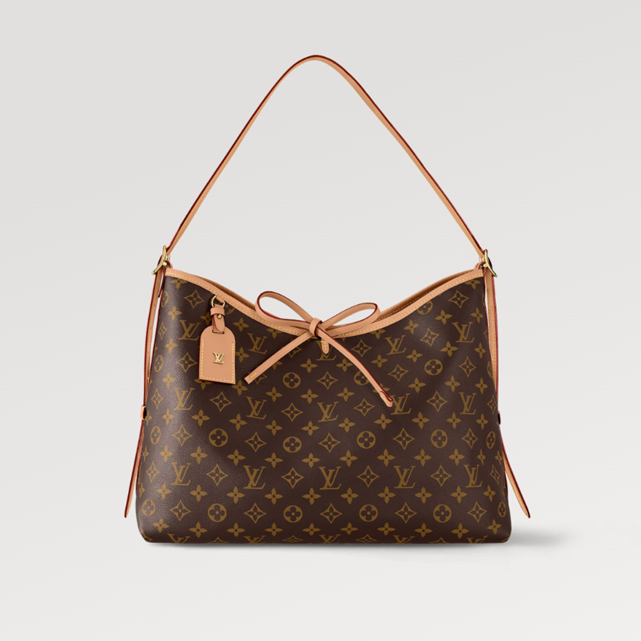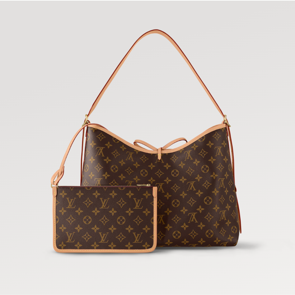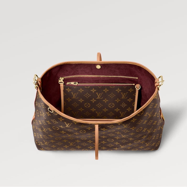 Louis Vuitton presents this medium CarryAll bag in Monogram canvas and leather trims for a close fit. It has a spacious interior zip pocket, a detachable zip clutch for added functionality, and a buckle for adjustable handle length.