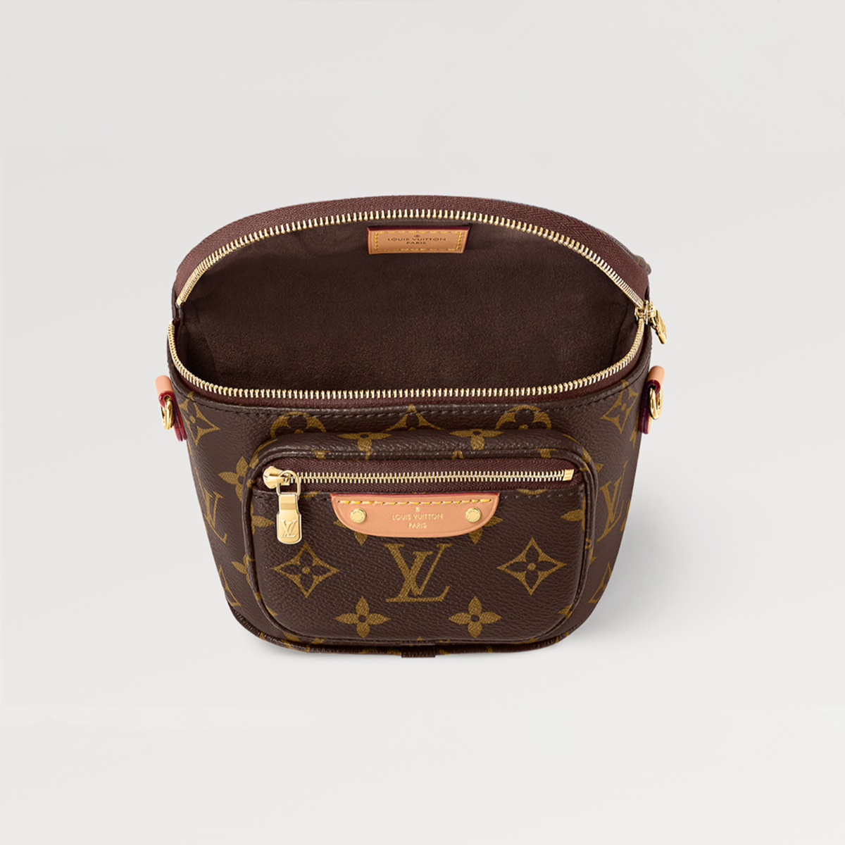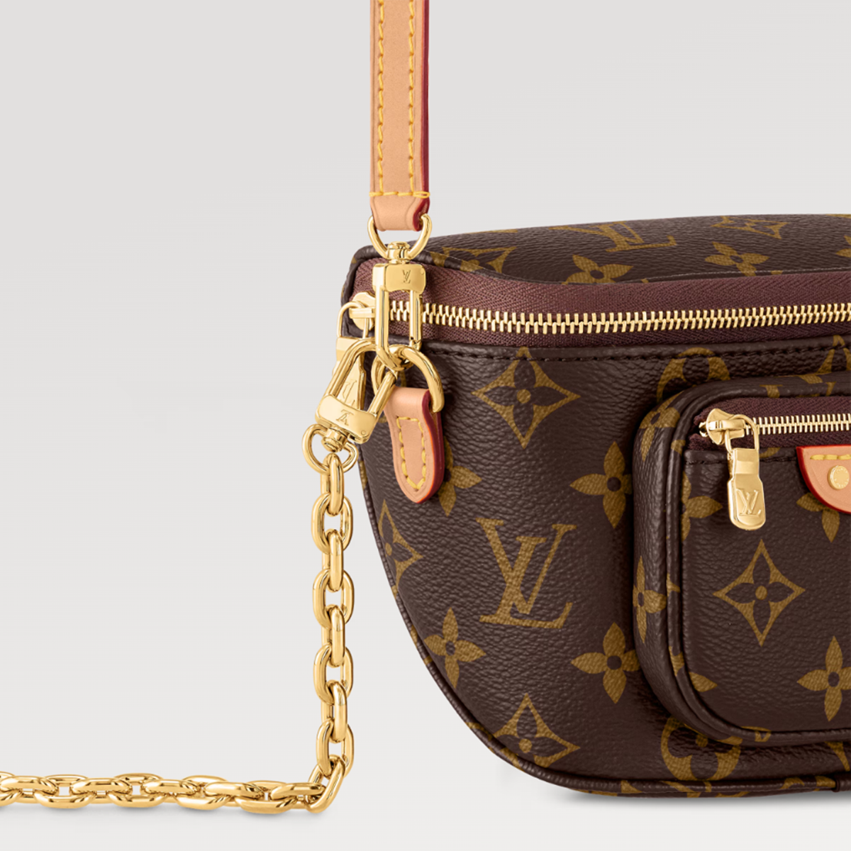This Mini Bumbag is made of Monogram canvas, showing Louis Vuitton's soft interpretation of the trendy waist bag design. It has a zippered main compartment and a zippered pocket, and is decorated with an embossed leather label. The iconic leather is cut into a detachable and adjustable shoulder strap, and the detachable chain adds functionality while being decorative.