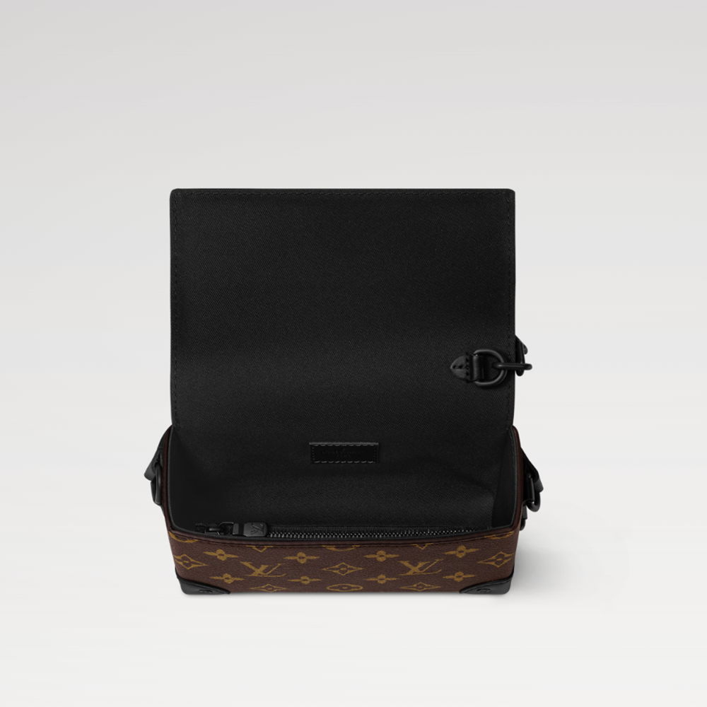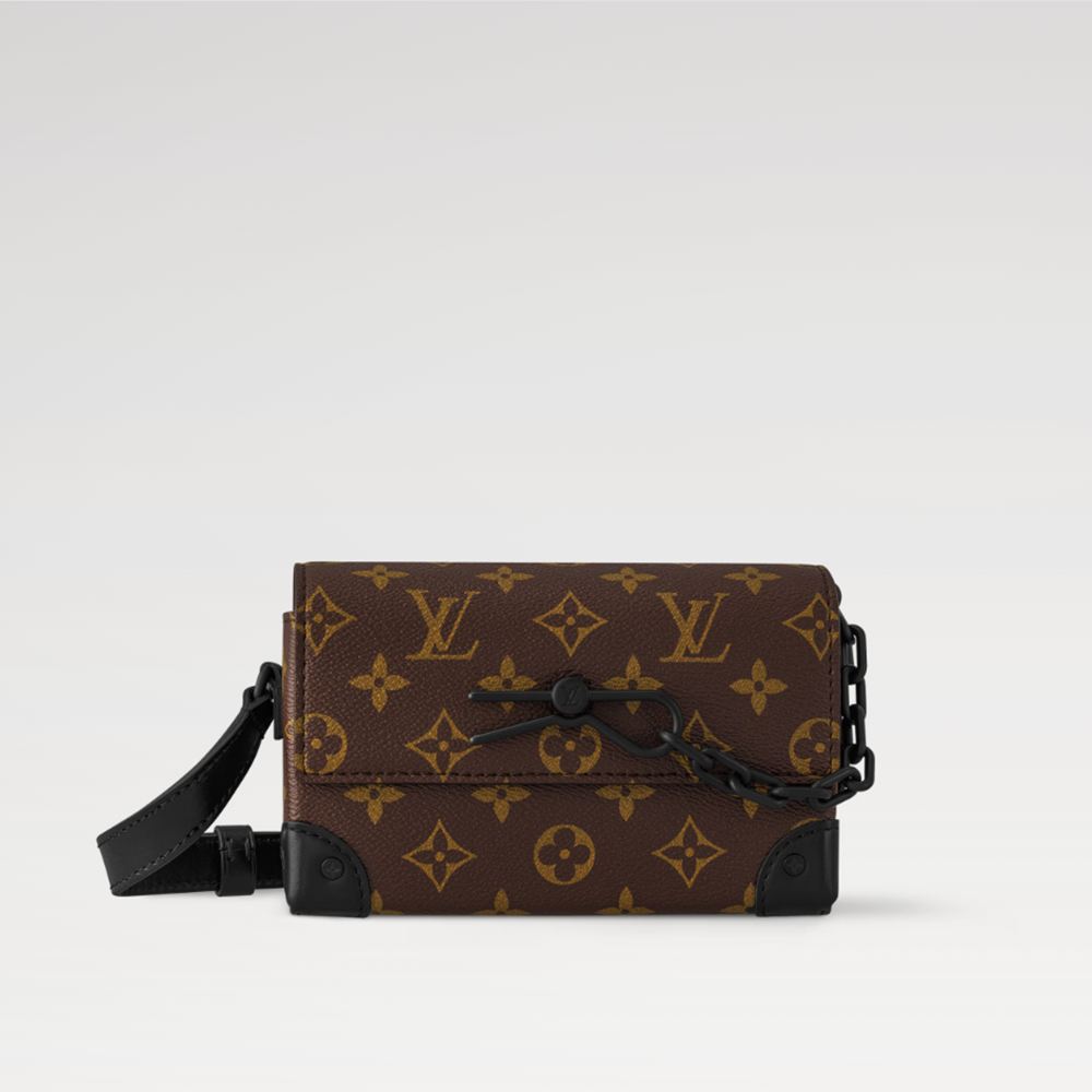 The Steamer mini bag is made of Monogram Macassar canvas and is recognizable by its decorative chain and pins. The reinforced corners are a reference to the brand's box-making tradition, the magnetic clasp design allows for easy access to small items, and the adjustable shoulder strap allows for shoulder or crossbody options.