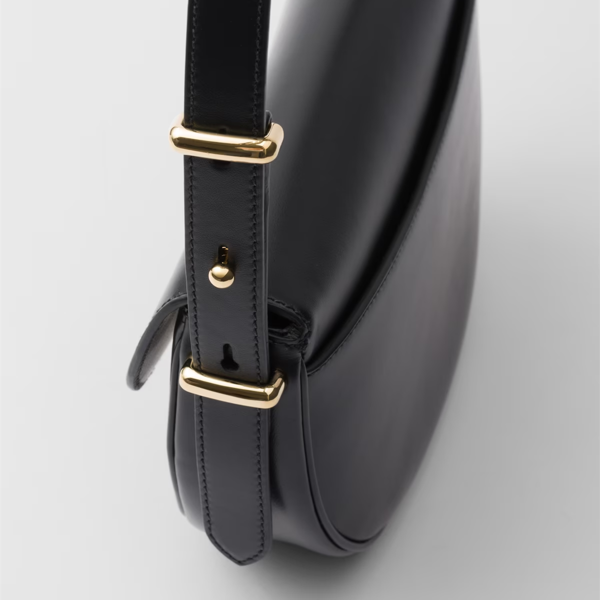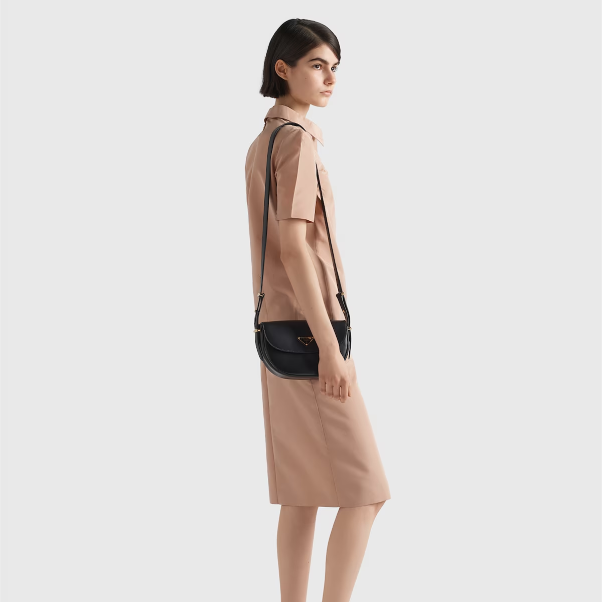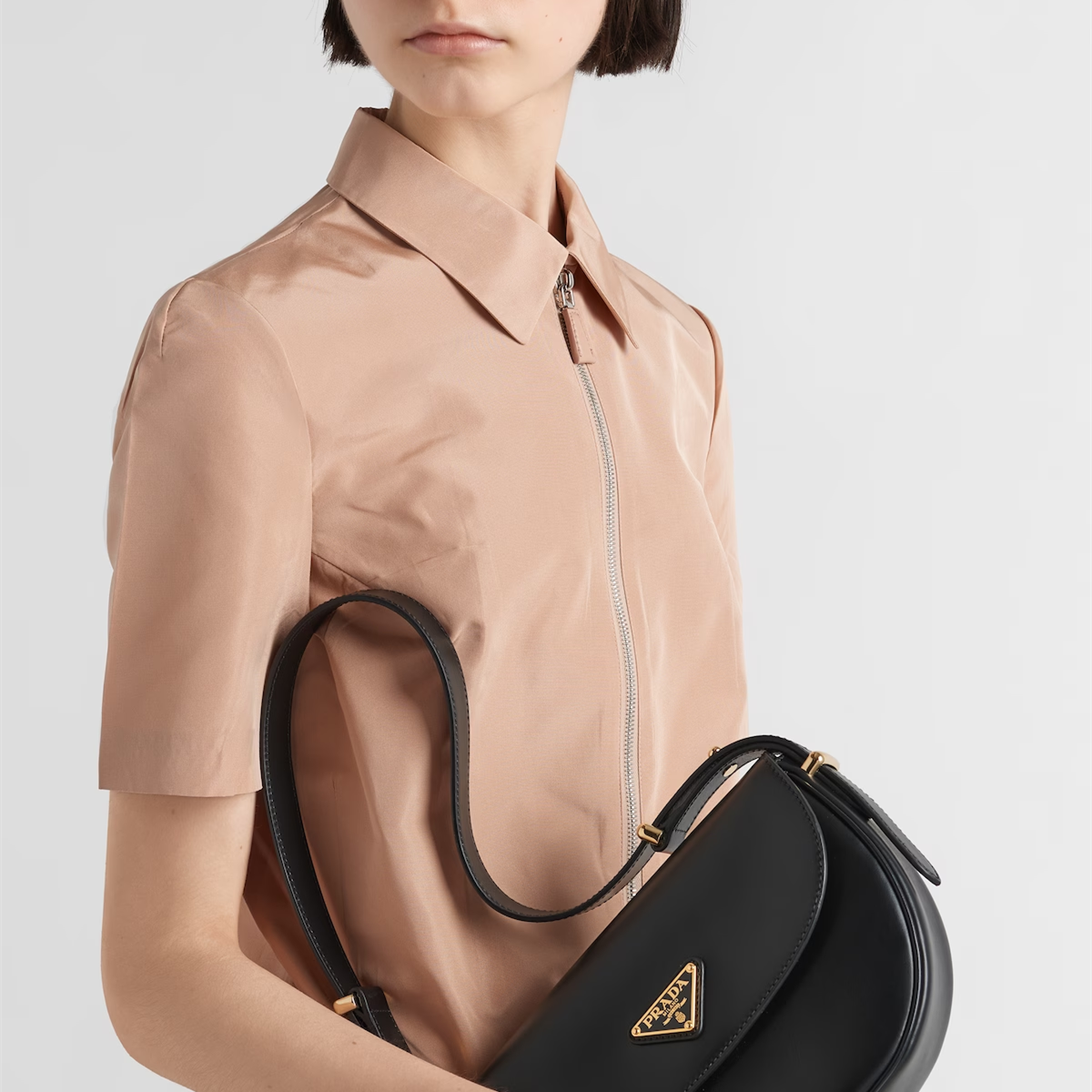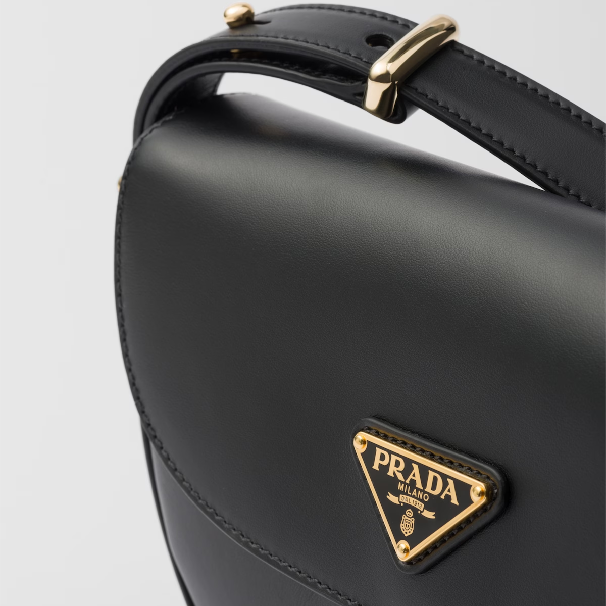 Refined and versatile, this leather handbag features smooth lines, a compact shape and a clear structure. The flap handbag has a leather interior and an elegant adjustable handle, which can be easily converted into a shoulder bag or a crossbody bag. Its simple and exquisite details are a unique expression of the brand's exquisite craftsmanship. The contemporary design is embellished with gleaming metal hardware and decorated with the iconic enameled triangle metal logo.