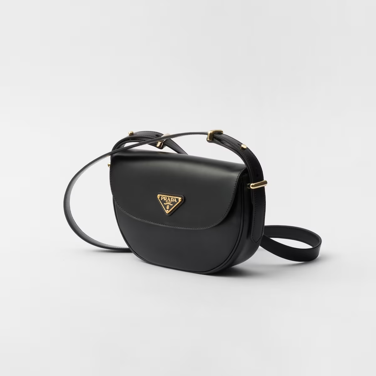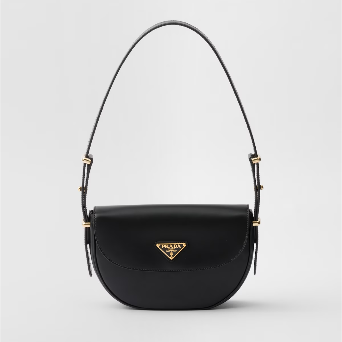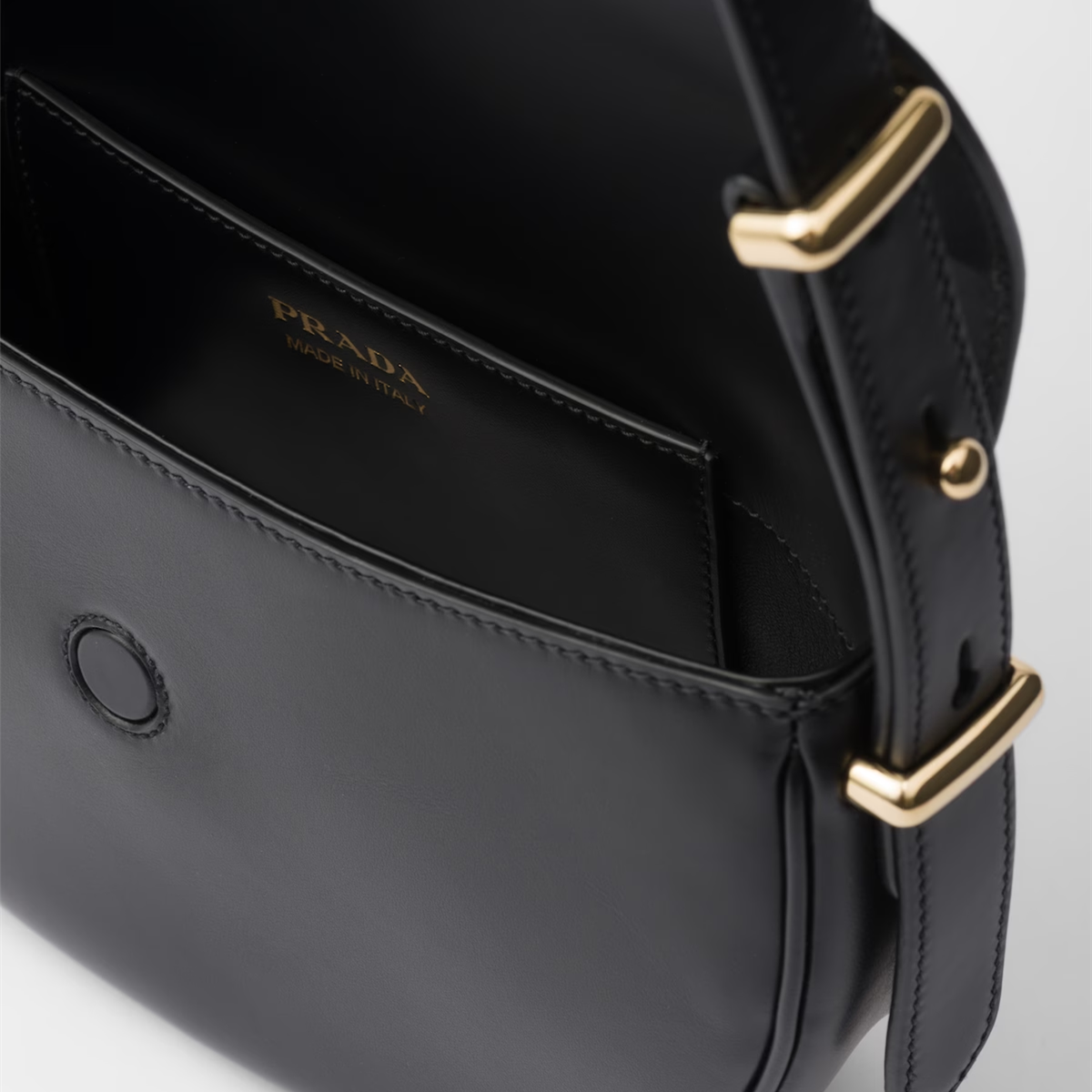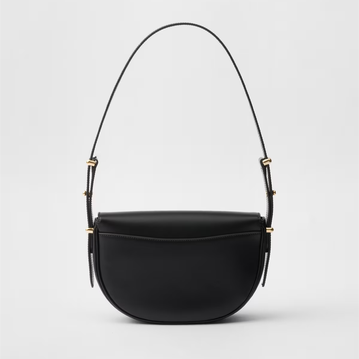 Refined and versatile, this leather handbag features smooth lines, a compact shape and a clear structure. The flap handbag has a leather interior and an elegant adjustable handle, which can be easily converted into a shoulder bag or a crossbody bag. Its simple and exquisite details are a unique expression of the brand's exquisite craftsmanship. The contemporary design is embellished with gleaming metal hardware and decorated with the iconic enameled triangle metal logo.