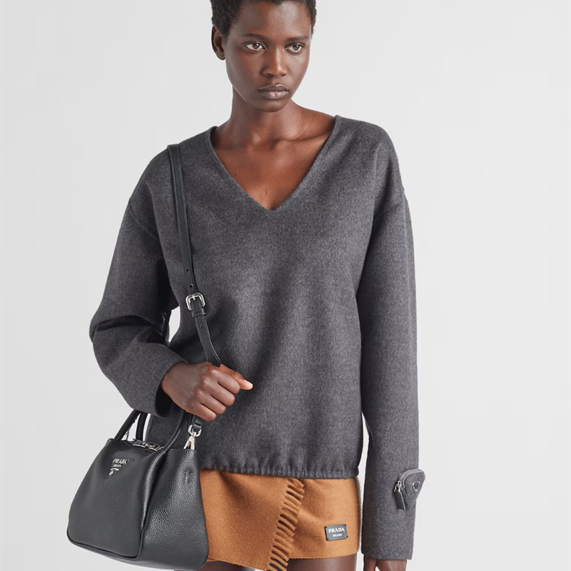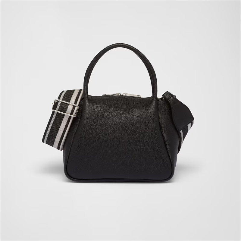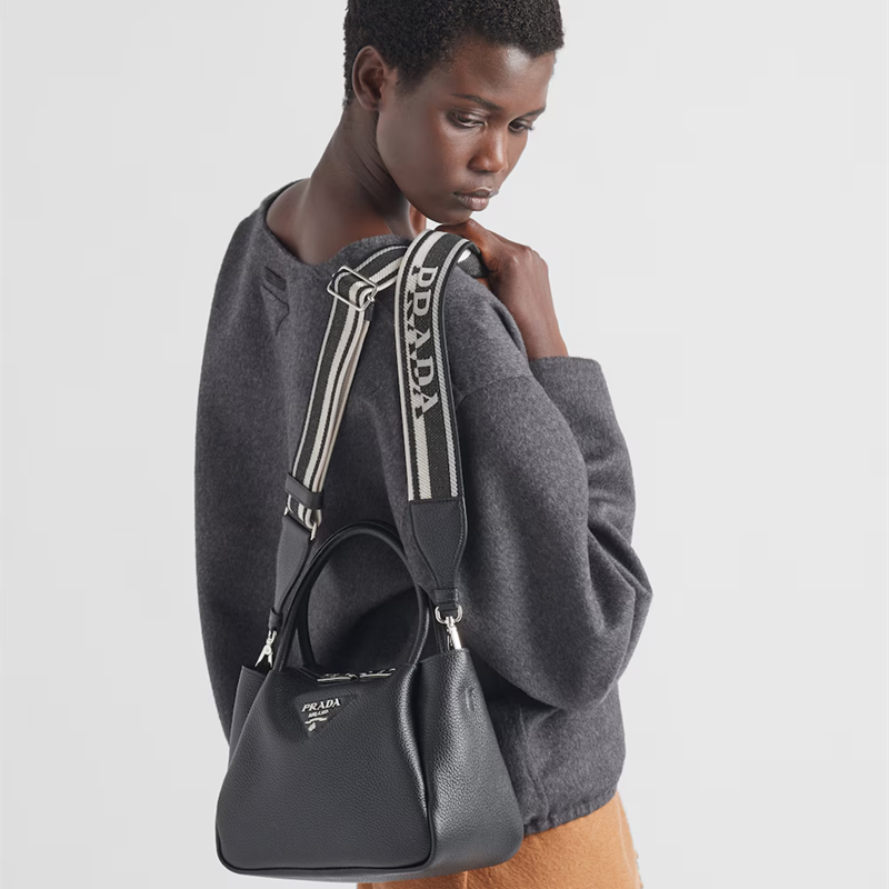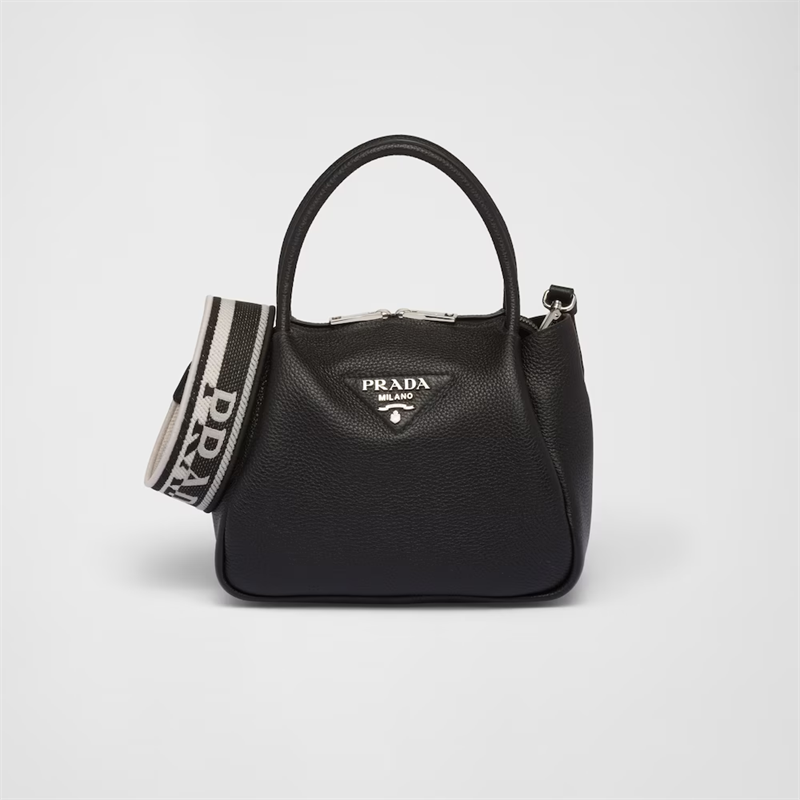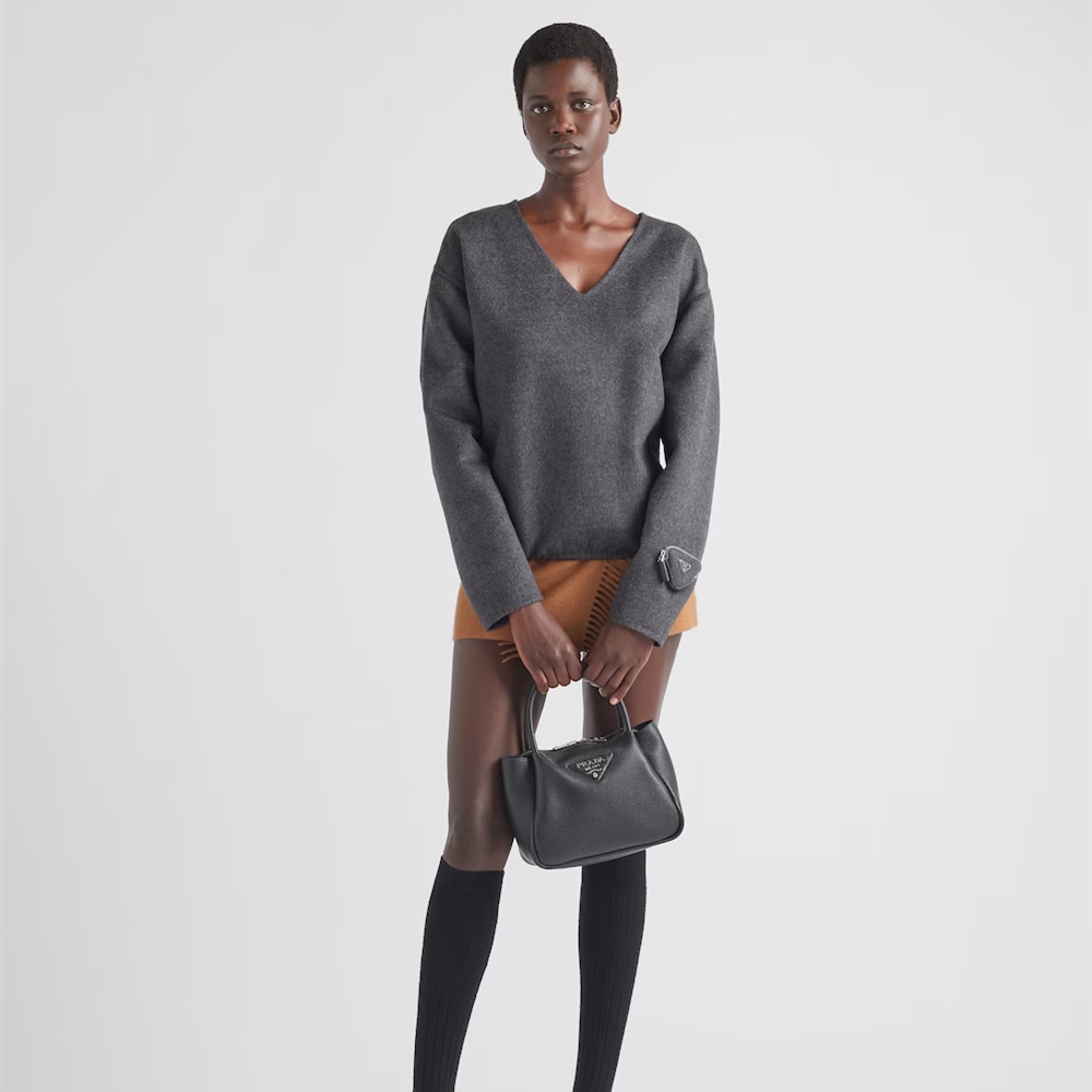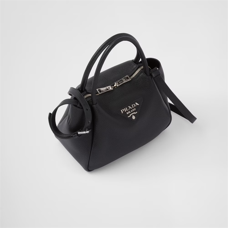 This small handbag is crafted from soft leather and is a clear expression of the brand's craftsmanship. The Prada metal lettering logo shines in the center of the stitched triangle, a new interpretation of the classic logo element. The inverted structure has a soft and rounded look, complemented by double handles and zip closure. The soft leather lining is matched with a main compartment and two pockets for functionality.