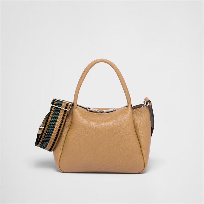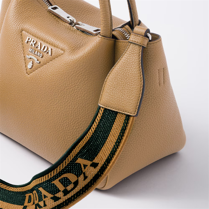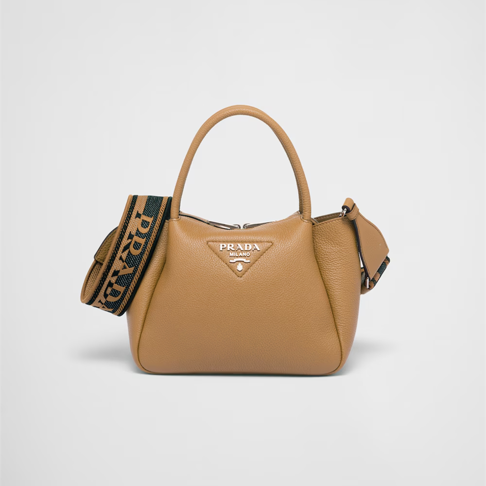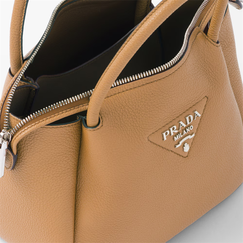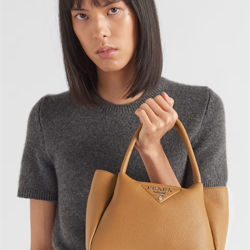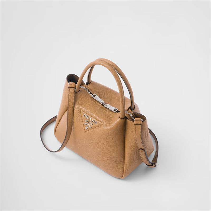 This small handbag is crafted from soft leather and is a clear expression of the brand's craftsmanship. The Prada metal lettering logo shines in the center of the stitched triangle, a new interpretation of the classic logo element. The inverted structure has a soft and rounded look, complemented by double handles and zip closure. The soft leather lining is matched with a main compartment and two pockets for functionality.