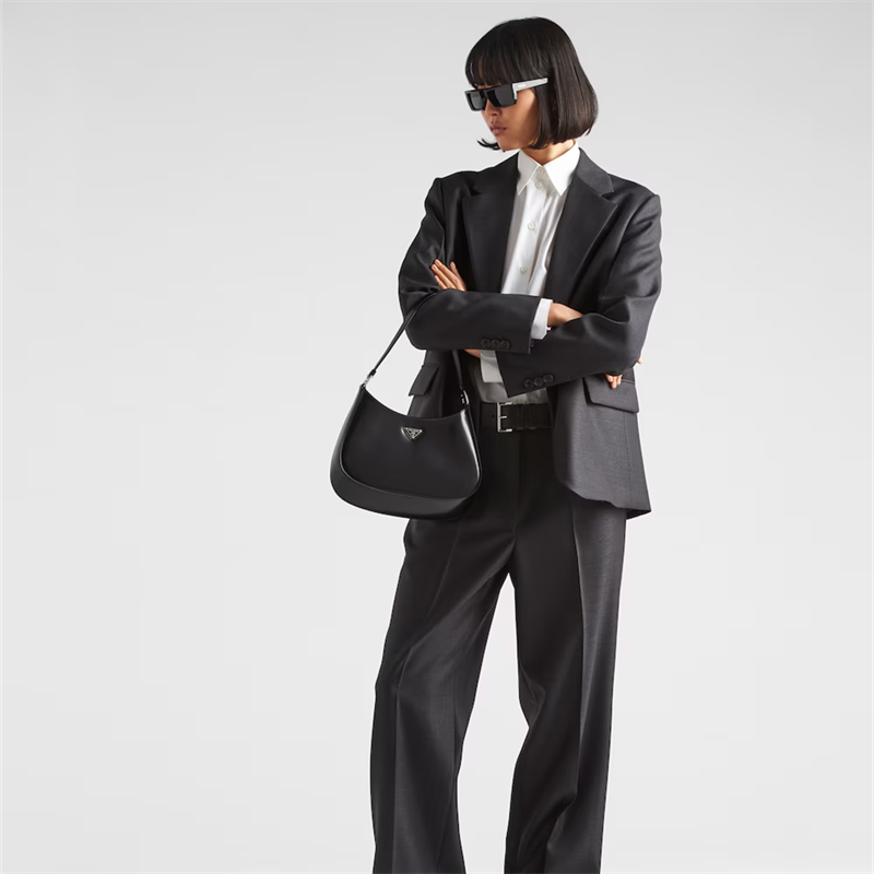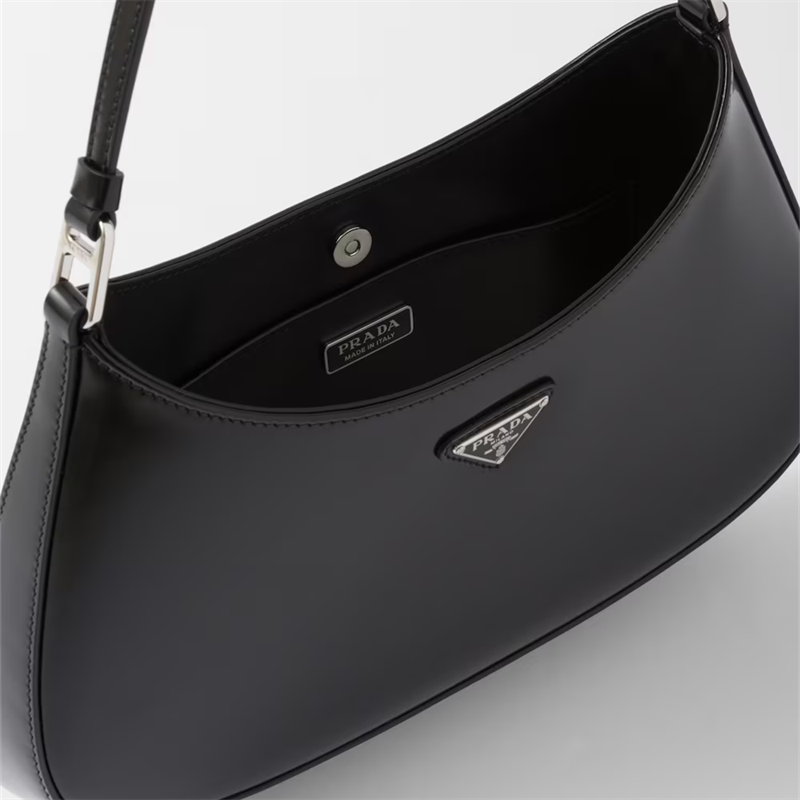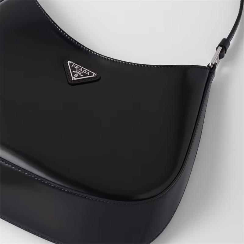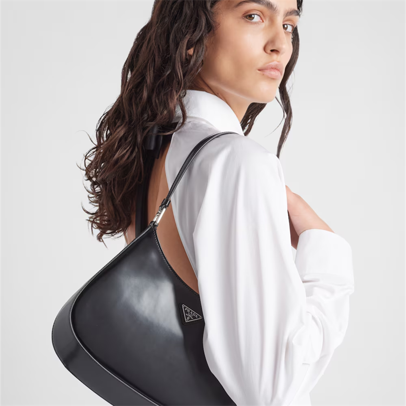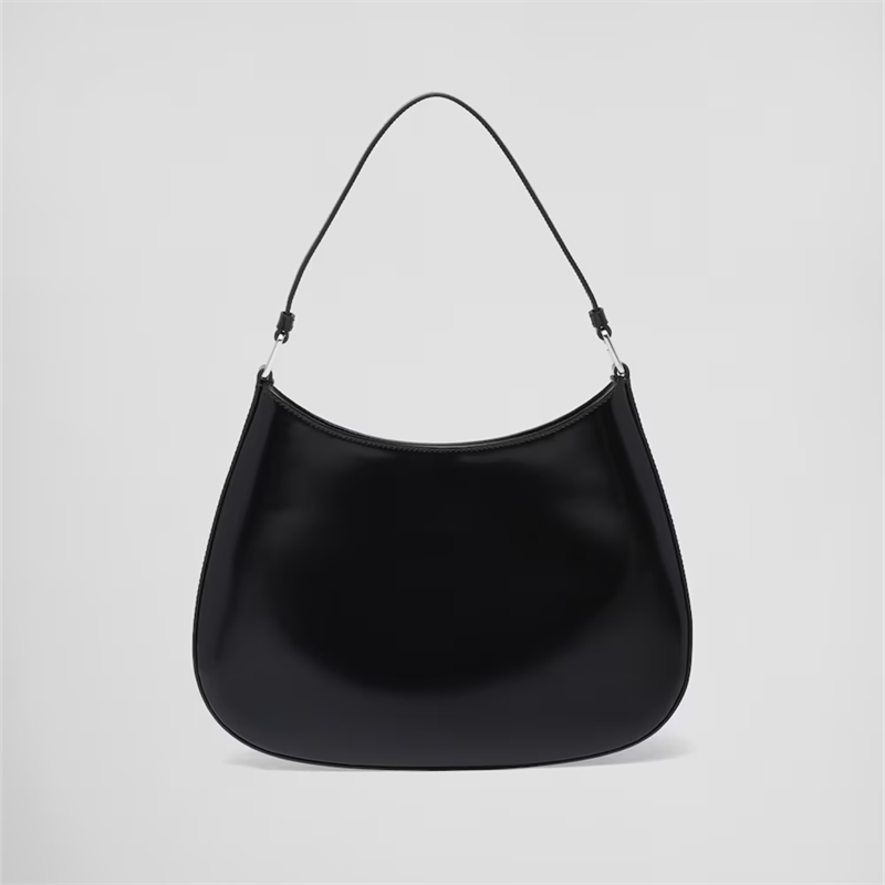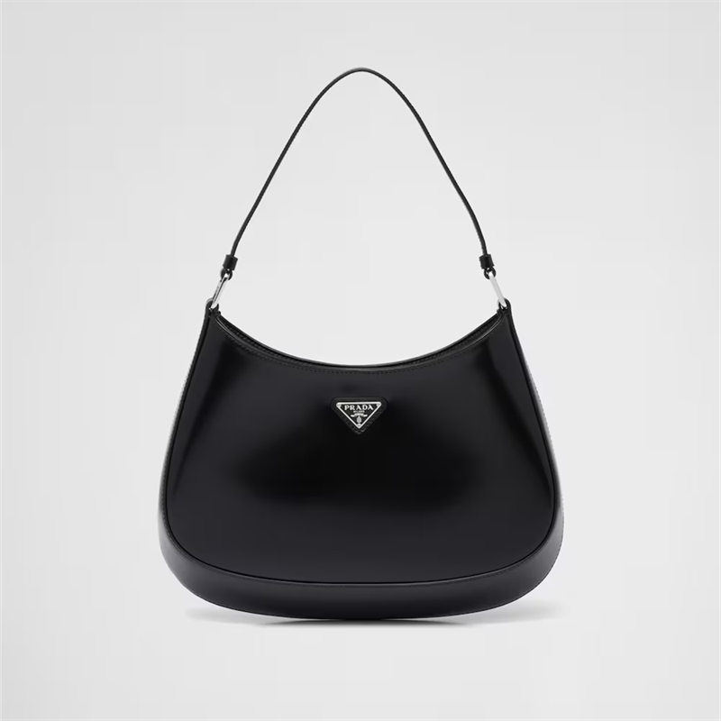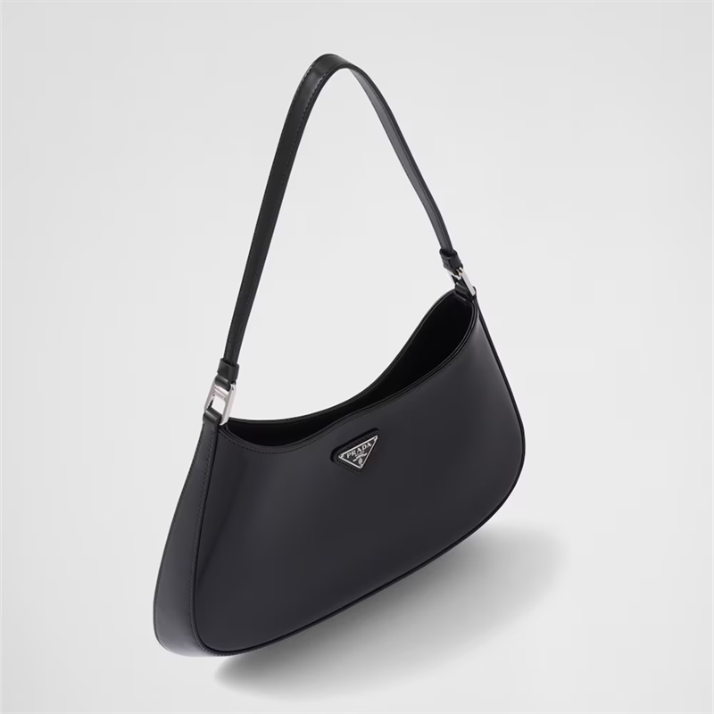 The Prada Cleo shoulder bag is a refined reinterpretation of the brand's iconic design from the 1990s. The shoulder bag is uniquely structured, with a rounded base and sides that accentuate simple curved lines, giving it a soft, lightweight look in the style of a crescent. The Prada collection's shiny leather material is modern and versatile, ideal for creating new combinations and contrasts. The enameled triangle logo adds a touch of brand style.