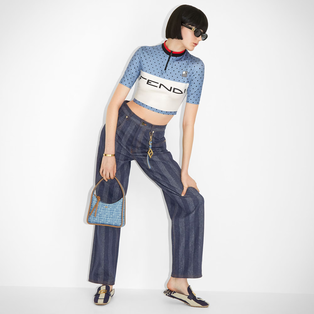 Fendessence mini crescent bag, compact and spacious, in imitation denim light blue fabric with FF motif. Decorated with beige leather. Zip closure with long knotted leather zipper pull. Lined compartment with metal FENDI lettering and gold-finished hardware. Can be carried by hand or under the arm.