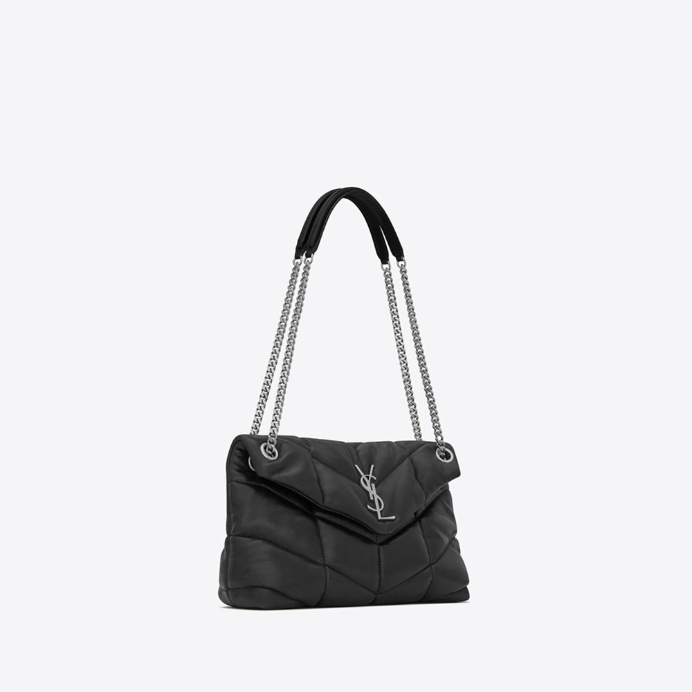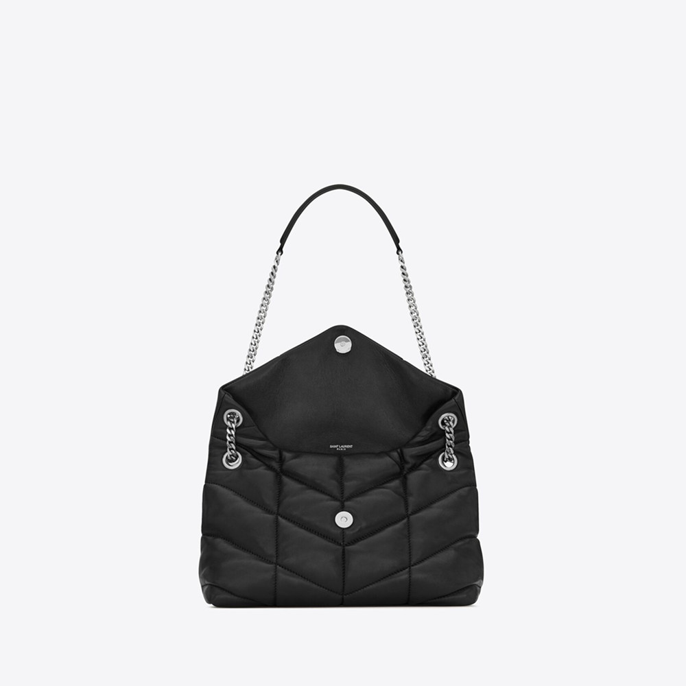 Envelope-style flap bag with soft V-quilted topstitching.