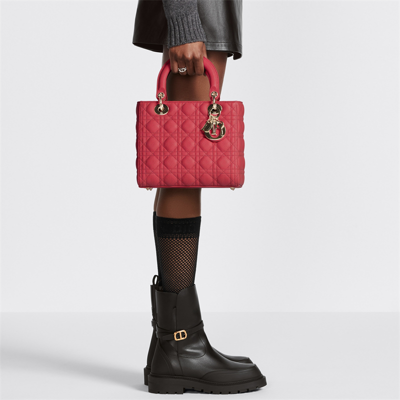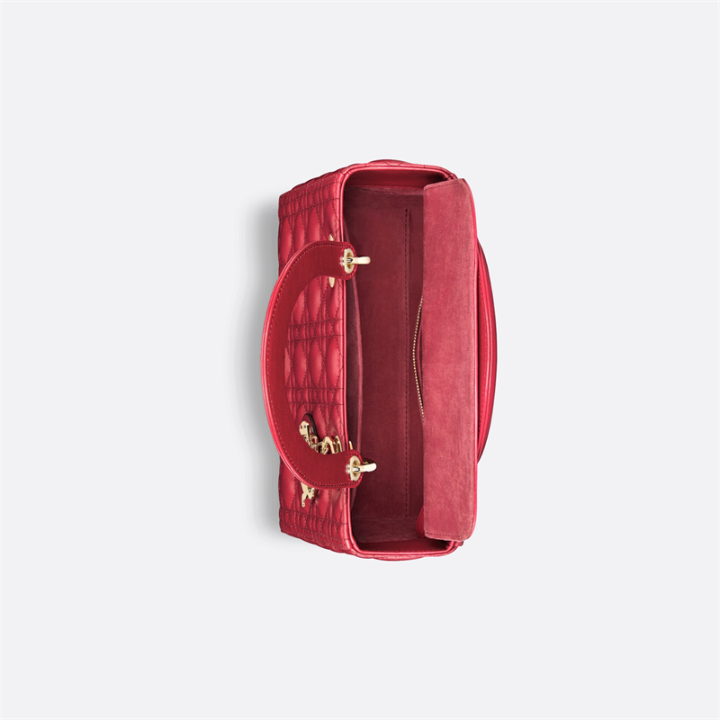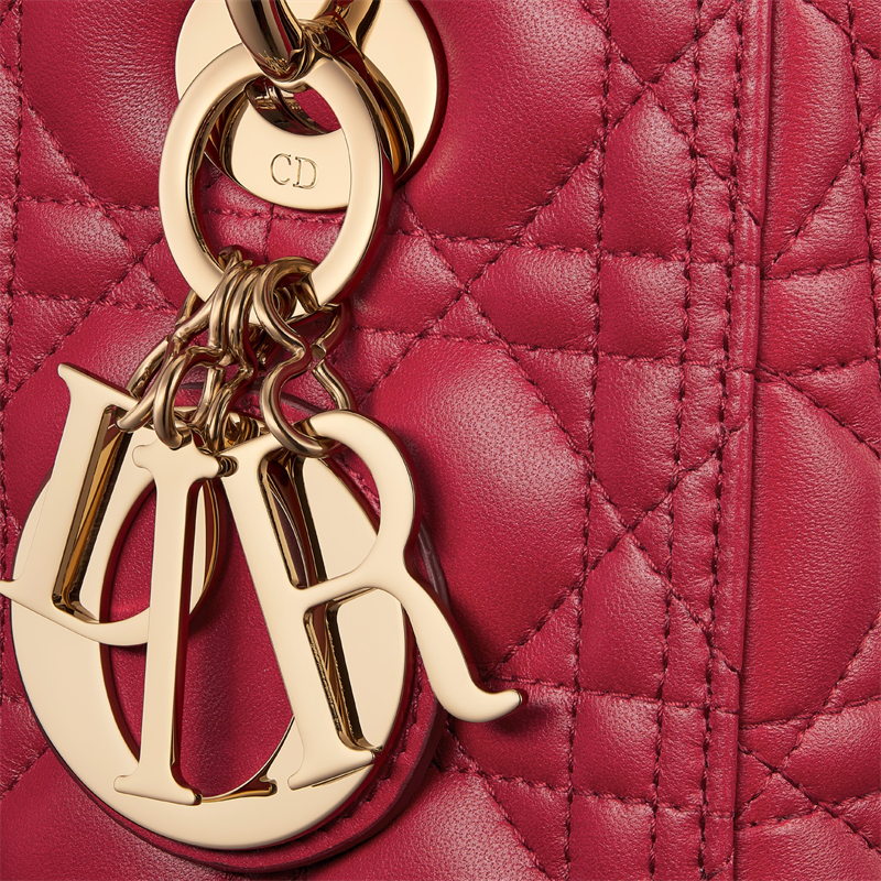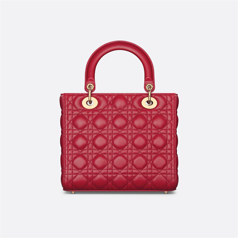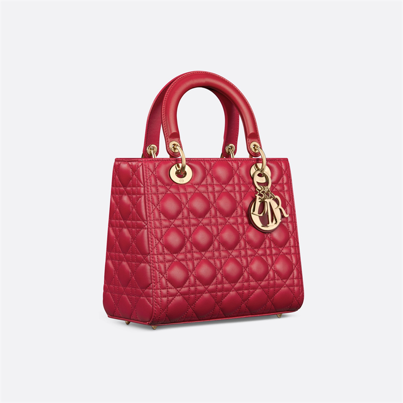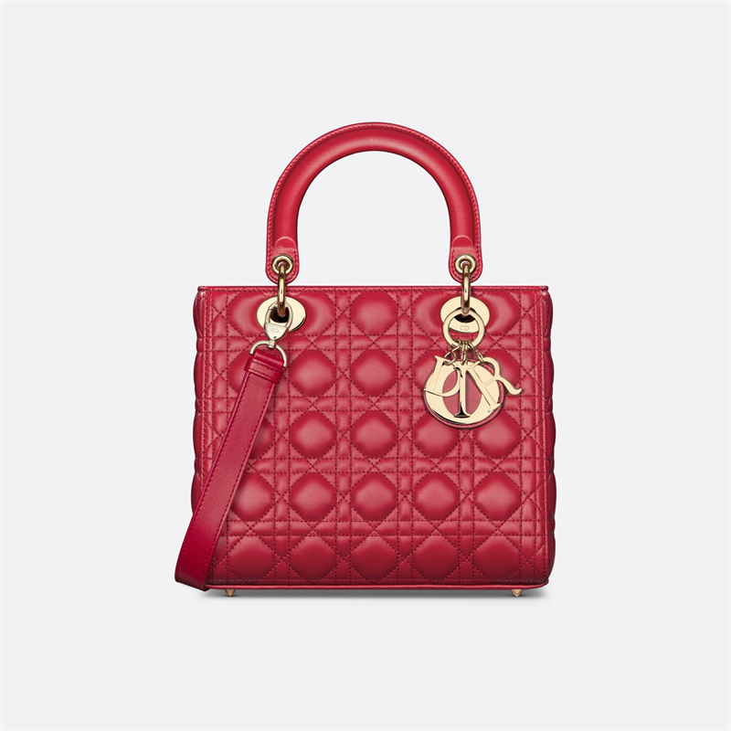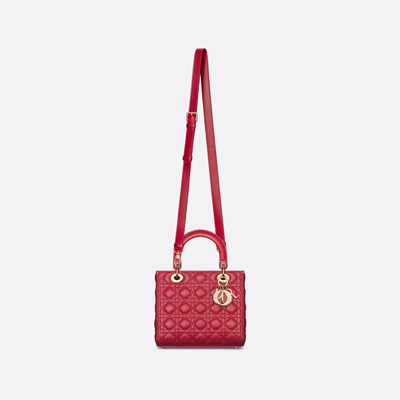 The Lady Dior bag epitomizes Dior's vision of elegance and beauty. Crafted from cherry red lambskin leather, it features eye-catching quilting details in cannage topstitching for a timeless, elegant design. The D.I.O.R. charm in light gold-finish metal adds an elegant touch. The medium model features a removable spaghetti leather strap for hand, shoulder or crossbody wear.