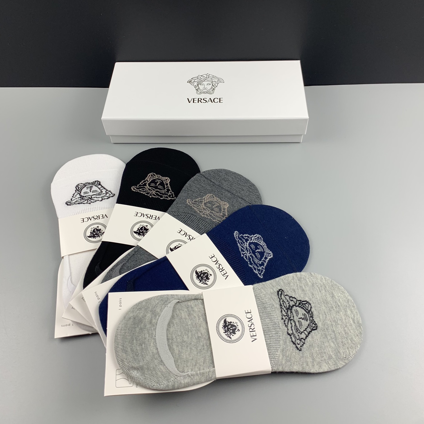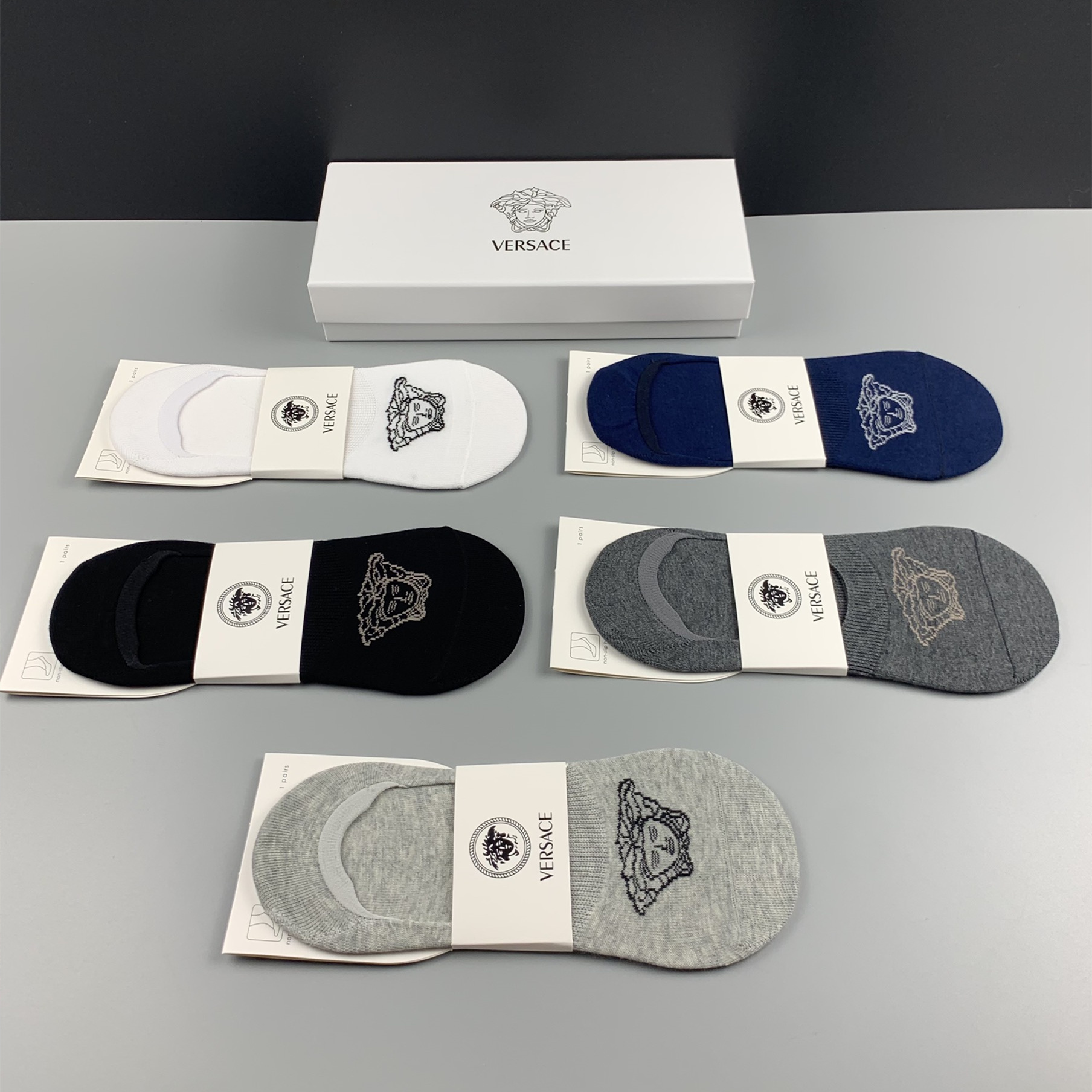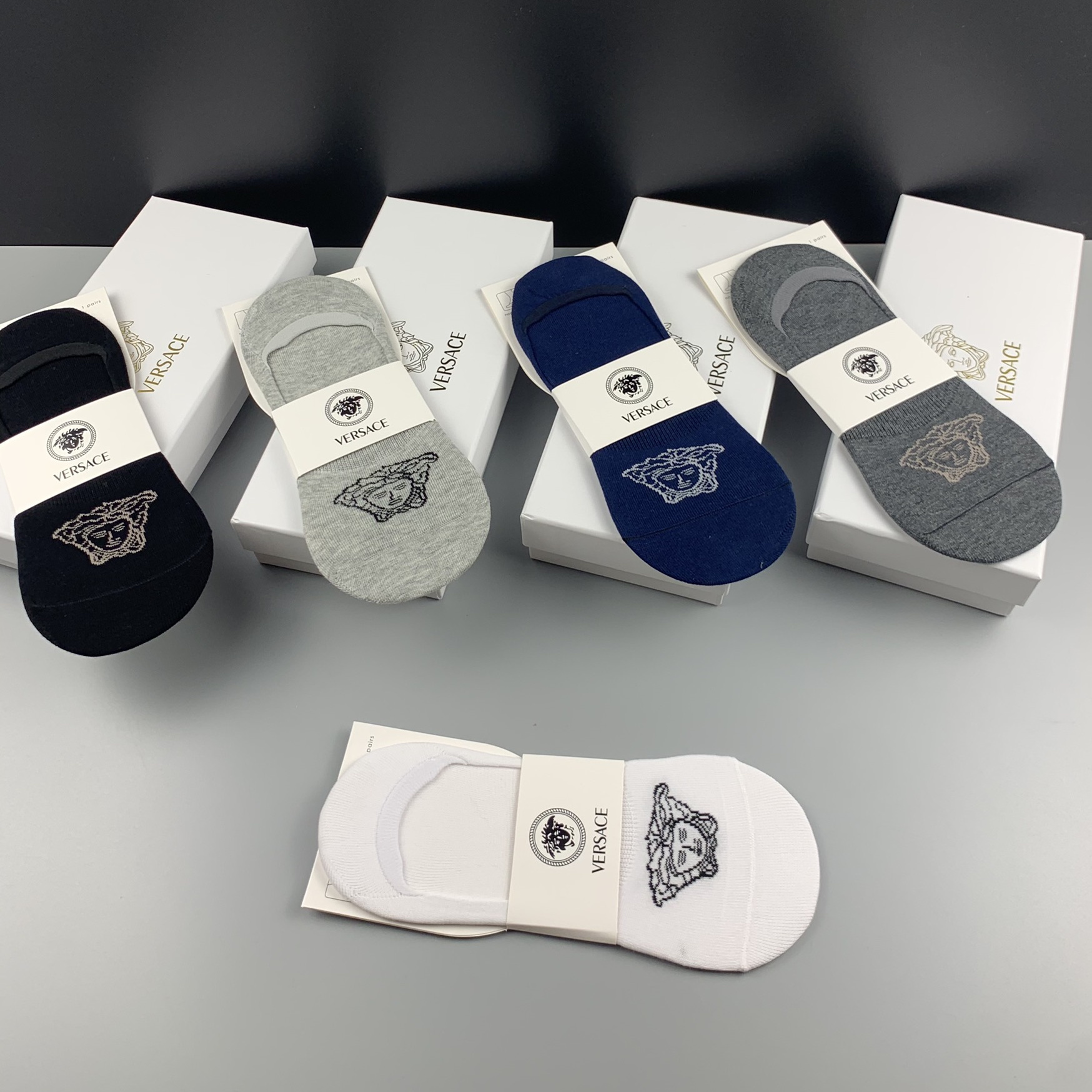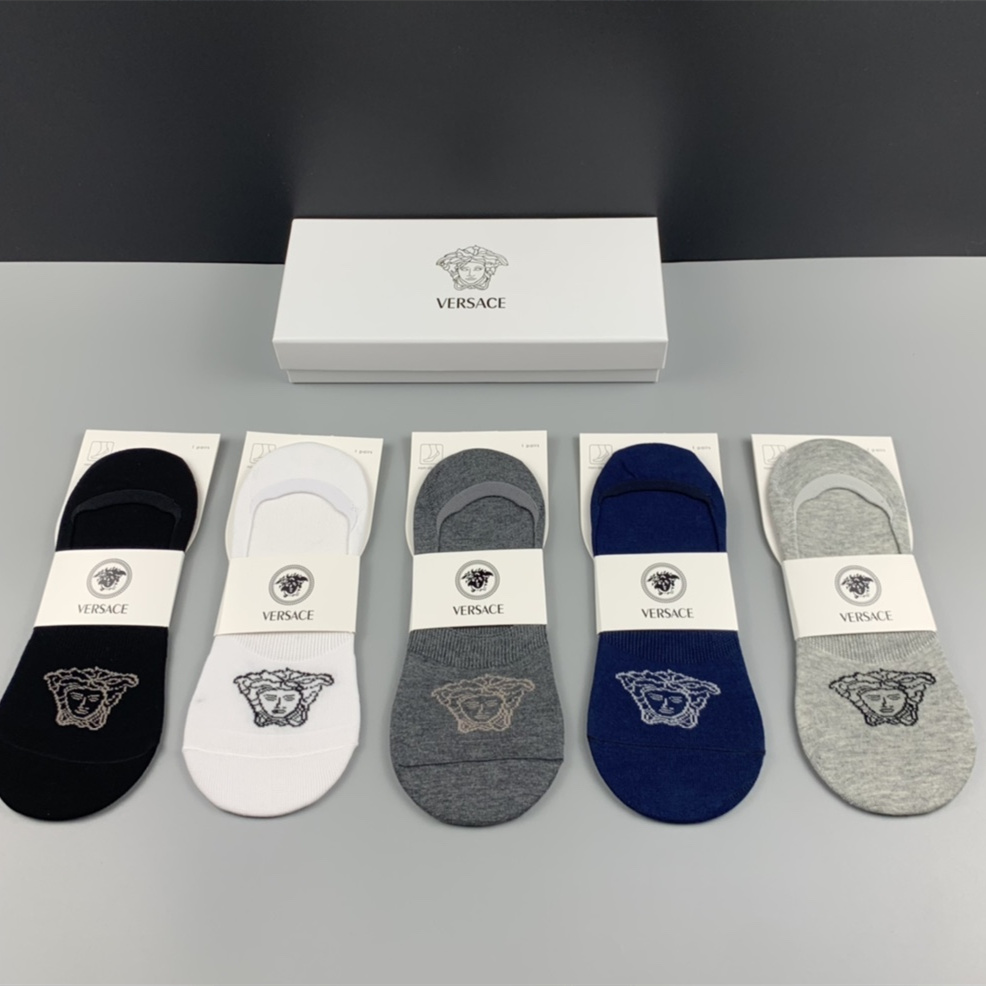 Get comfortable and breathable in these stylish no-show socks from Versace. Made in Italy from high-quality cotton, these no-show socks come in your choice of five colors. Ideal for casual and sporting occasions, they are machine washable and suitable for all seasons.