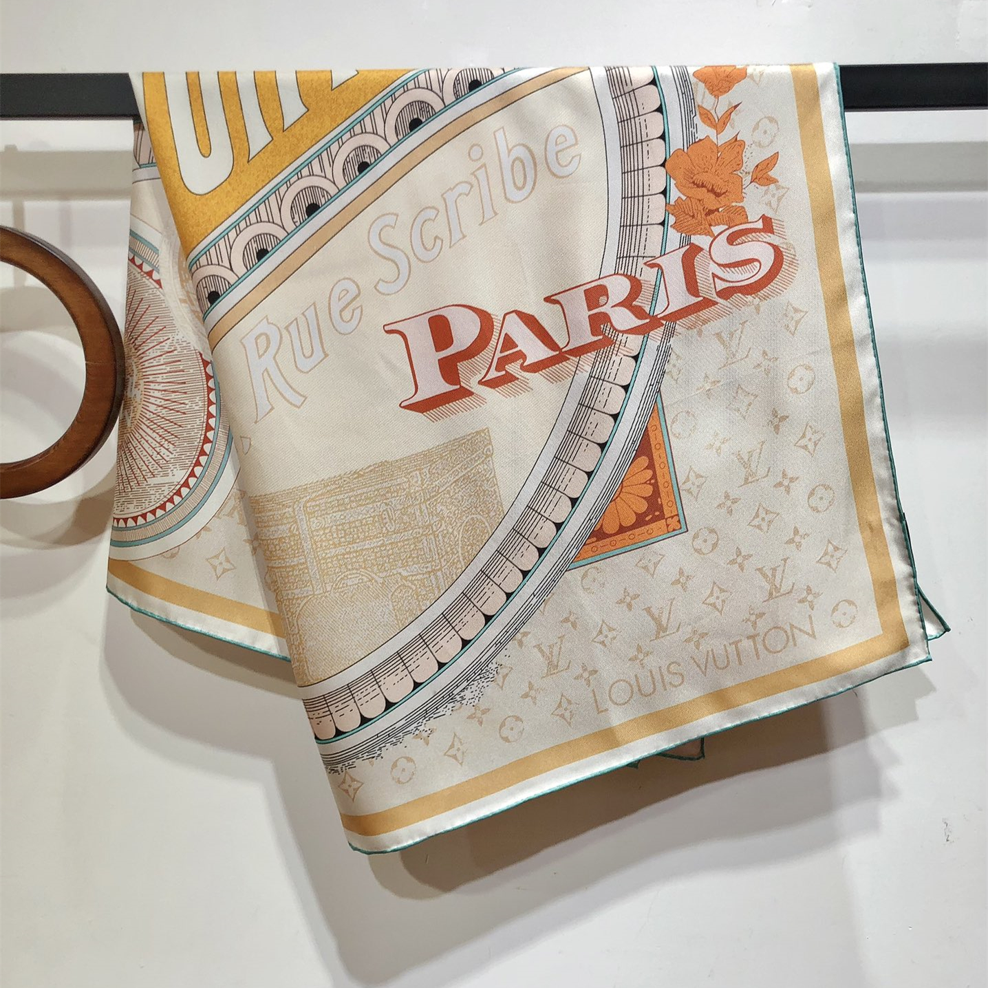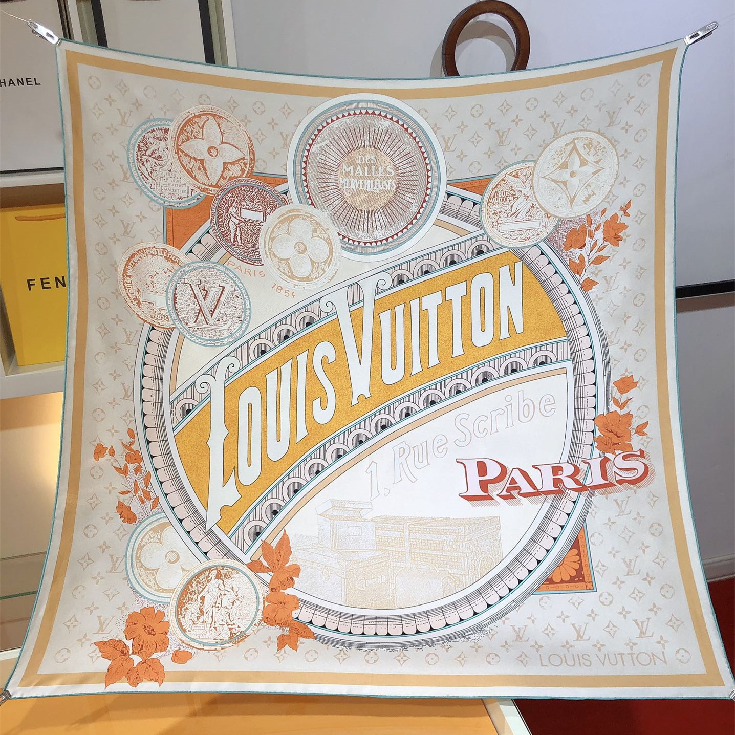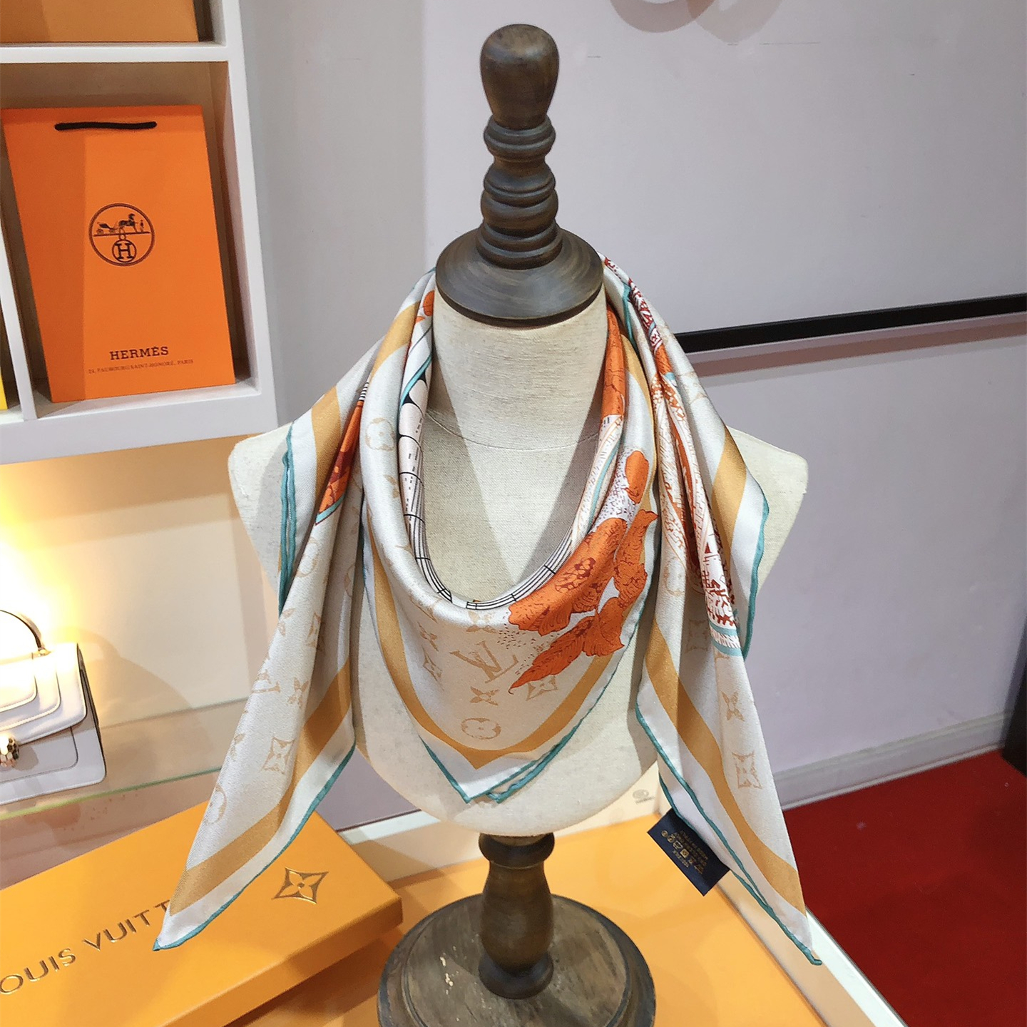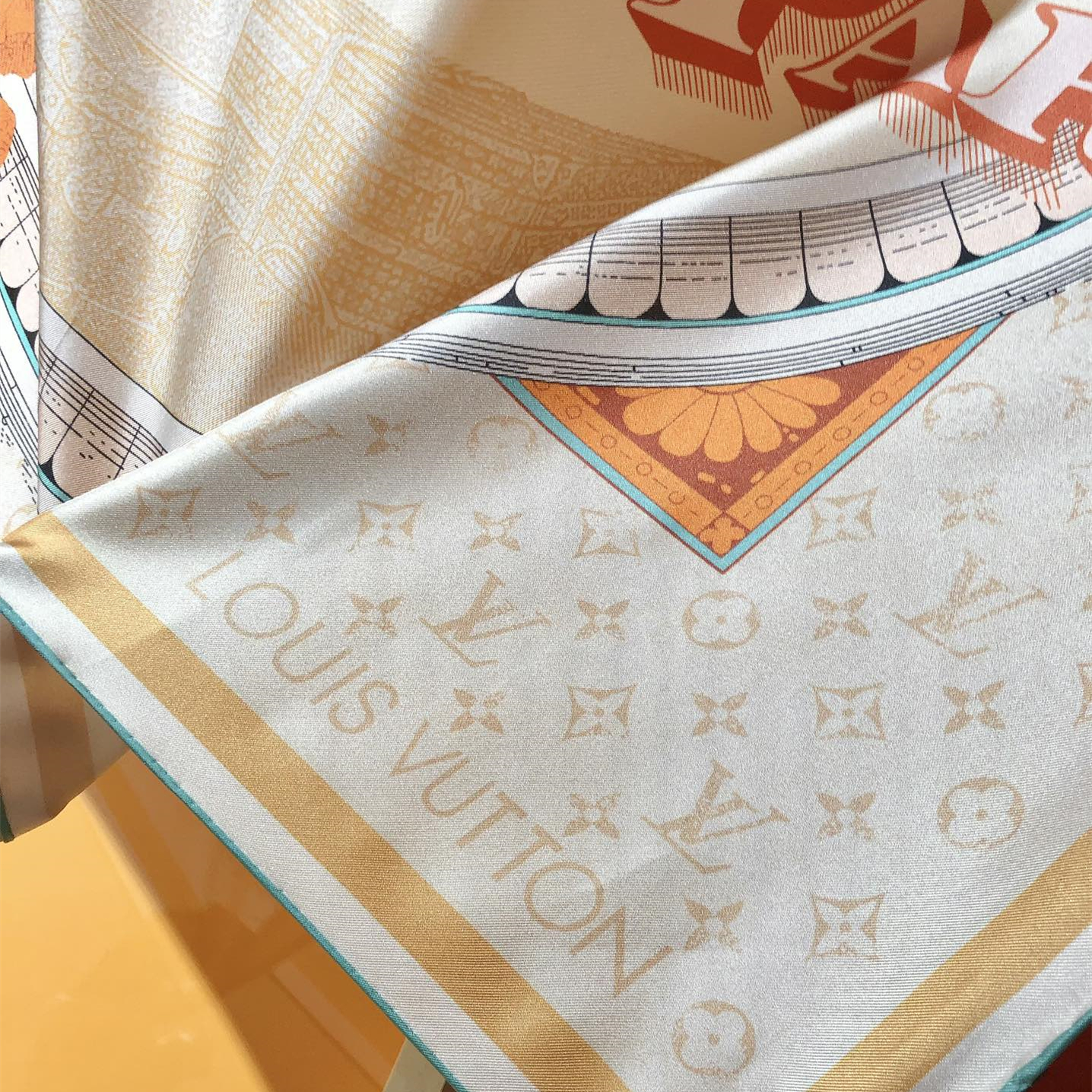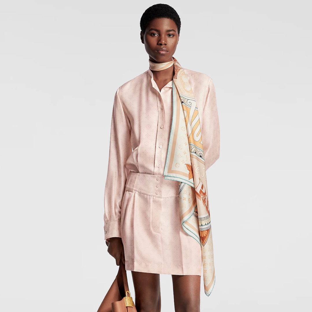 【Elegance and Craftsmanship】 This new LV scarf is a tribute to the brand's history, inspired by late 19th-century advertisement posters. It features a Monogram background with hard-case and travel sticker patterns.