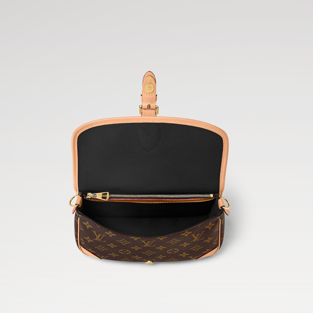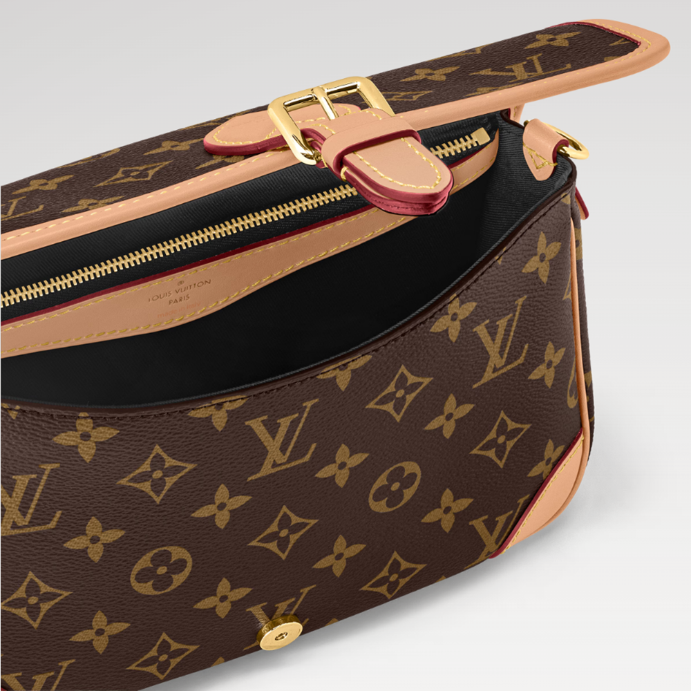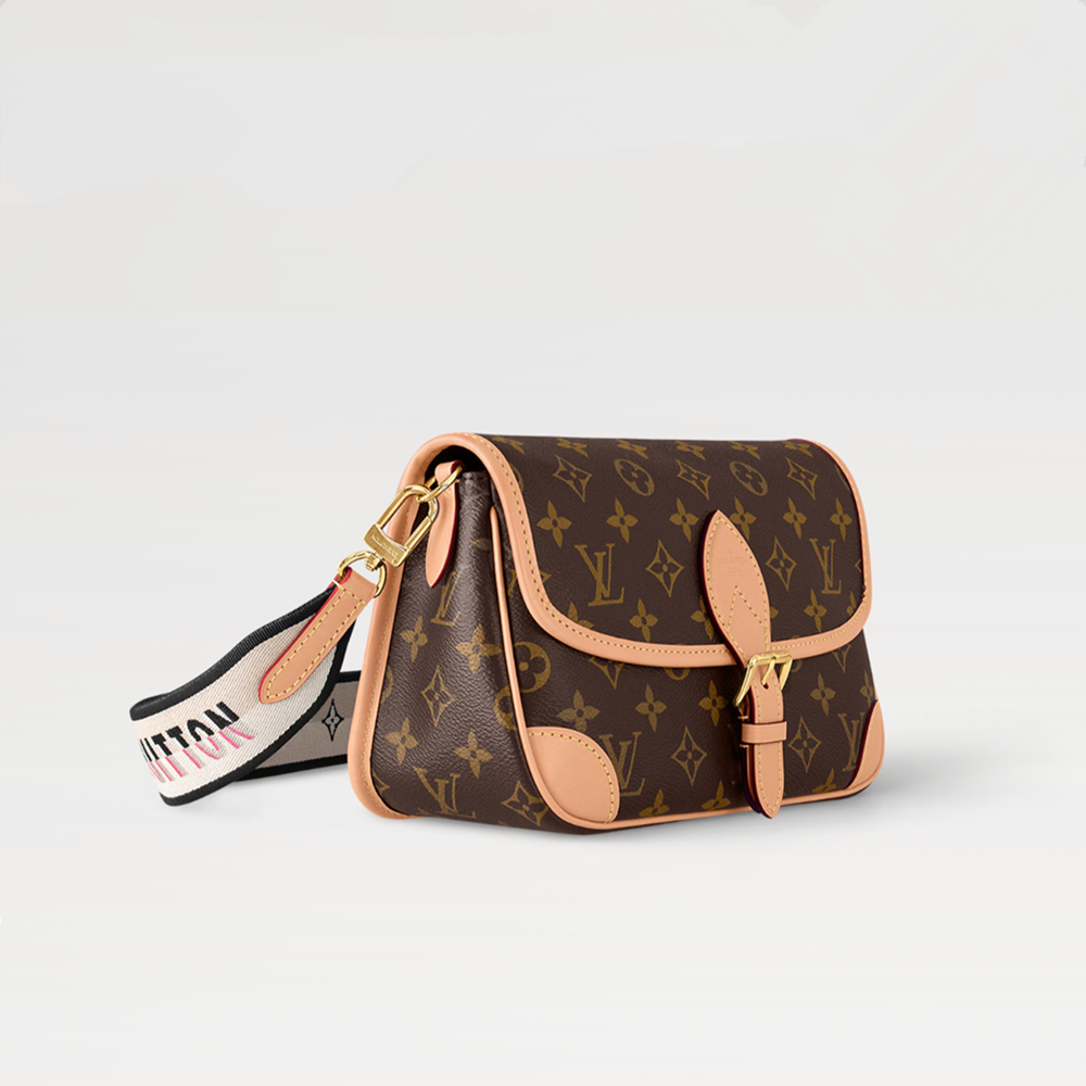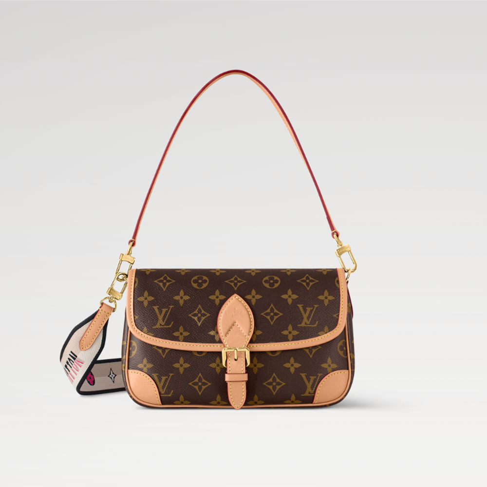 Reimagining a classic 1990s design, the Diane bag is made from Monogram canvas with vintage elements such as leather corners and traditional buckles, neat pockets and a neat interior. The wide jacquard shoulder strap features a striking Louis Vuitton logo and Monogram floral pattern on both sides.