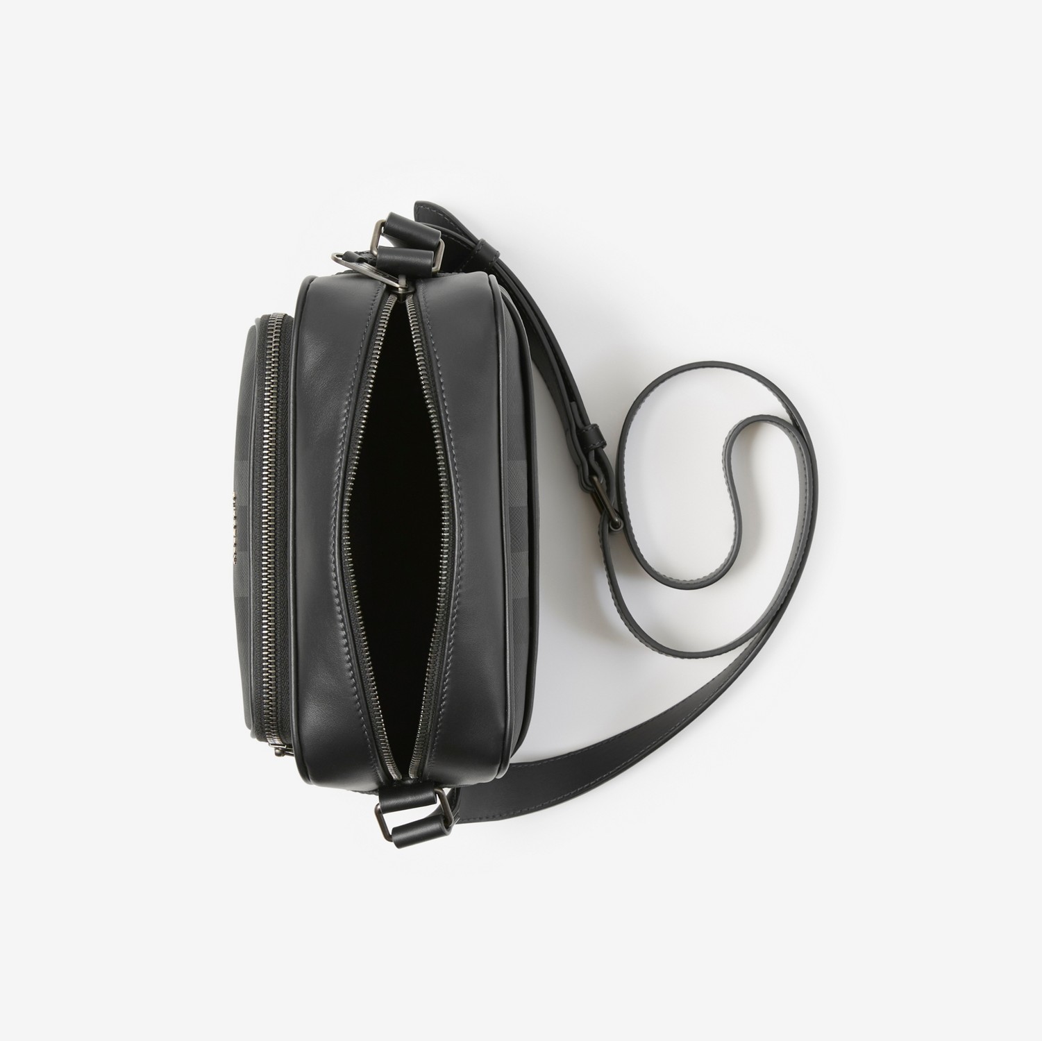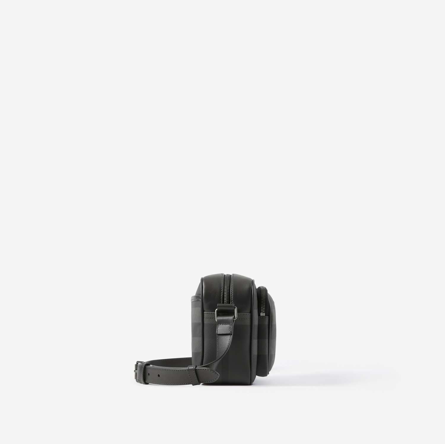Crossbody bag in fine Burberry check with solid lining. The compact design features smooth calfskin trims and an adjustable shoulder strap.